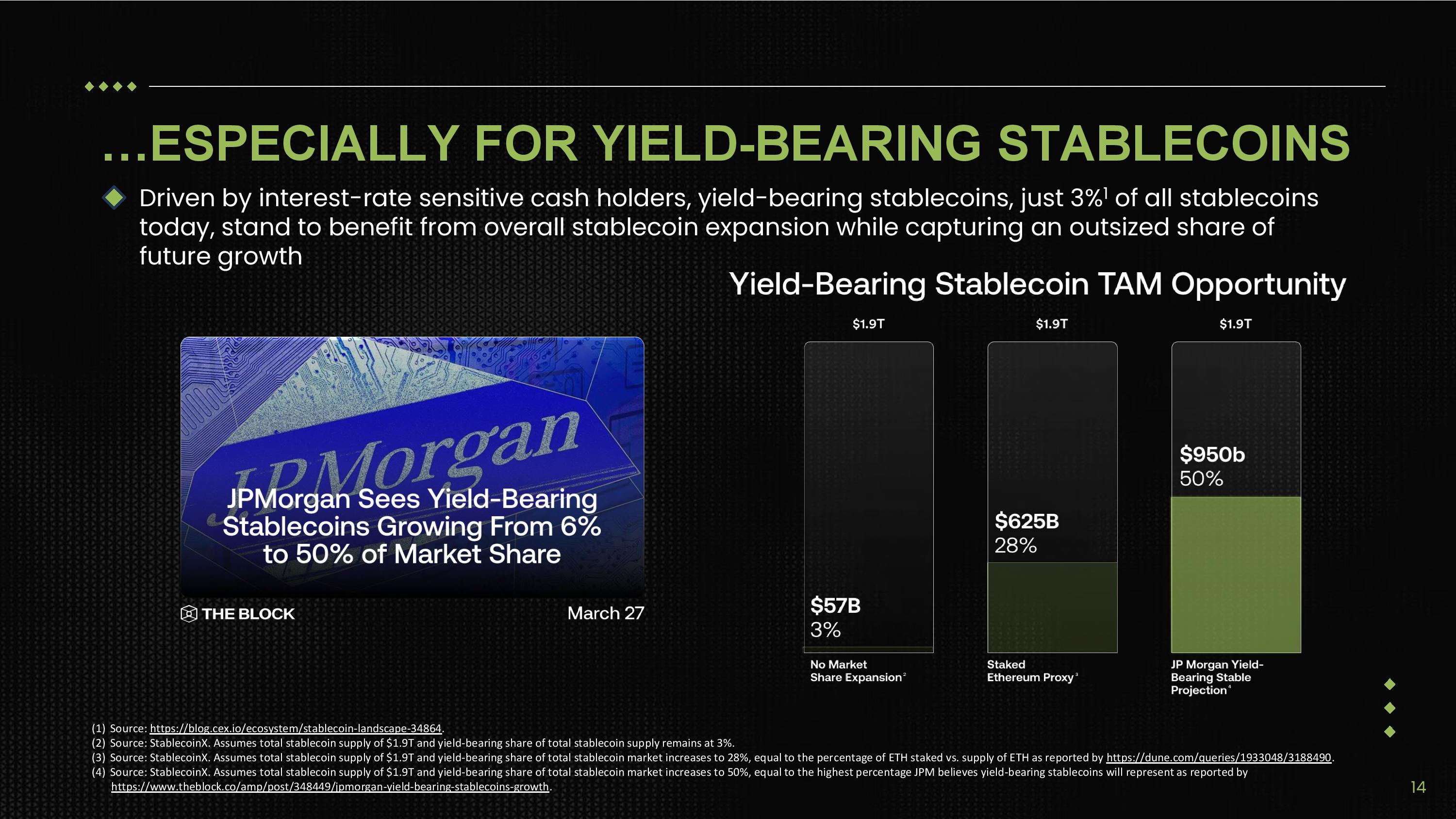 …ESPECIALLY FOR YIELD - BEARING STABLECOINS Driven by interest - rate sensitive cash holders, yield - bearing stablecoins, just 3% 1 of all stablecoins today, stand to benefit from overall stablecoin expansion while capturing an outsized share of future growth (1) Source: https://blog.cex.io/ecosystem/stablecoin - l andscape - 34864 . (2) Source: StablecoinX. Assumes total stablecoin supply of $1.9T and yield - bearing share of total stablecoin supply remains at 3%. (3) Source: StablecoinX. Assumes total stablecoin supply of $1.9T and yield - bearing share of total stablecoin market increases to 28%, equal to the percentage of ETH staked vs. supply of ETH as reported by https://dune.com/queries/1933048/3188490 . (4) Source: StablecoinX. Assumes total stablecoin supply of $1.9T and yield - bearing share of total stablecoin market increases to 50%, equal to the highest percentage JPM believes yield - bearing stablecoins will represent as reported by https://www.theblock.co/amp/post/348449/jpmorgan - yield - bearing - stablecoins - growth . 14