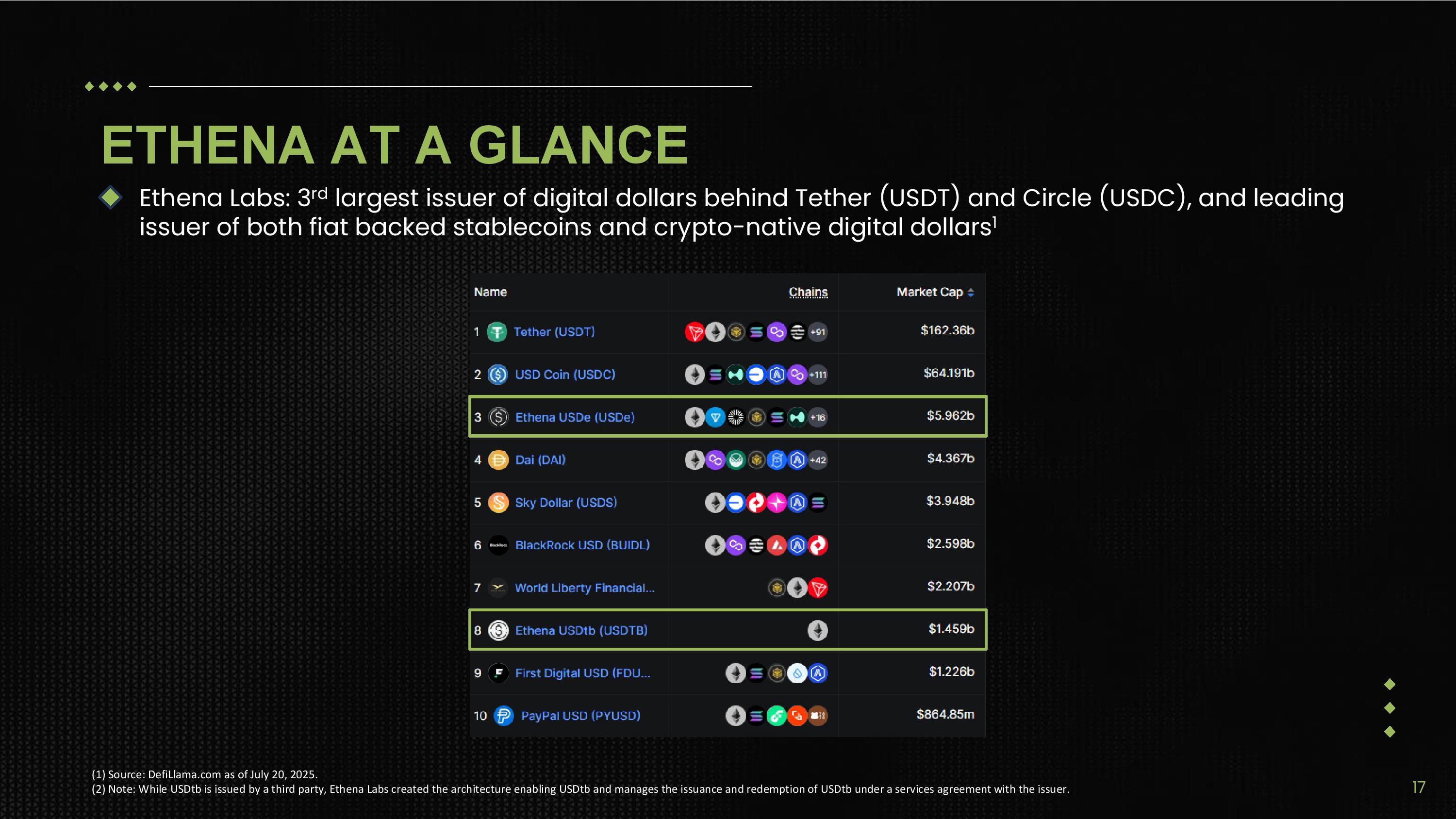 ETHENA SITS AT THE CORE OF STABLECOIN GROWTH STABLECOINS • Issuer of USDe, the 3 rd largest digital dollar after USDT & USDC 1 • Issuer of USDtb, the 8 th largest stablecoin backed by BlackRock’s BUIDL token 2 • Stablecoins expected to be a $1.9 trillion TAM by 2030 3 TOKENIZED ASSETS • Ethena and BlackRock - backed tokenization partner, Securitize, to launch blockchain for digital dollars and other tokenized assets (1) Source: DefiLlama.com as of July 20, 2025. (2) Source: https://cryptoslate.com/blackrocks - buid l - nears - 3b - registers - 3x - increase - in - less - than - 90 - days/ . (3) Source: StablecoinX based on average of BCG, Citi, ParaFi, Standard Chartered, and Ark Invest 2030 stablecoin supply predictions of $2.4T, $1.6T, $2.1%, $2.0T (2028), and $1.4T respectively. “Every stock, every bond, every fund — every asset — can be tokenized” Larry Fink, CEO of BlackRock 16
