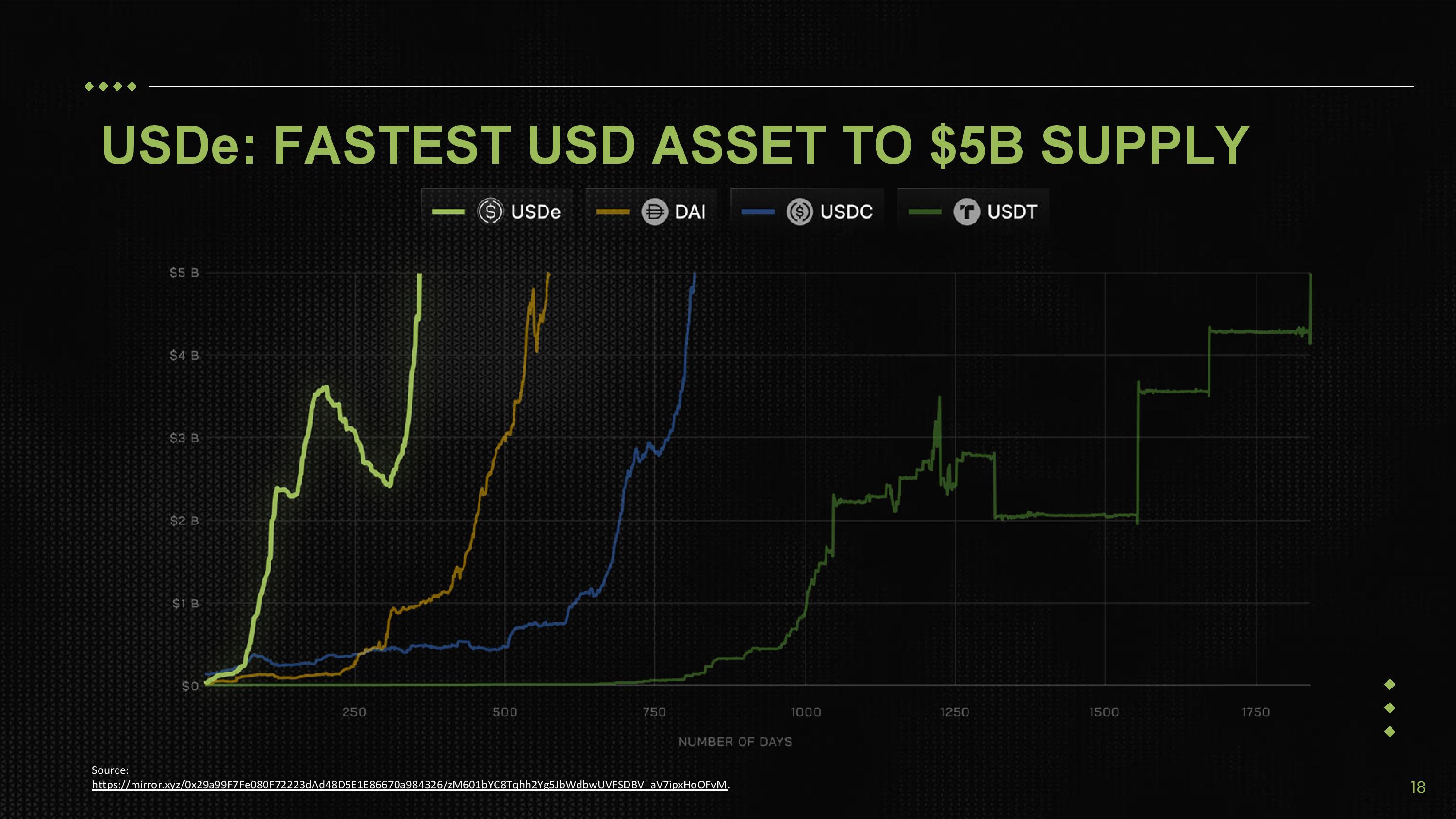 USDe: FASTEST USD ASSET TO $5B SUPPLY Source: https://mirror.xyz/0x29a99F7Fe080F72223dAd48D5E1E86670a984326/zM601bYC8Tqhh2Yg5JbWdbwUVFSDBV_aV7ipxHoOFvM . 18
