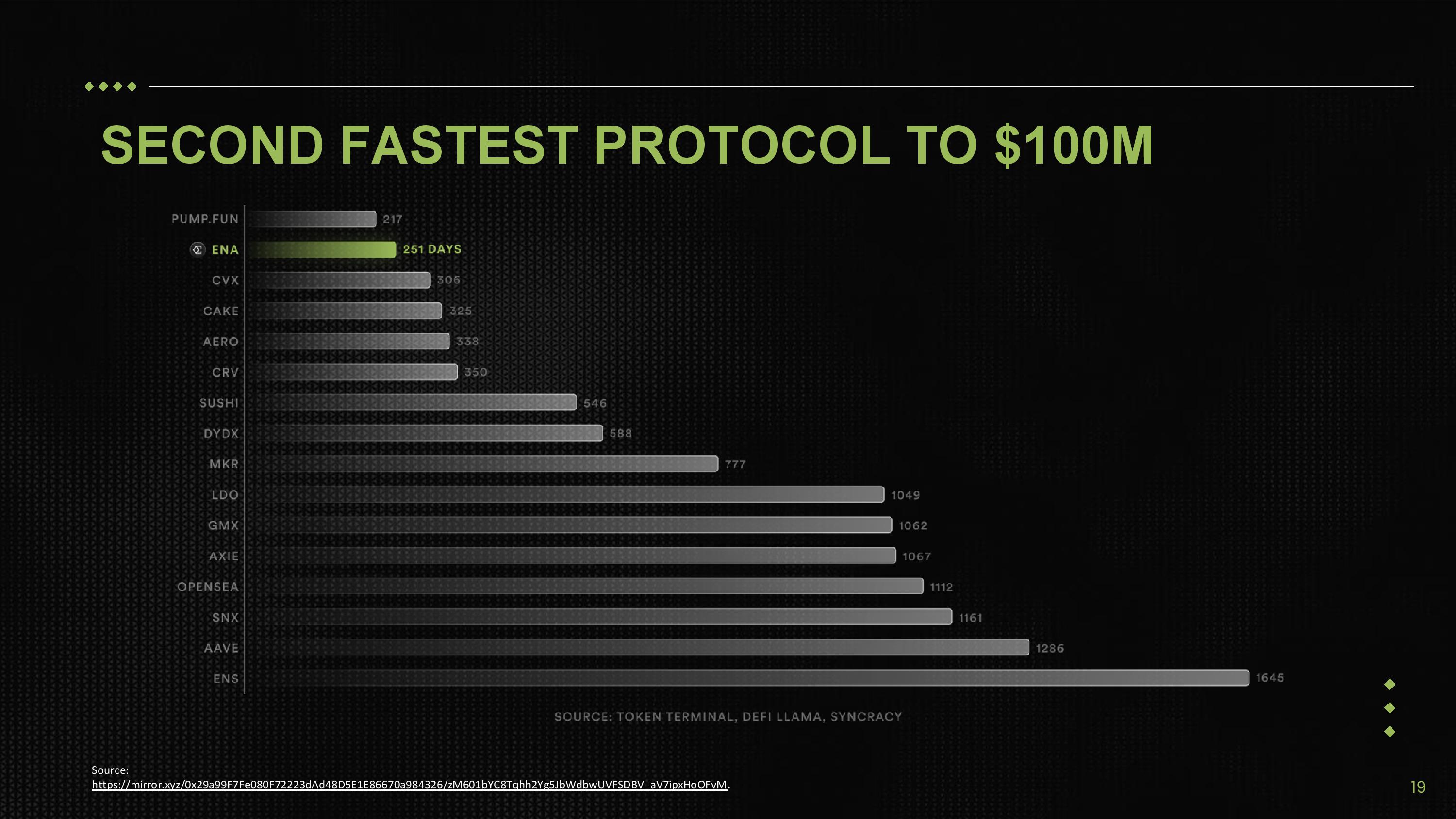 SECOND FASTEST PROTOCOL TO $100M Source: https://mirror.xyz/0x29a99F7Fe080F72223dAd48D5E1E86670a984326/zM601bYC8Tqhh2Yg5JbWdbwUVFSDBV_aV7ipxHoOFvM . 19