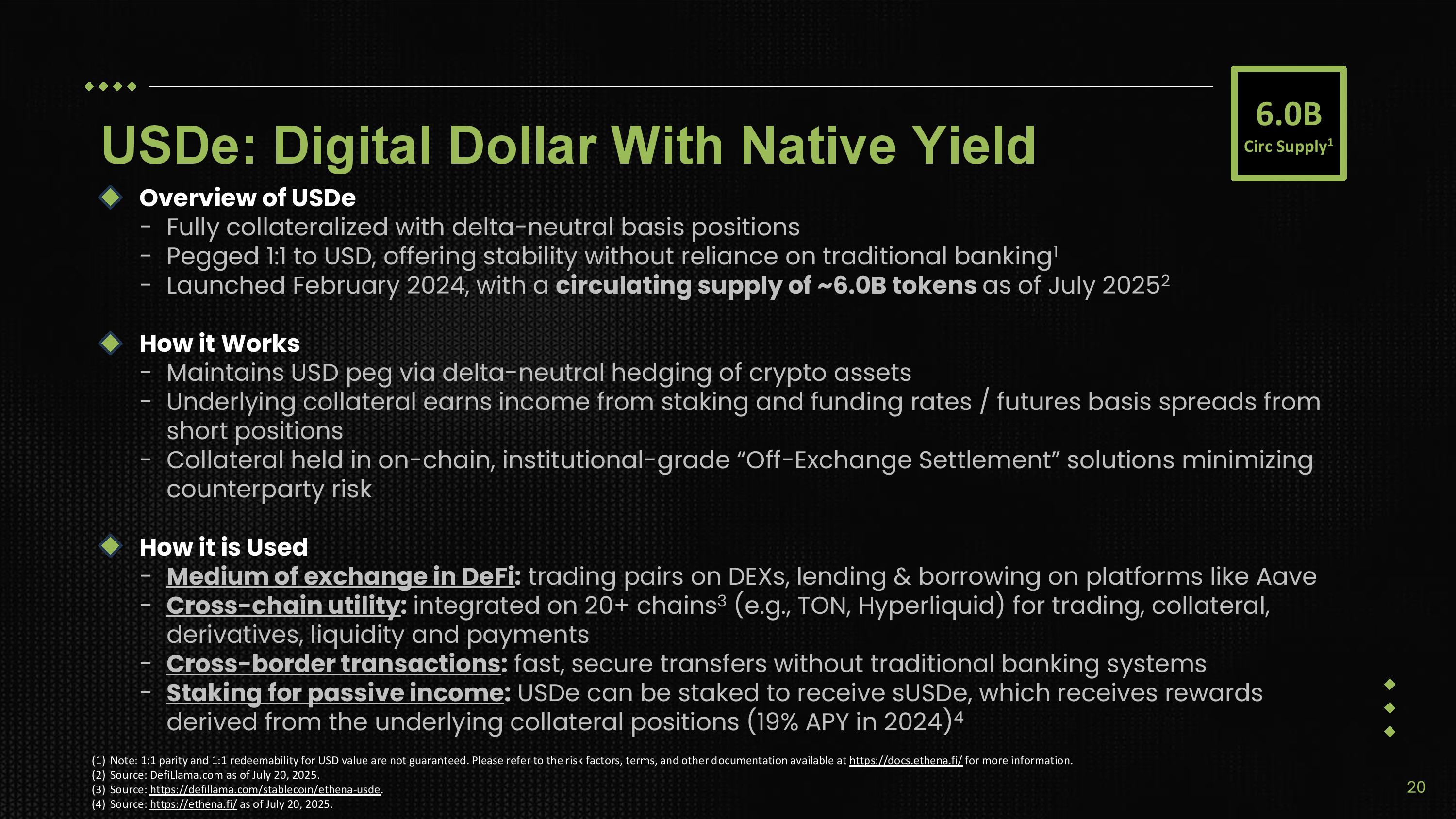 USDe: Digital Dollar With Native Yield Overview of USDe - Fully collateralized with delta - neutral basis positions - Pegged 1:1 to USD, offering stability without reliance on traditional banking 1 - Launched February 2024, with a circulating supply of ~6.0B tokens as of July 2025 2 How it Works - Maintains USD peg via delta - neutral hedging of crypto assets - Underlying collateral earns income from staking and funding rates / futures basis spreads from short positions - Collateral held in on - chain, institutional - grade “Off - Exchange Settlement” solutions minimizing counterparty risk How it is Used - Medium of exchange in DeFi : trading pairs on DEXs, lending & borrowing on platforms like Aave - Cross - chain utility : integrated on 20+ chains 3 (e.g., TON, Hyperliquid) for trading, collateral, derivatives, liquidity and payments - Cross - border transactions : fast, secure transfers without traditional banking systems - Staking for passive income : USDe can be staked to receive sUSDe, which receives rewards derived from the underlying collateral positions (19% APY in 2024) 4 (1) Note: 1:1 parity and 1:1 redeemability for USD value are not guaranteed. Please refer to the risk factors, terms, and other documentation available at https://docs.ethena.fi/ for more information. (2) Source: DefiLlama.com as of July 20, 2025. (3) Source: https://defillama.com/stablecoin/ethena - usde . (4) Source: https://ethena.fi/ as of July 20, 2025. 6.0B Circ Supply 1 20