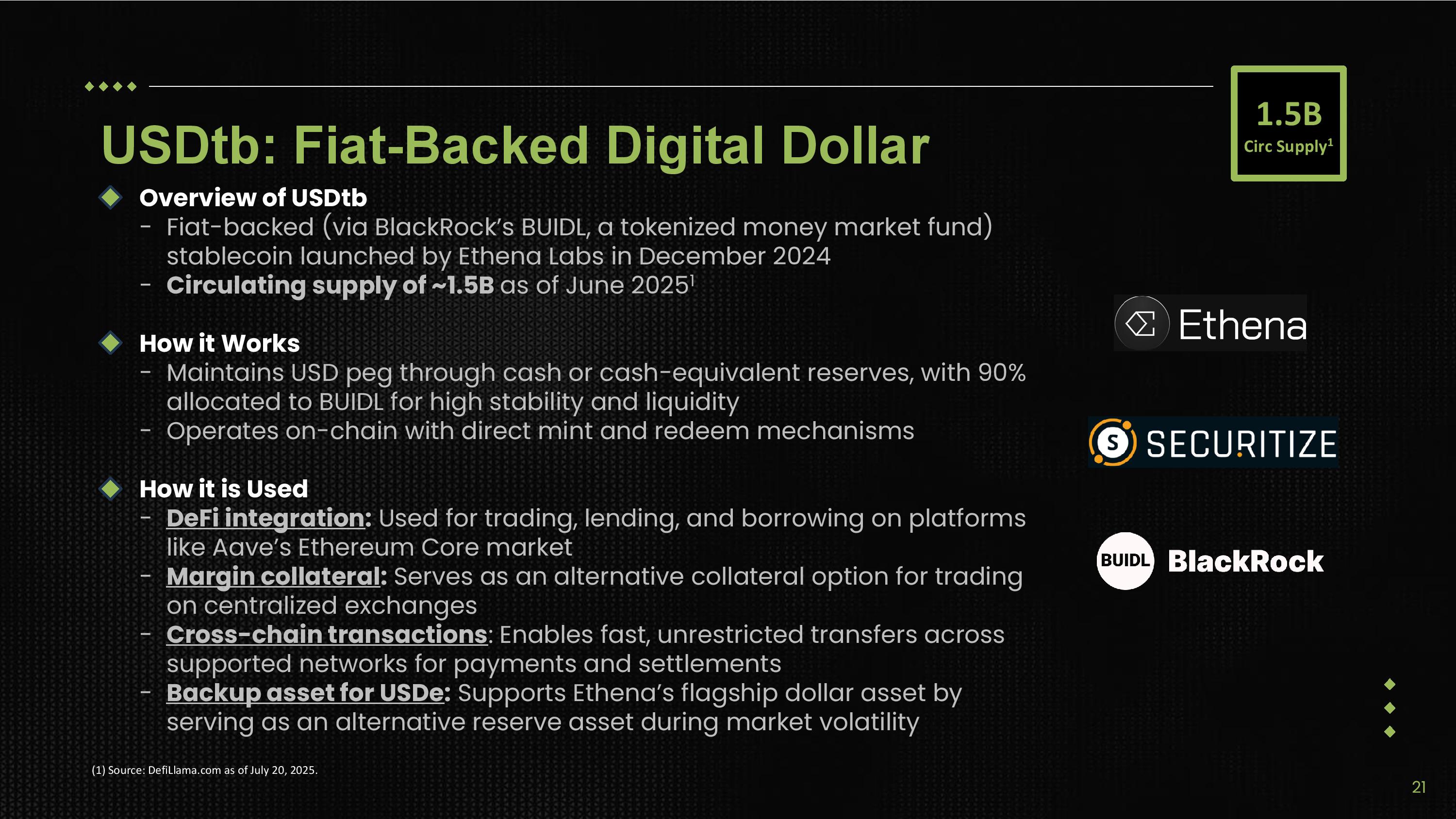 USDtb: Fiat - Backed Digital Dollar Overview of USDtb - Fiat - backed (via BlackRock’s BUIDL, a tokenized money market fund) stablecoin launched by Ethena Labs in December 2024 - Circulating supply of ~1.5B as of June 2025 1 How it Works - Maintains USD peg through cash or cash - equivalent reserves, with 90% allocated to BUIDL for high stability and liquidity - Operates on - chain with direct mint and redeem mechanisms How it is Used - DeFi integration : Used for trading, lending, and borrowing on platforms like Aave’s Ethereum Core market - Margin collateral : Serves as an alternative collateral option for trading on centralized exchanges - Cross - chain transactions : Enables fast, unrestricted transfers across supported networks for payments and settlements - Backup asset for USDe : Supports Ethena’s flagship dollar asset by serving as an alternative reserve asset during market volatility (1) Source: DefiLlama.com as of July 20, 2025. 1.5B Circ Supply 1 21