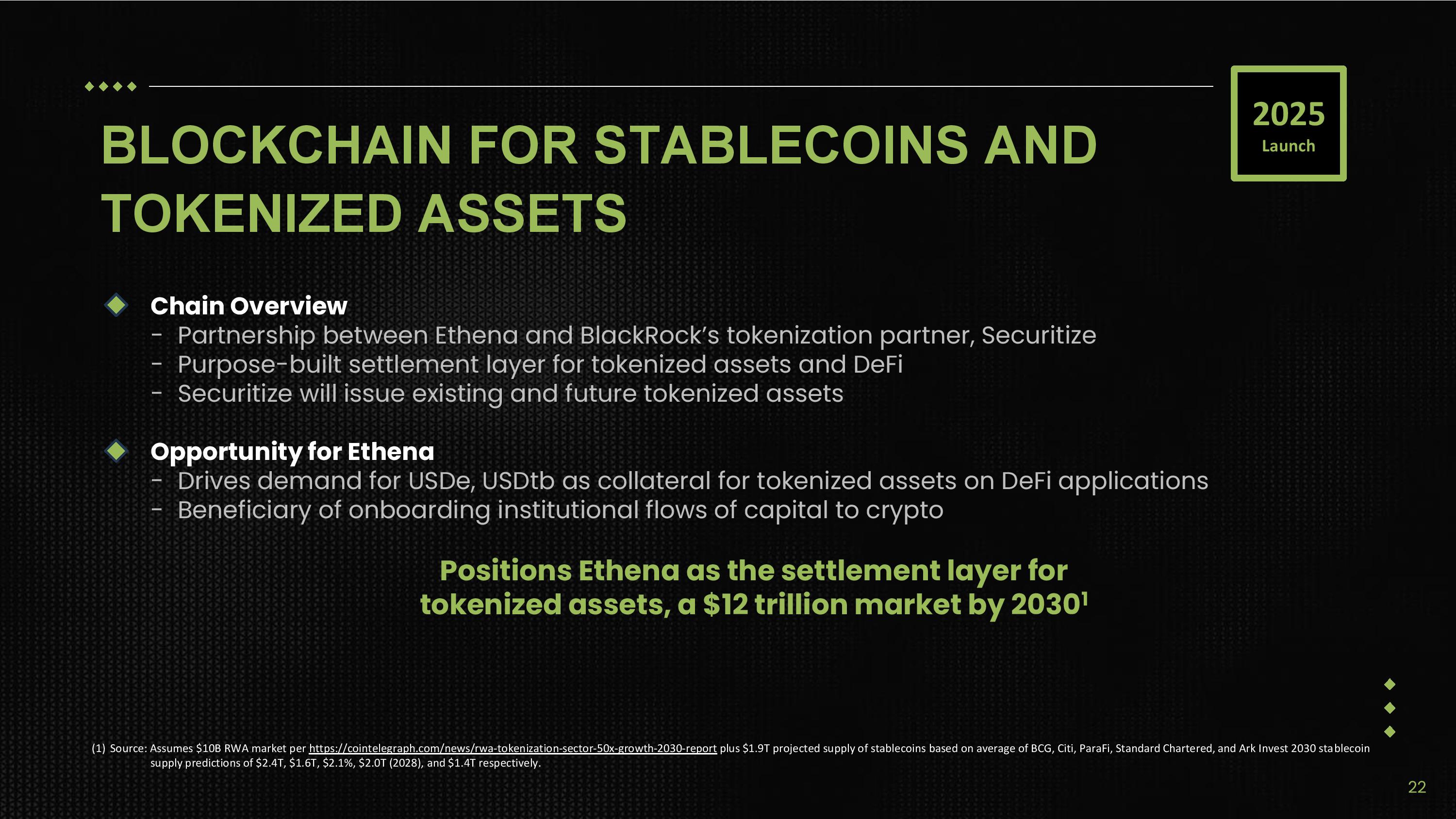 BLOCKCHAIN FOR STABLECOINS AND TOKENIZED ASSETS Chain Overview - Partnership between Ethena and BlackRock’s tokenization partner, Securitize - Purpose - built settlement layer for tokenized assets and DeFi - Securitize will issue existing and future tokenized assets Opportunity for Ethena - Drives demand for USDe, USDtb as collateral for tokenized assets on DeFi applications - Beneficiary of onboarding institutional flows of capital to crypto Positions Ethena as the settlement layer for tokenized assets, a $12 trillion market by 2030 1 (1) Source: Assumes $10B RWA market per https://cointelegraph.com/news/rwa - tokenization - sector - 50x - growth - 2030 - report plus $1.9T projected supply of stablecoins based on average of BCG, Citi, ParaFi, Standard Chartered, and Ark Invest 2030 stablecoin supply predictions of $2.4T, $1.6T, $2.1%, $2.0T (2028), and $1.4T respectively. 2025 Launch 22