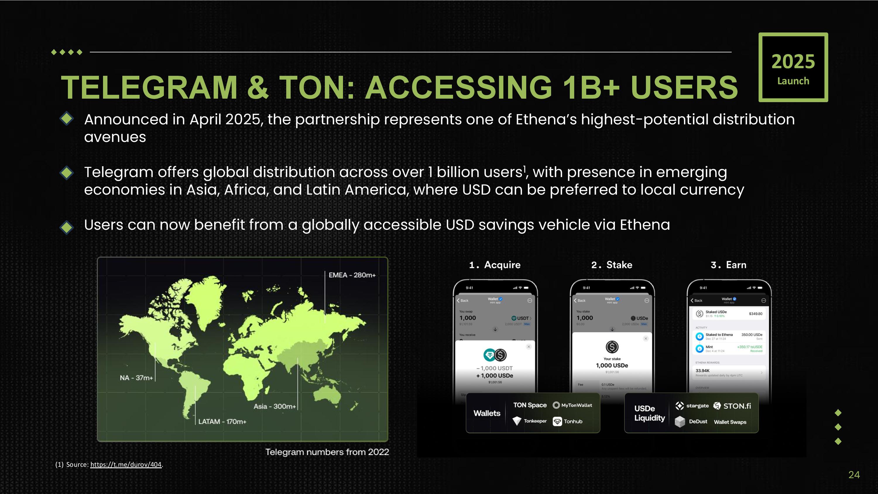 TELEGRAM & TON: ACCESSING 1B+ USERS Announced in April 2025, the partnership represents one of Ethena’s highest - potential distribution avenues Telegram offers global distribution across over 1 billion users 1 , with presence in emerging economies in Asia, Africa, and Latin America, where USD can be preferred to local currency Users can now benefit from a globally accessible USD savings vehicle via Ethena (1) Source: https://t.me/durov/404 . 2025 Launch 24