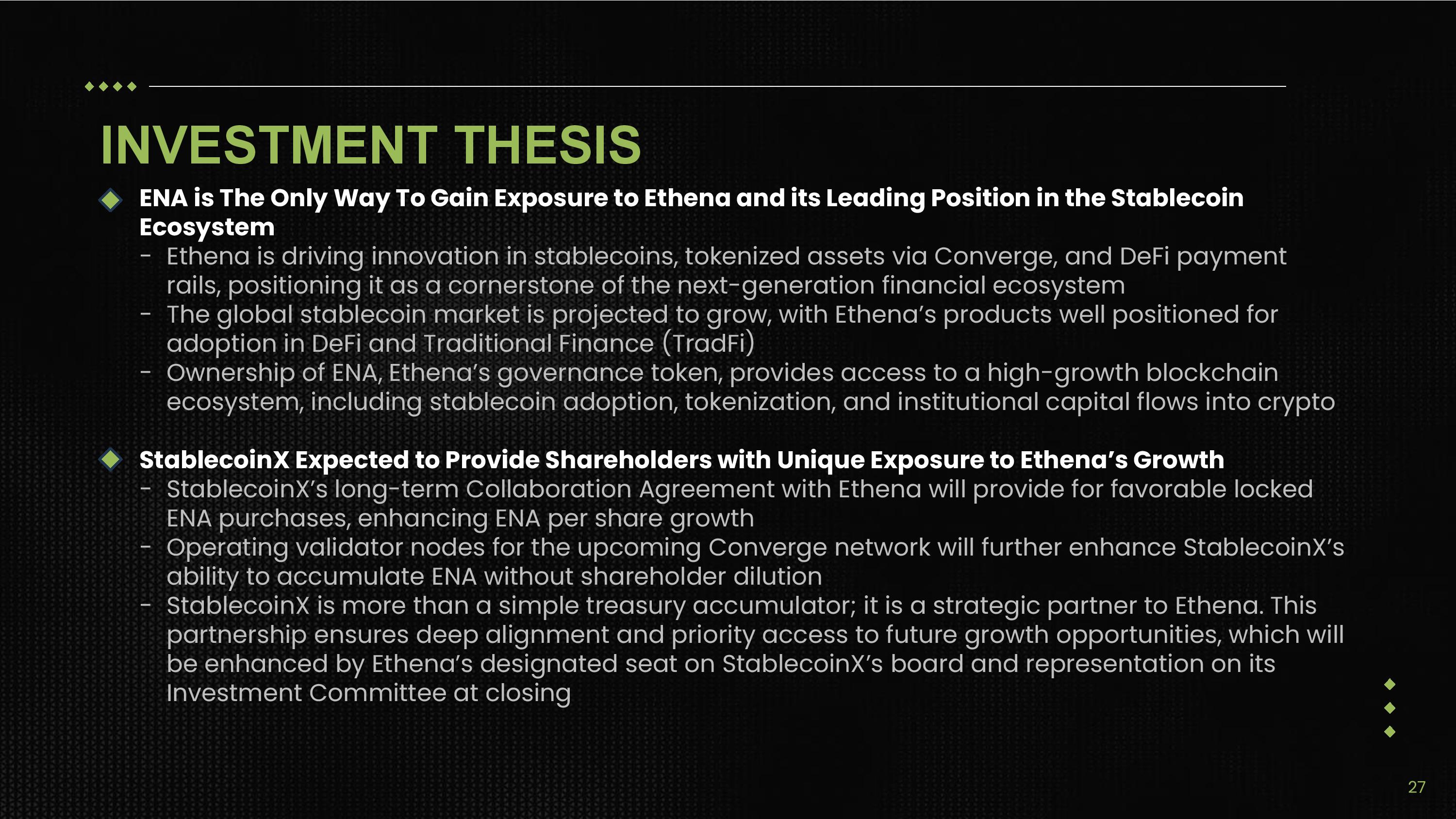 INVESTMENT THESIS ENA is The Only Way To Gain Exposure to Ethena and its Leading Position in the Stablecoin Ecosystem - Ethena is driving innovation in stablecoins, tokenized assets via Converge, and DeFi payment rails, positioning it as a cornerstone of the next - generation financial ecosystem - The global stablecoin market is projected to grow, with Ethena’s products well positioned for adoption in DeFi and Traditional Finance (TradFi) - Ownership of ENA, Ethena’s governance token, provides access to a high - growth blockchain ecosystem, including stablecoin adoption, tokenization, and institutional capital flows into crypto StablecoinX Expected to Provide Shareholders with Unique Exposure to Ethena’s Growth - StablecoinX’s long - term Collaboration Agreement with Ethena will provide for favorable locked ENA purchases, enhancing ENA per share growth - Operating validator nodes for the upcoming Converge network will further enhance StablecoinX’s ability to accumulate ENA without shareholder dilution - StablecoinX is more than a simple treasury accumulator; it is a strategic partner to Ethena. This partnership ensures deep alignment and priority access to future growth opportunities, which will be enhanced by Ethena’s designated seat on StablecoinX’s board and representation on its Investment Committee at closing 27
