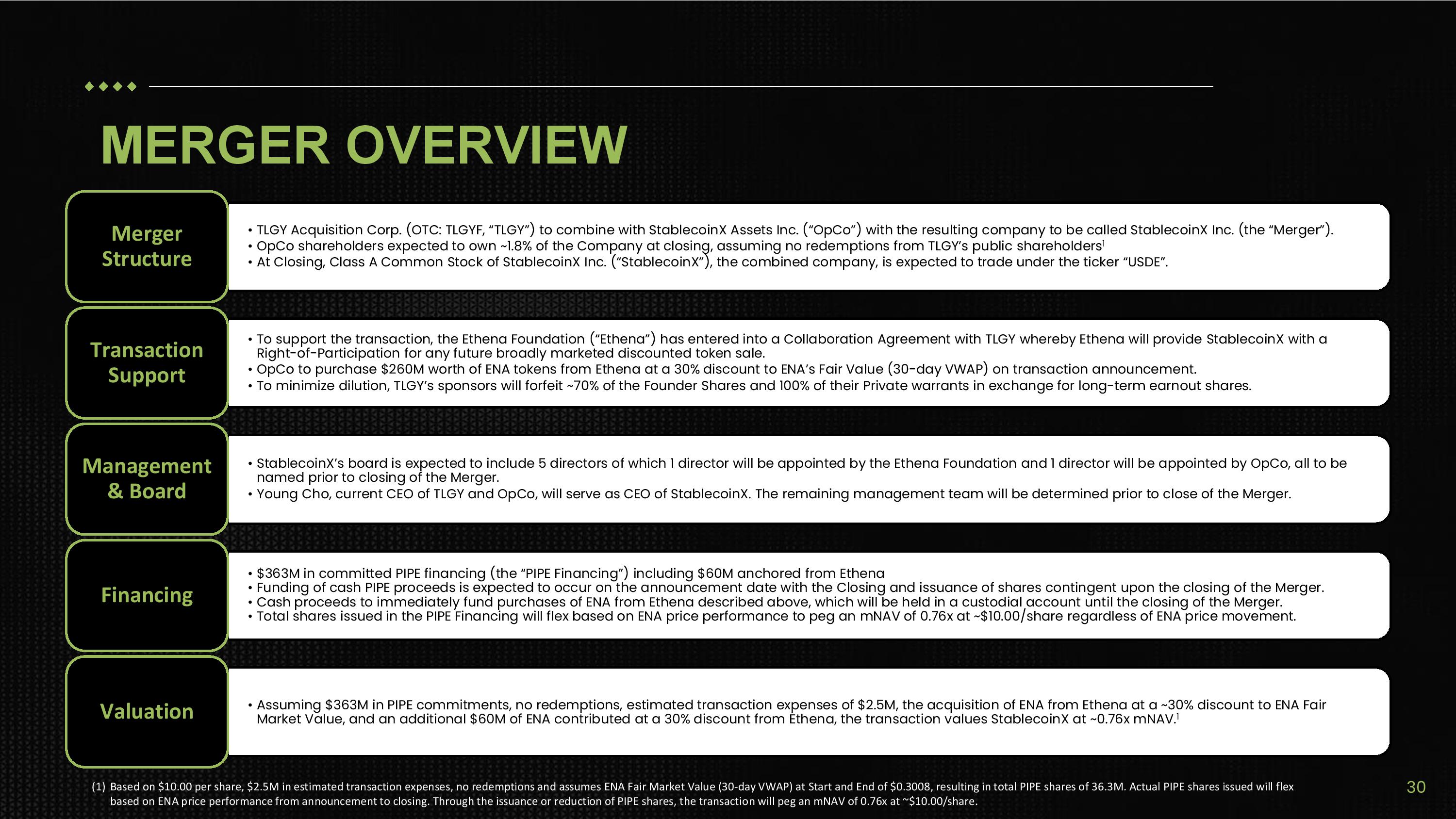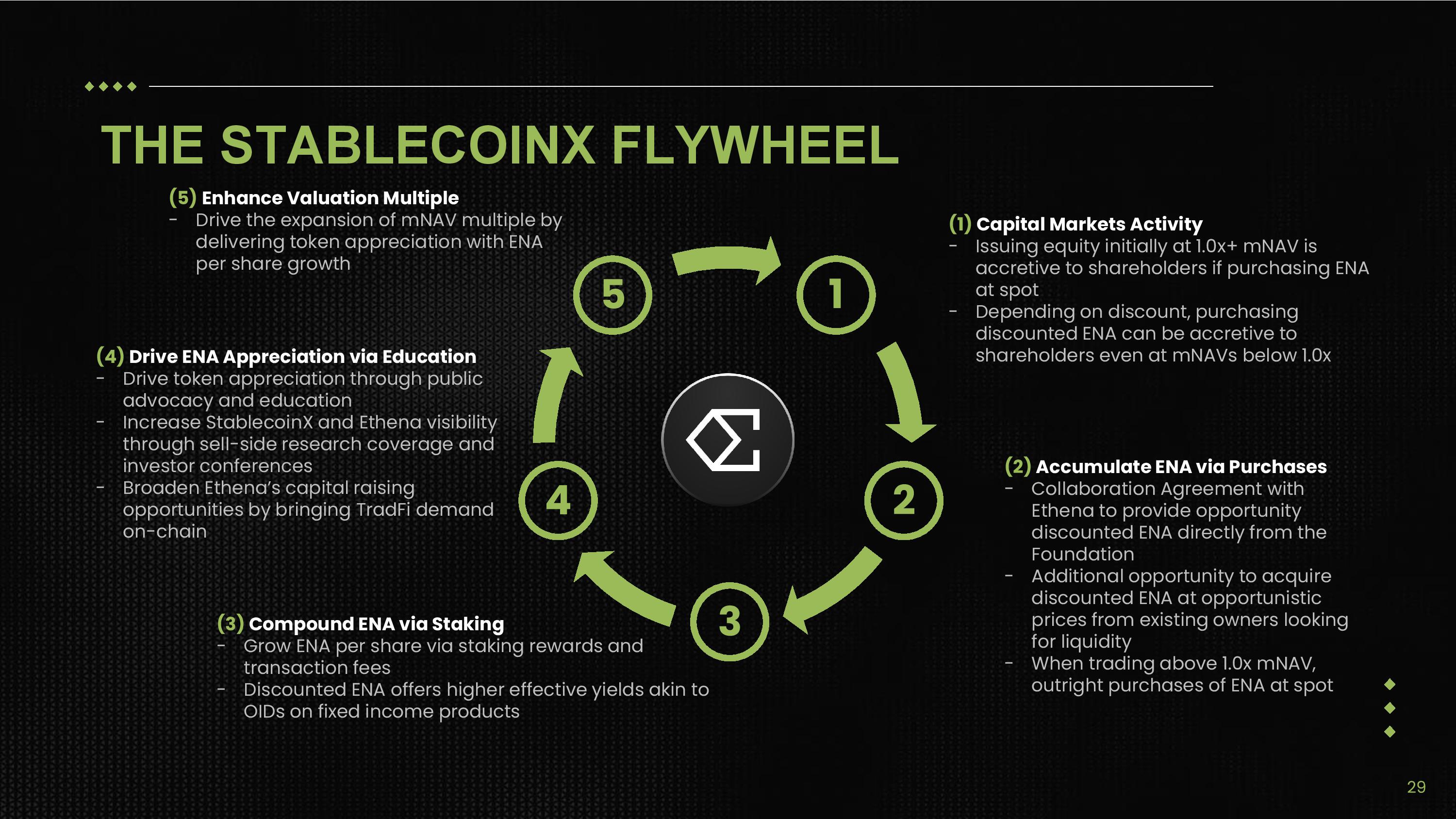 THE STABLECOINX FLYWHEEL 2 3 4 5 1 (1) Capital Markets Activity - Issuing equity initially at 1.0x+ mNAV is accretive to shareholders if purchasing ENA at spot - Depending on discount, purchasing discounted ENA can be accretive to shareholders even at mNAVs below 1.0x (2) Accumulate ENA via Purchases - Collaboration Agreement with Ethena to provide opportunity discounted ENA directly from the Foundation - Additional opportunity to acquire discounted ENA at opportunistic prices from existing owners looking for liquidity - When trading above 1.0x mNAV, outright purchases of ENA at spot (3) Compound ENA via Staking - Grow ENA per share via staking rewards and transaction fees - Discounted ENA offers higher effective yields akin to OIDs on fixed income products (4) Drive ENA Appreciation via Education - Drive token appreciation through public advocacy and education - Increase StablecoinX and Ethena visibility through sell - side research coverage and investor conferences - Broaden Ethena’s capital raising opportunities by bringing TradFi demand on - chain (5) Enhance Valuation Multiple - Drive the expansion of mNAV multiple by delivering token appreciation with ENA per share growth 29