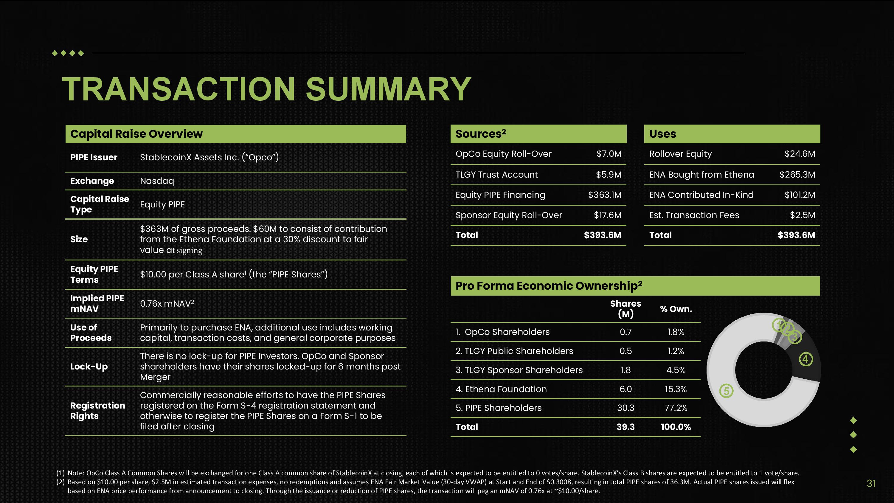 TRANSACTION SUMMARY Capital Raise Overview StablecoinX Assets Inc. (“Opco”) PIPE Issuer Nasdaq Exchange Equity PIPE Capital Raise Type $363M of gross proceeds. $60M to consist of contribution from the Ethena Foundation at a 30% discount to fair value at closing Size $10.00 per Class A share 1 (the “PIPE Shares”) Equity PIPE Terms 0.76x mNAV 2 Implied PIPE mNAV Primarily to purchase ENA, additional use includes working capital, transaction costs, and general corporate purposes Use of Proceeds There is no lock - up for PIPE Investors. OpCo and Sponsor shareholders have their shares locked - up for 6 months post Merger Lock - Up Commercially reasonable efforts to have the PIPE Shares registered on the Form S - 4 registration statement and otherwise to register the PIPE Shares on a Form S - 1 to be filed after closing Registration Rights (1) Note: OpCo Class A Common Shares will be exchanged for one Class A common share of StablecoinX at closing, each of which is expected to be entitled to 0 votes/share. StablecoinX’s Class B shares are expected to be entitled to 1 vote/share. Sources 2 $7.0M OpCo Equity Roll - Over $5.9M TLGY Trust Account $363.1M Equity PIPE Financing $17.6M Sponsor Equity Roll - Over $393.6M Total Uses $24.6M Rollover Equity $265.3M ENA Bought from Ethena $101.2M ENA Contributed In - Kind $2.5M Est. Transaction Fees $393.6M Total Pro Forma Economic Ownership 2 % Own. Shares 1 2 3 1.8% 0.7 1. OpCo Shareholders 4 1.2% 0.5 2. TLGY Public Shareholders 4.5% 1.8 3. TLGY Sponsor Shareholders 5 15.3% 6.0 4. Ethena Foundation 77.2% 30.3 5. PIPE Shareholders 100.0% 39.3 Total 31 (2) Based on $10.00 per share, $2.5M in estimated transaction expenses, no redemptions and assumes ENA Fair Market Value (30 - day VWAP) at Start and End of $0.3008, resulting in total PIPE shares of 36.3M. Actual PIPE shares issued will flex based on ENA price performance from announcement to closing. Through the issuance or reduction of PIPE shares, the transaction will peg an mNAV of 0.76x at ~$10.00/share.