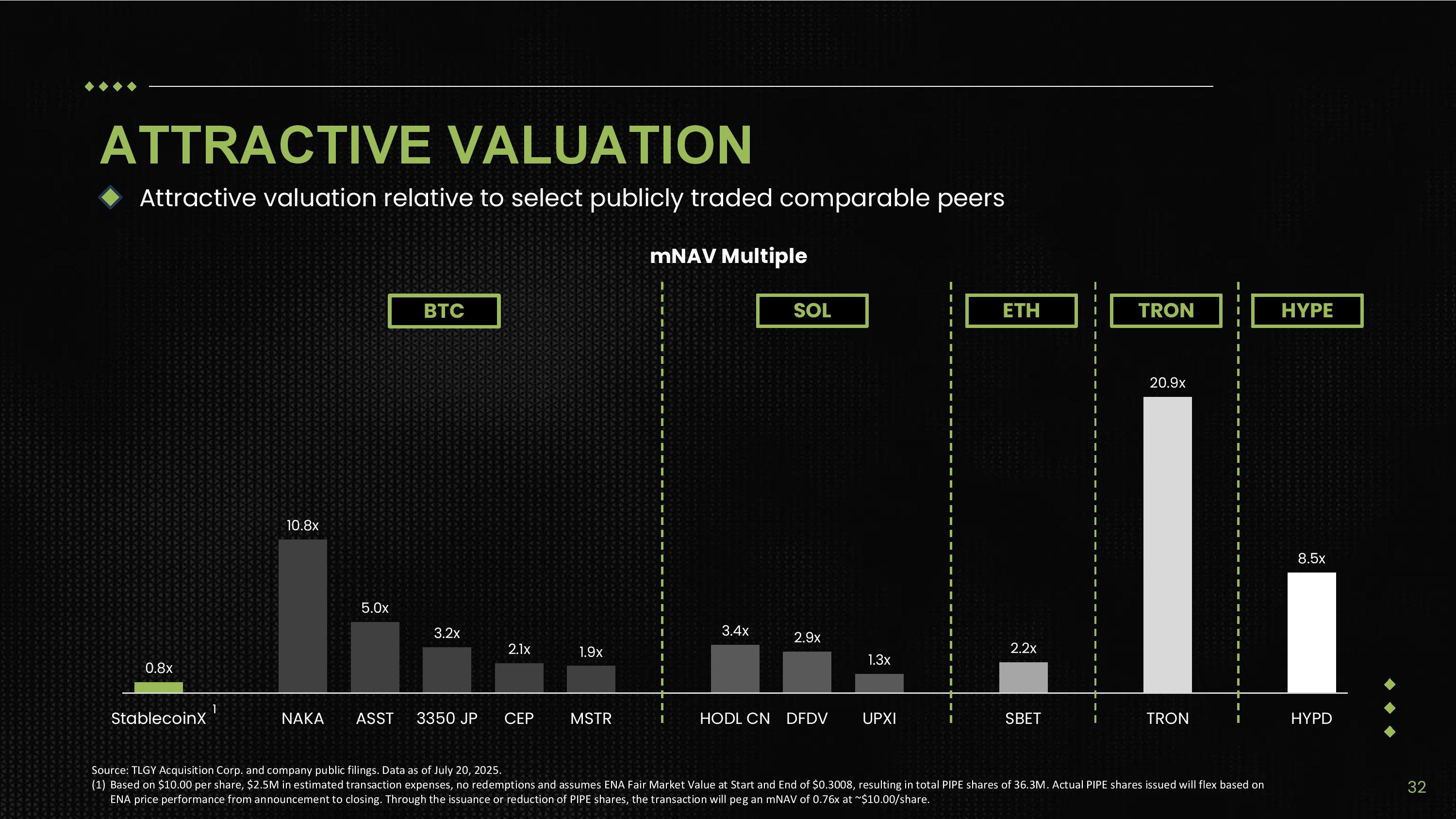 0.8x 10.8x 5.0x 3.2x 2.1x 1.9x 3.4x 2.9x 1.3x 2.2x 20.9x 8.5x NAKA ASST 3350 JP CEP MSTR HODL CN DFDV UPXI SBET TRON HYPD mNAV Multiple StablecoinX 1 Source: TLGY Acquisition Corp. and company public filings. Data as of July 20, 2025. (1) Based on $10.00 per share, $2.5M in estimated transaction expenses, no redemptions and assumes ENA Fair Market Value at Start and End of $0.3008, resulting in total PIPE shares of 36.3M. Actual PIPE shares issued will flex based on ENA price performance from announcement to closing. Through the issuance or reduction of PIPE shares, the transaction will peg an mNAV of 0.76x at ~$10.00/share. ATTRACTIVE VALUATION Attractive valuation relative to select publicly traded comparable peers BTC SOL ETH 32 TRON HYPE