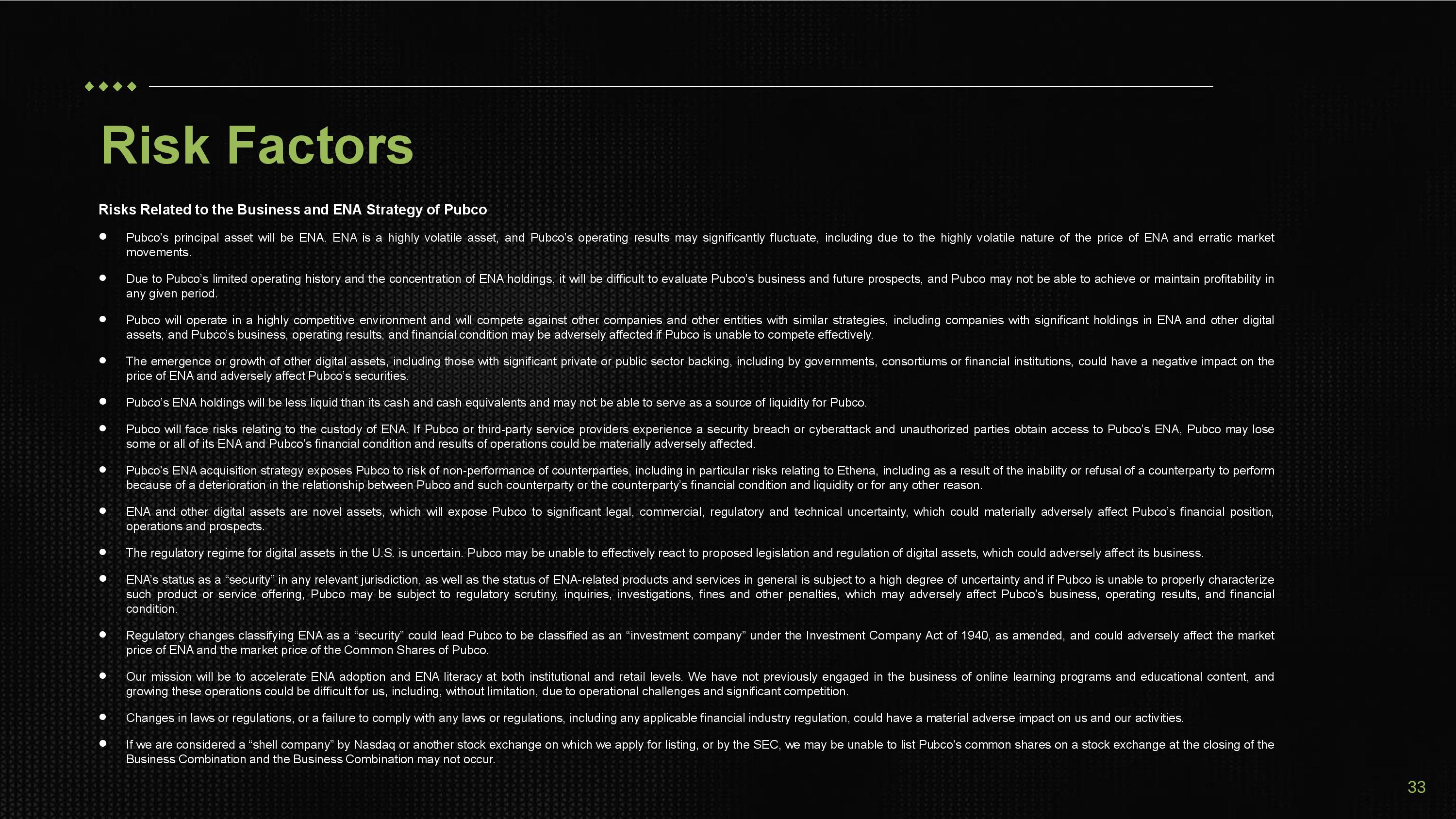 Risks Related to the Business and ENA Strategy of Pubco  Pubco’s principal asset will be ENA . ENA is a highly volatile asset, and Pubco’s operating results may significantly fluctuate, including due to the highly volatile nature of the price of ENA and erratic market movements .  Due to Pubco’s limited operating history and the concentration of ENA holdings, it will be difficult to evaluate Pubco’s business and future prospects, and Pubco may not be able to achieve or maintain profitability in any given period .  Pubco will operate in a highly competitive environment and will compete against other companies and other entities with similar strategies, including companies with significant holdings in ENA and other digital assets, and Pubco’s business, operating results, and financial condition may be adversely affected if Pubco is unable to compete effectively .  The emergence or growth of other digital assets, including those with significant private or public sector backing, including by governments, consortiums or financial institutions, could have a negative impact on the price of ENA and adversely affect Pubco’s securities .  Pubco’s ENA holdings will be less liquid than its cash and cash equivalents and may not be able to serve as a source of liquidity for Pubco.  Pubco will face risks relating to the custody of ENA . If Pubco or third - party service providers experience a security breach or cyberattack and unauthorized parties obtain access to Pubco’s ENA, Pubco may lose some or all of its ENA and Pubco’s financial condition and results of operations could be materially adversely affected .  Pubco’s ENA acquisition strategy exposes Pubco to risk of non - performance of counterparties, including in particular risks relating to Ethena, including as a result of the inability or refusal of a counterparty to perform because of a deterioration in the relationship between Pubco and such counterparty or the counterparty’s financial condition and liquidity or for any other reason .  ENA and other digital assets are novel assets, which will expose Pubco to significant legal, commercial, regulatory and technical uncertainty, which could materially adversely affect Pubco’s financial position, operations and prospects .  The regulatory regime for digital assets in the U.S. is uncertain. Pubco may be unable to effectively react to proposed legislation and regulation of digital assets, which could adversely affect its business.  ENA’s status as a “security” in any relevant jurisdiction, as well as the status of ENA - related products and services in general is subject to a high degree of uncertainty and if Pubco is unable to properly characterize such product or service offering, Pubco may be subject to regulatory scrutiny, inquiries, investigations, fines and other penalties, which may adversely affect Pubco’s business, operating results, and financial condition .  Regulatory changes classifying ENA as a “security” could lead Pubco to be classified as an “investment company” under the Investment Company Act of 1940 , as amended, and could adversely affect the market price of ENA and the market price of the Common Shares of Pubco .  Our mission will be to accelerate ENA adoption and ENA literacy at both institutional and retail levels . We have not previously engaged in the business of online learning programs and educational content, and growing these operations could be difficult for us, including, without limitation, due to operational challenges and significant competition .  Changes in laws or regulations, or a failure to comply with any laws or regulations, including any applicable financial industry regulation, could have a material adverse impact on us and our activities.  If we are considered a “shell company” by Nasdaq or another stock exchange on which we apply for listing, or by the SEC, we may be unable to list Pubco’s common shares on a stock exchange at the closing of the Business Combination and the Business Combination may not occur . Risk Factors 33