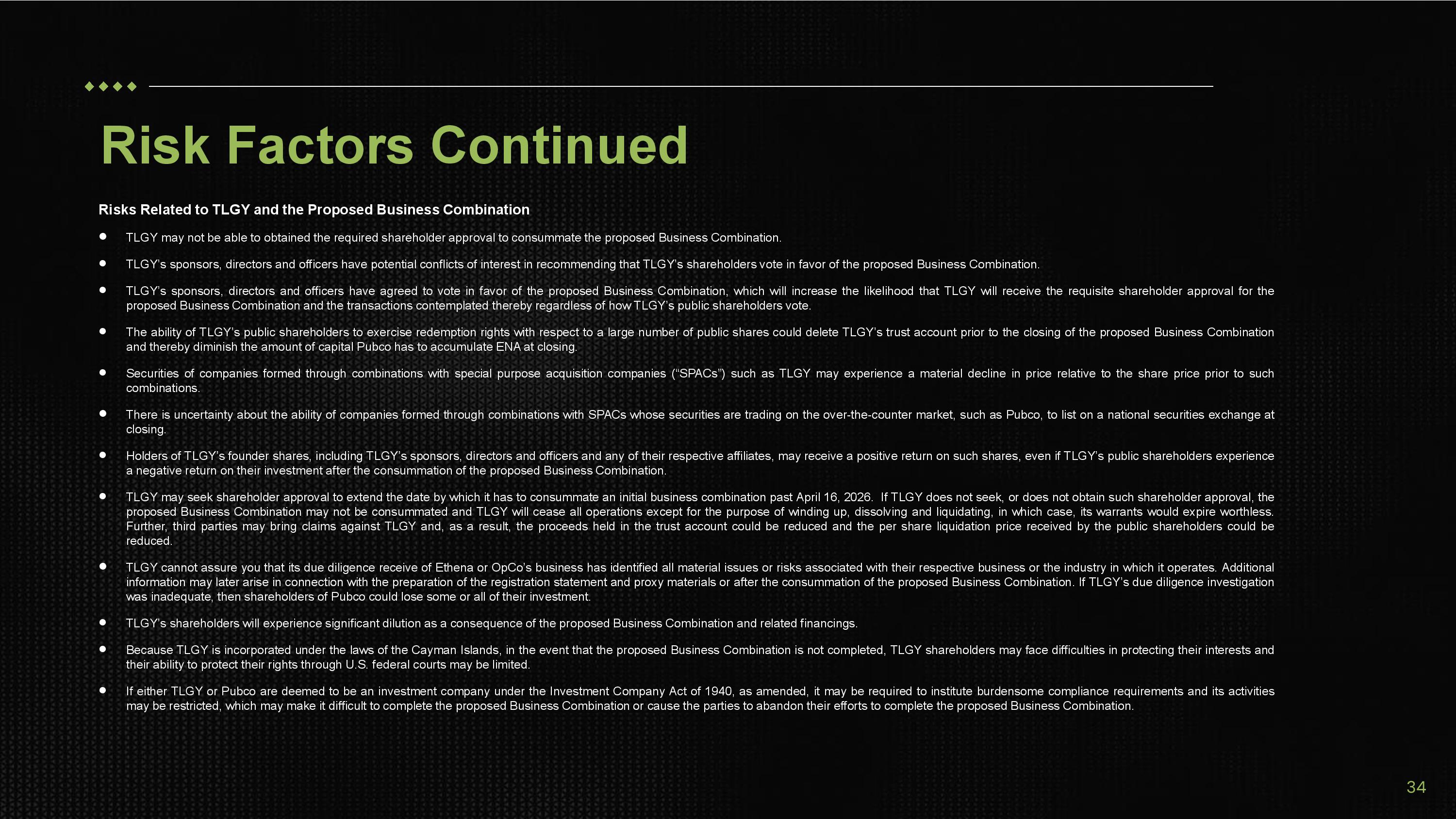Risks Related to TLGY and the Proposed Business Combination  TLGY may not be able to obtained the required shareholder approval to consummate the proposed Business Combination.  TLGY’s sponsors, directors and officers have potential conflicts of interest in recommending that TLGY’s shareholders vote in favor of the proposed Business Combination.  TLGY’s sponsors, directors and officers have agreed to vote in favor of the proposed Business Combination, which will increase the likelihood that TLGY will receive the requisite shareholder approval for the proposed Business Combination and the transactions contemplated thereby regardless of how TLGY’s public shareholders vote .  The ability of TLGY’s public shareholders to exercise redemption rights with respect to a large number of public shares could delete TLGY’s trust account prior to the closing of the proposed Business Combination and thereby diminish the amount of capital Pubco has to accumulate ENA at closing .  Securities of companies formed through combinations with special purpose acquisition companies (“SPACs”) such as TLGY may experience a material decline in price relative to the share price prior to such combinations .  There is uncertainty about the ability of companies formed through combinations with SPACs whose securities are trading on the over - the - counter market, such as Pubco, to list on a national securities exchange at closing.  Holders of TLGY’s founder shares, including TLGY’s sponsors, directors and officers and any of their respective affiliates, may receive a positive return on such shares, even if TLGY’s public shareholders experience a negative return on their investment after the consummation of the proposed Business Combination .  TLGY may seek shareholder approval to extend the date by which it has to consummate an initial business combination past April 16 , 2026 . If TLGY does not seek, or does not obtain such shareholder approval, the proposed Business Combination may not be consummated and TLGY will cease all operations except for the purpose of winding up, dissolving and liquidating, in which case, its warrants would expire worthless . Further, third parties may bring claims against TLGY and, as a result, the proceeds held in the trust account could be reduced and the per share liquidation price received by the public shareholders could be reduced .  TLGY cannot assure you that its due diligence receive of Ethena or OpCo’s business has identified all material issues or risks associated with their respective business or the industry in which it operates . Additional information may later arise in connection with the preparation of the registration statement and proxy materials or after the consummation of the proposed Business Combination . If TLGY’s due diligence investigation was inadequate, then shareholders of Pubco could lose some or all of their investment .  TLGY’s shareholders will experience significant dilution as a consequence of the proposed Business Combination and related financings.  Because TLGY is incorporated under the laws of the Cayman Islands, in the event that the proposed Business Combination is not completed, TLGY shareholders may face difficulties in protecting their interests and their ability to protect their rights through U . S . federal courts may be limited .  If either TLGY or Pubco are deemed to be an investment company under the Investment Company Act of 1940 , as amended, it may be required to institute burdensome compliance requirements and its activities may be restricted, which may make it difficult to complete the proposed Business Combination or cause the parties to abandon their efforts to complete the proposed Business Combination . Risk Factors Continued 34