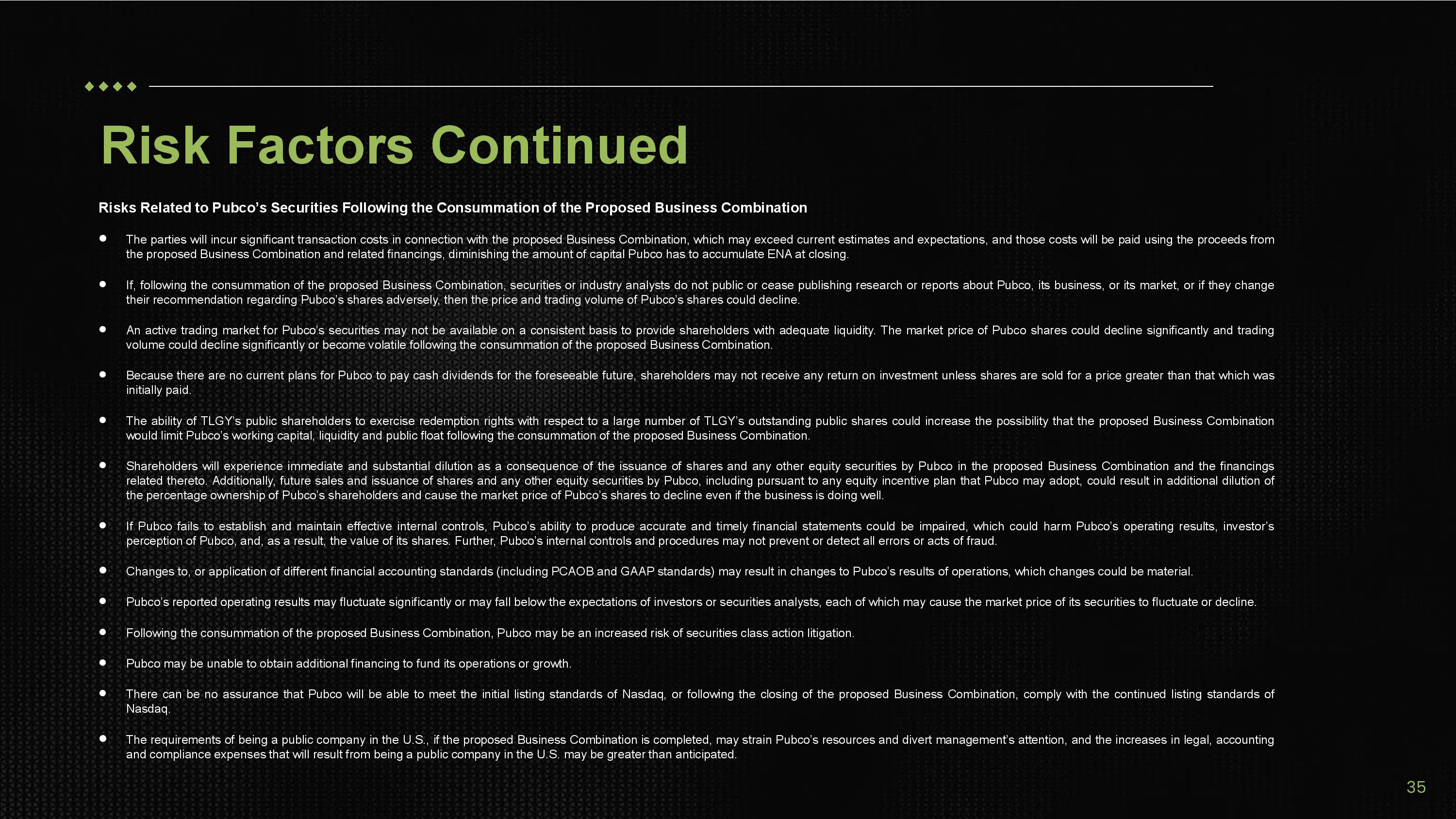 Risks Related to Pubco’s Securities Following the Consummation of the Proposed Business Combination  The parties will incur significant transaction costs in connection with the proposed Business Combination, which may exceed current estimates and expectations, and those costs will be paid using the proceeds from the proposed Business Combination and related financings, diminishing the amount of capital Pubco has to accumulate ENA at closing.  If, following the consummation of the proposed Business Combination, securities or industry analysts do not public or cease publishing research or reports about Pubco, its business, or its market, or if they change their recommendation regarding Pubco’s shares adversely, then the price and trading volume of Pubco’s shares could decline .  An active trading market for Pubco’s securities may not be available on a consistent basis to provide shareholders with adequate liquidity . The market price of Pubco shares could decline significantly and trading volume could decline significantly or become volatile following the consummation of the proposed Business Combination .  Because there are no current plans for Pubco to pay cash dividends for the foreseeable future, shareholders may not receive any return on investment unless shares are sold for a price greater than that which was initially paid .  The ability of TLGY’s public shareholders to exercise redemption rights with respect to a large number of TLGY’s outstanding public shares could increase the possibility that the proposed Business Combination would limit Pubco’s working capital, liquidity and public float following the consummation of the proposed Business Combination .  Shareholders will experience immediate and substantial dilution as a consequence of the issuance of shares and any other equity securities by Pubco in the proposed Business Combination and the financings related thereto . Additionally, future sales and issuance of shares and any other equity securities by Pubco, including pursuant to any equity incentive plan that Pubco may adopt, could result in additional dilution of the percentage ownership of Pubco’s shareholders and cause the market price of Pubco’s shares to decline even if the business is doing well .  If Pubco fails to establish and maintain effective internal controls, Pubco’s ability to produce accurate and timely financial statements could be impaired, which could harm Pubco’s operating results, investor’s perception of Pubco, and, as a result, the value of its shares. Further, Pubco’s internal controls and procedures may not prevent or detect all errors or acts of fraud.  Changes to, or application of different financial accounting standards (including PCAOB and GAAP standards) may result in changes to Pubco’s results of operations, which changes could be material.  Pubco’s reported operating results may fluctuate significantly or may fall below the expectations of investors or securities analysts, each of which may cause the market price of its securities to fluctuate or decline.  Following the consummation of the proposed Business Combination, Pubco may be an increased risk of securities class action litigation.  Pubco may be unable to obtain additional financing to fund its operations or growth.  There can be no assurance that Pubco will be able to meet the initial listing standards of Nasdaq, or following the closing of the proposed Business Combination, comply with the continued listing standards of Nasdaq .  The requirements of being a public company in the U.S., if the proposed Business Combination is completed, may strain Pubco’s resources and divert management’s attention, and the increases in legal, accounting and compliance expenses that will result from being a public company in the U.S. may be greater than anticipated. Risk Factors Continued 35