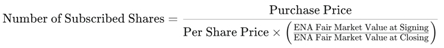 Assuming by way of example, a total Purchase Price of $10 million and an ENA Fair Market Value at Closing of $0.70, this would mean that a total of 1,689,644 Subscribed Shares would be issued to Subscriber at Closing as demonstrated below.