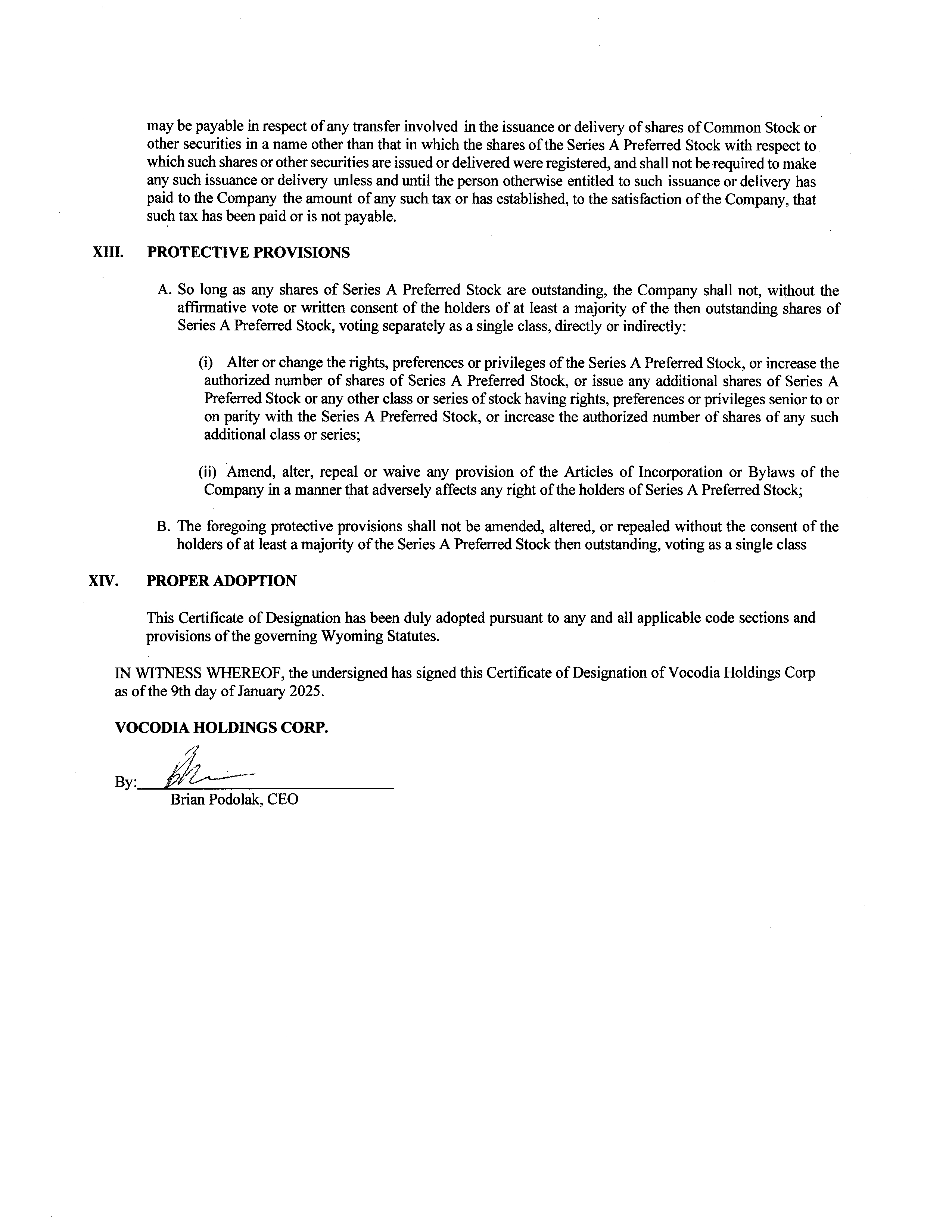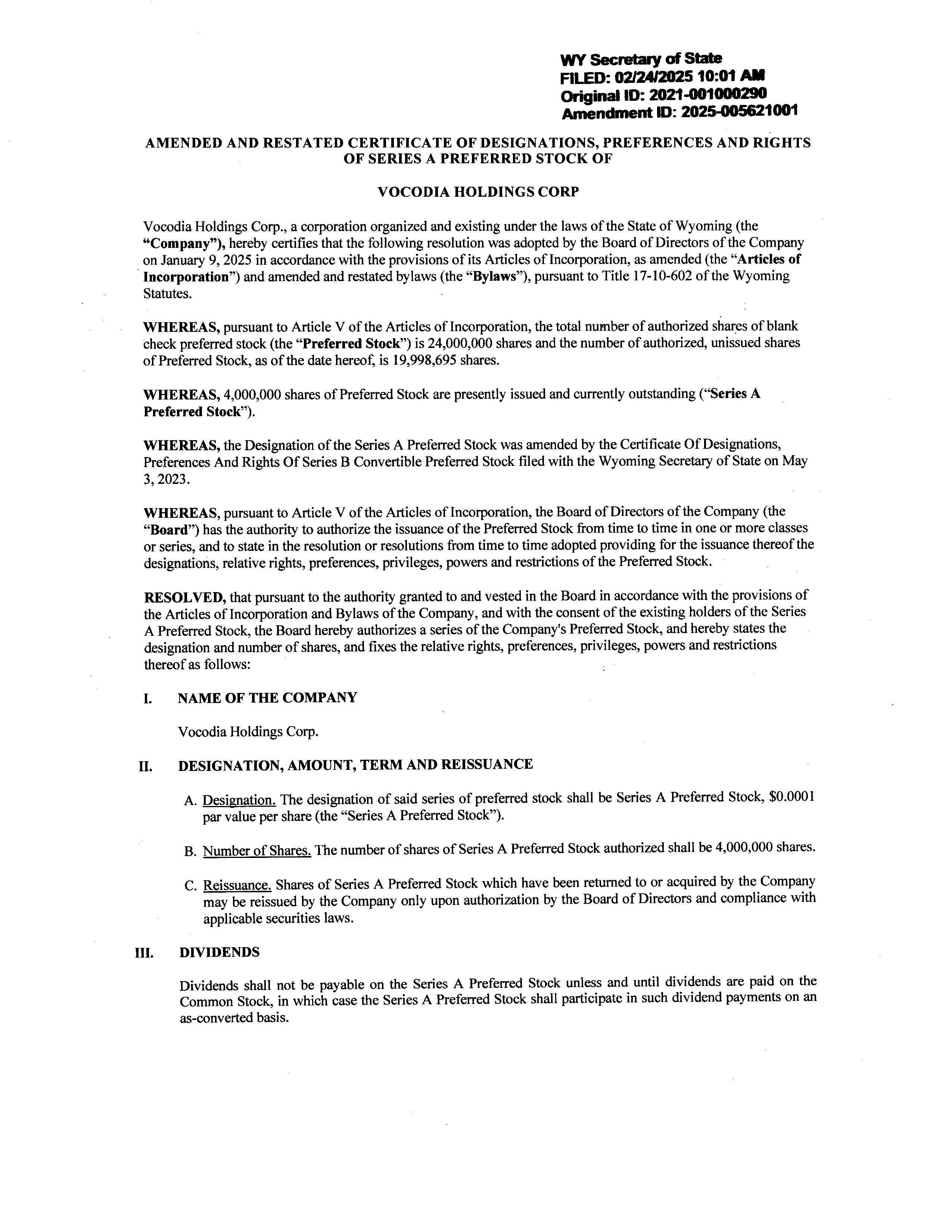 EX-3.1 2 ea023397801ex3-1_vocodia.htm AMENDED AND RESTATED DESIGNATION OF THE SERIES A PREFERRED STOCK