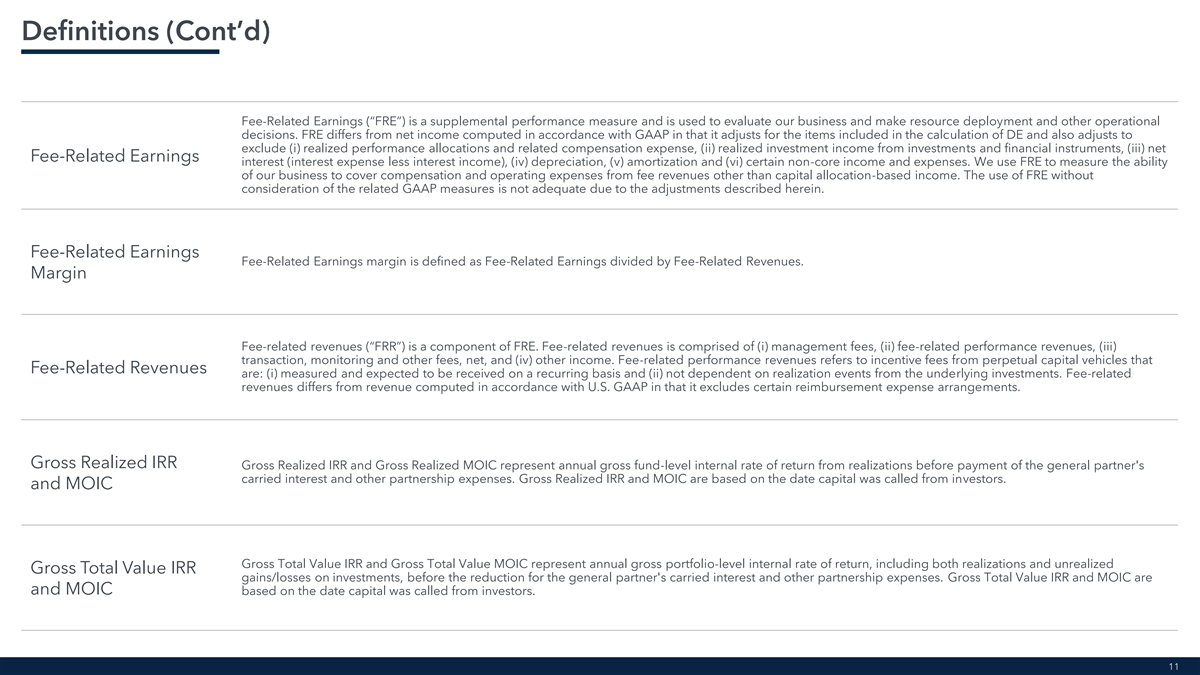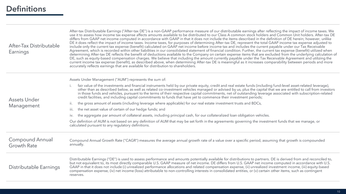 Definitions After-tax Distributable Earnings (“After-tax DE”) is a non-GAAP performance measure of our distributable earnings after reflecting the impact of income taxes. We use it to assess how income tax expense affects amounts available to be distributed to our Class A common stock holders and Common Unit holders. After-tax DE differs from GAAP net income computed in accordance with GAAP in that it does not include the items described in the definition of DE herein; however, unlike DE it does reflect the impact of income taxes. Income taxes, for purposes of determining After-tax DE, represent the total GAAP income tax expense adjusted to After-Tax Distributable include only the current tax expense (benefit) calculated on GAAP net income before income tax and includes the current payable under our Tax Receivable Agreement, which is recorded within other liabilities in our consolidated statement of financial condition. Further, the current tax expense (benefit) utilized when Earnings determining After-tax DE reflects the benefit of deductions available to the Company on certain expense items that are excluded from the underlying calculation of DE, such as equity-based compensation charges. We believe that including the amount currently payable under the Tax Receivable Agreement and utilizing the current income tax expense (benefit), as described above, when determining After-tax DE is meaningful as it increases comparability between periods and more accurately reflects earnings that are available for distribution to shareholders. Assets Under Management (“AUM”) represents the sum of: i. fair value of the investments and financial instruments held by our private equity, credit and real estate funds (including fund-level asset-related leverage), other than as described below, as well as related co-investment vehicles managed or advised by us, plus the capital that we are entitled to call from investors in those funds and vehicles, pursuant to the terms of their respective capital commitments, net of outstanding leverage associated with subscription-related credit facilities, and including capital commitments to funds that have yet to commence their investment periods; Assets Under ii. the gross amount of assets (including leverage where applicable) for our real estate investment trusts and BDCs, Management iii. the net asset value of certain of our hedge funds; and iv. the aggregate par amount of collateral assets, including principal cash, for our collateralized loan obligation vehicles. Our definition of AUM is not based on any definition of AUM that may be set forth in the agreements governing the investment funds that we manage, or calculated pursuant to any regulatory definitions. Compound Annual Compound Annual Growth Rate (“CAGR”) measures the average annual growth rate of a value over a specific period, assuming that growth is compounded annually. Growth Rate Distributable Earnings (“DE”) is used to assess performance and amounts potentially available for distributions to partners. DE is derived from and reconciled to, but not equivalent to, its most directly comparable U.S. GAAP measure of net income. DE differs from U.S. GAAP net income computed in accordance with U.S. GAAP in that it does not include (i) unrealized performance allocations and related compensation expense, (ii) unrealized investment income, (iii) equity-based Distributable Earnings compensation expense, (iv) net income (loss) attributable to non-controlling interests in consolidated entities, or (v) certain other items, such as contingent reserves. 10