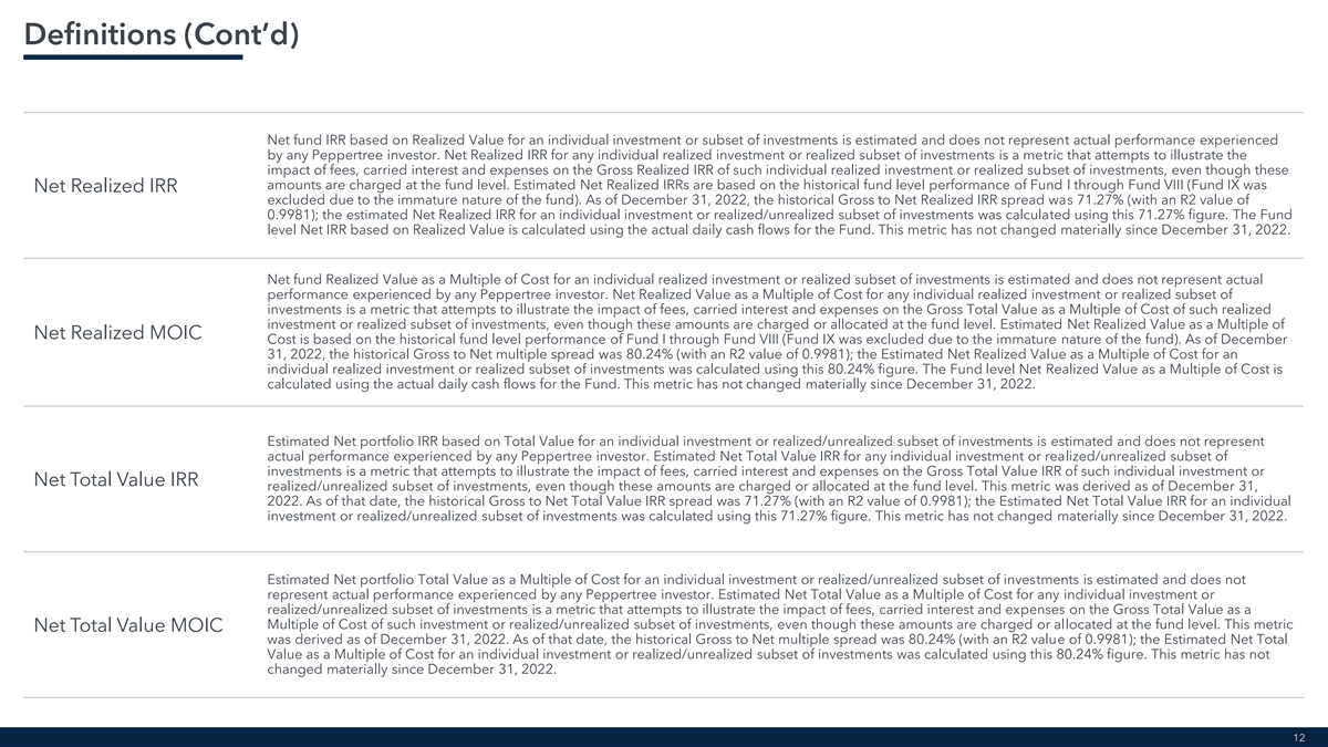 Definitions (Cont’d) Net fund IRR based on Realized Value for an individual investment or subset of investments is estimated and does not represent actual performance experienced by any Peppertree investor. Net Realized IRR for any individual realized investment or realized subset of investments is a metric that attempts to illustrate the impact of fees, carried interest and expenses on the Gross Realized IRR of such individual realized investment or realized subset of investments, even though these amounts are charged at the fund level. Estimated Net Realized IRRs are based on the historical fund level performance of Fund I through Fund VIII (Fund IX was Net Realized IRR excluded due to the immature nature of the fund). As of December 31, 2022, the historical Gross to Net Realized IRR spread was 71.27% (with an R2 value of 0.9981); the estimated Net Realized IRR for an individual investment or realized/unrealized subset of investments was calculated using this 71.27% figure. The Fund level Net IRR based on Realized Value is calculated using the actual daily cash flows for the Fund. This metric has not changed materially since December 31, 2022. Net fund Realized Value as a Multiple of Cost for an individual realized investment or realized subset of investments is estimated and does not represent actual performance experienced by any Peppertree investor. Net Realized Value as a Multiple of Cost for any individual realized investment or realized subset of investments is a metric that attempts to illustrate the impact of fees, carried interest and expenses on the Gross Total Value as a Multiple of Cost of such realized investment or realized subset of investments, even though these amounts are charged or allocated at the fund level. Estimated Net Realized Value as a Multiple of Net Realized MOIC Cost is based on the historical fund level performance of Fund I through Fund VIII (Fund IX was excluded due to the immature nature of the fund). As of December 31, 2022, the historical Gross to Net multiple spread was 80.24% (with an R2 value of 0.9981); the Estimated Net Realized Value as a Multiple of Cost for an individual realized investment or realized subset of investments was calculated using this 80.24% figure. The Fund level Net Realized Value as a Multiple of Cost is calculated using the actual daily cash flows for the Fund. This metric has not changed materially since December 31, 2022. Estimated Net portfolio IRR based on Total Value for an individual investment or realized/unrealized subset of investments is estimated and does not represent actual performance experienced by any Peppertree investor. Estimated Net Total Value IRR for any individual investment or realized/unrealized subset of investments is a metric that attempts to illustrate the impact of fees, carried interest and expenses on the Gross Total Value IRR of such individual investment or Net Total Value IRR realized/unrealized subset of investments, even though these amounts are charged or allocated at the fund level. This metric was derived as of December 31, 2022. As of that date, the historical Gross to Net Total Value IRR spread was 71.27% (with an R2 value of 0.9981); the Estimated Net Total Value IRR for an individual investment or realized/unrealized subset of investments was calculated using this 71.27% figure. This metric has not changed materially since December 31, 2022. Estimated Net portfolio Total Value as a Multiple of Cost for an individual investment or realized/unrealized subset of investments is estimated and does not represent actual performance experienced by any Peppertree investor. Estimated Net Total Value as a Multiple of Cost for any individual investment or realized/unrealized subset of investments is a metric that attempts to illustrate the impact of fees, carried interest and expenses on the Gross Total Value as a Multiple of Cost of such investment or realized/unrealized subset of investments, even though these amounts are charged or allocated at the fund level. This metric Net Total Value MOIC was derived as of December 31, 2022. As of that date, the historical Gross to Net multiple spread was 80.24% (with an R2 value of 0.9981); the Estimated Net Total Value as a Multiple of Cost for an individual investment or realized/unrealized subset of investments was calculated using this 80.24% figure. This metric has not changed materially since December 31, 2022. 12