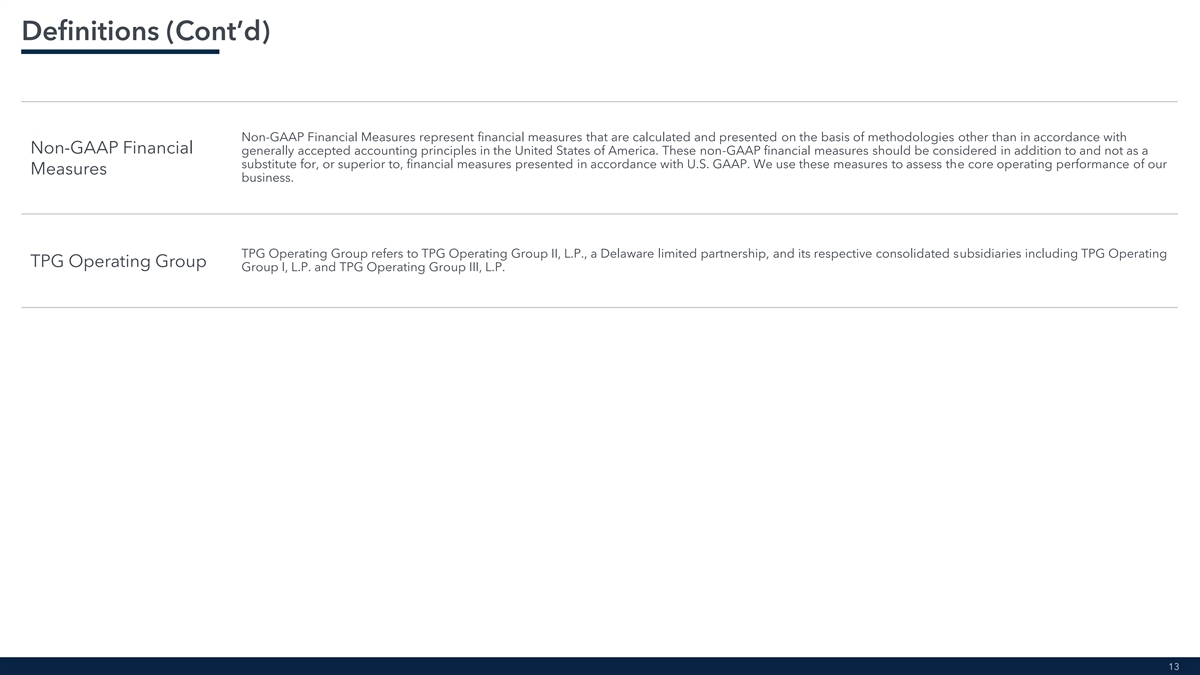 Definitions (Cont’d) Non-GAAP Financial Measures represent financial measures that are calculated and presented on the basis of methodologies other than in accordance with Non-GAAP Financial generally accepted accounting principles in the United States of America. These non-GAAP financial measures should be considered in addition to and not as a substitute for, or superior to, financial measures presented in accordance with U.S. GAAP. We use these measures to assess the core operating performance of our Measures business. TPG Operating Group refers to TPG Operating Group II, L.P., a Delaware limited partnership, and its respective consolidated subsidiaries including TPG Operating TPG Operating Group Group I, L.P. and TPG Operating Group III, L.P. 13