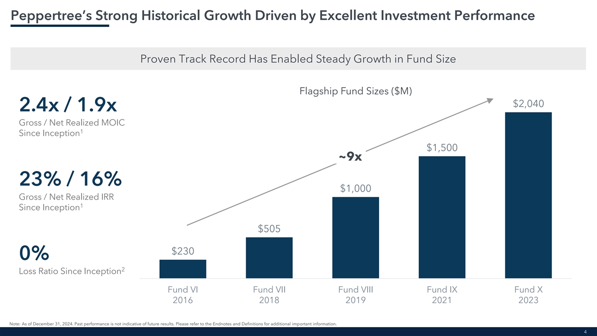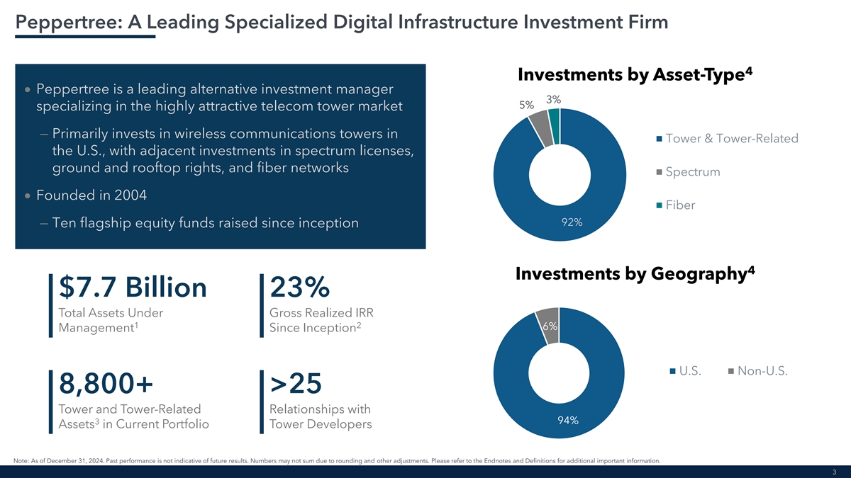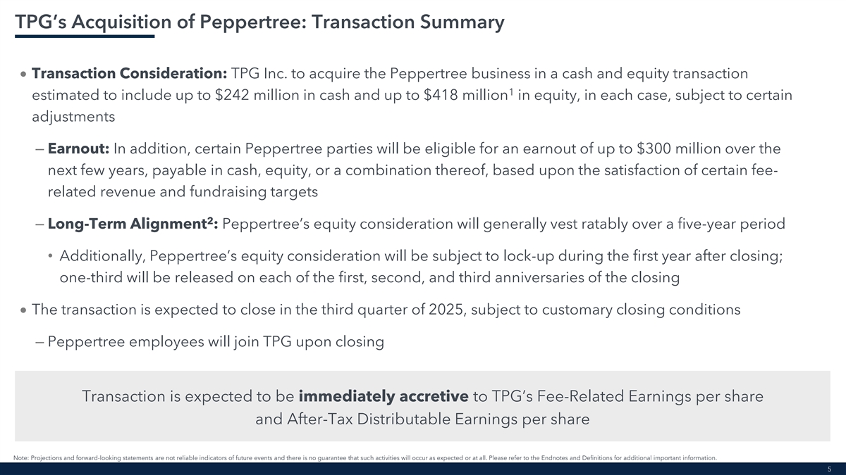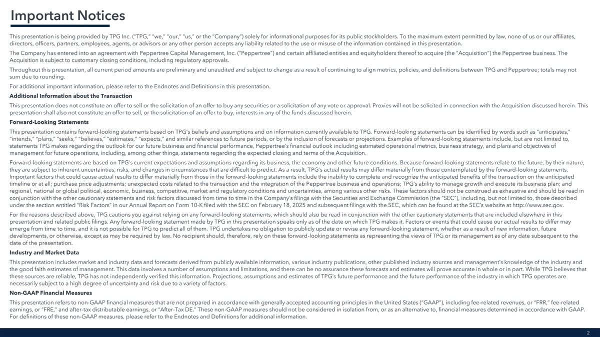 Important Notices This presentation is being provided by TPG Inc. (“TPG,” “we,” “our,” “us,” or the “Company”) solely for informational purposes for its public stockholders. To the maximum extent permitted by law, none of us or our affiliates, directors, officers, partners, employees, agents, or advisors or any other person accepts any liability related to the use or misuse of the information contained in this presentation. The Company has entered into an agreement with Peppertree Capital Management, Inc. (“Peppertree”) and certain affiliated entities and equityholders thereof to acquire (the “Acquisition”) the Peppertree business. The Acquisition is subject to customary closing conditions, including regulatory approvals. Throughout this presentation, all current period amounts are preliminary and unaudited and subject to change as a result of continuing to align metrics, policies, and definitions between TPG and Peppertree; totals may not sum due to rounding. For additional important information, please refer to the Endnotes and Definitions in this presentation. Additional Information about the Transaction This presentation does not constitute an offer to sell or the solicitation of an offer to buy any securities or a solicitation of any vote or approval. Proxies will not be solicited in connection with the Acquisition discussed herein. This presentation shall also not constitute an offer to sell, or the solicitation of an offer to buy, interests in any of the funds discussed herein. Forward-Looking Statements This presentation contains forward-looking statements based on TPG’s beliefs and assumptions and on information currently available to TPG. Forward-looking statements can be identified by words such as “anticipates,” “intends,” “plans,” “seeks,” “believes,” “estimates,” “expects,” and similar references to future periods, or by the inclusion of forecasts or projections. Examples of forward-looking statements include, but are not limited to, statements TPG makes regarding the outlook for our future business and financial performance, Peppertree’s financial outlook including estimated operational metrics, business strategy, and plans and objectives of management for future operations, including, among other things, statements regarding the expected closing and terms of the Acquisition. Forward-looking statements are based on TPG’s current expectations and assumptions regarding its business, the economy and other future conditions. Because forward-looking statements relate to the future, by their nature, they are subject to inherent uncertainties, risks, and changes in circumstances that are difficult to predict. As a result, TPG’s actual results may differ materially from those contemplated by the forward-looking statements. Important factors that could cause actual results to differ materially from those in the forward-looking statements include the inability to complete and recognize the anticipated benefits of the transaction on the anticipated timeline or at all; purchase price adjustments; unexpected costs related to the transaction and the integration of the Peppertree business and operations; TPG’s ability to manage growth and execute its business plan; and regional, national or global political, economic, business, competitive, market and regulatory conditions and uncertainties, among various other risks. These factors should not be construed as exhaustive and should be read in conjunction with the other cautionary statements and risk factors discussed from time to time in the Company’s filings with the Securities and Exchange Commission (the “SEC”), including, but not limited to, those described under the section entitled “Risk Factors” in our Annual Report on Form 10-K filed with the SEC on February 18, 2025 and subsequent filings with the SEC, which can be found at the SEC’s website at http://www.sec.gov. For the reasons described above, TPG cautions you against relying on any forward-looking statements, which should also be read in conjunction with the other cautionary statements that are included elsewhere in this presentation and related public filings. Any forward-looking statement made by TPG in this presentation speaks only as of the date on which TPG makes it. Factors or events that could cause our actual results to differ may emerge from time to time, and it is not possible for TPG to predict all of them. TPG undertakes no obligation to publicly update or revise any forward-looking statement, whether as a result of new information, future developments, or otherwise, except as may be required by law. No recipient should, therefore, rely on these forward-looking statements as representing the views of TPG or its management as of any date subsequent to the date of the presentation. Industry and Market Data This presentation includes market and industry data and forecasts derived from publicly available information, various industry publications, other published industry sources and management’s knowledge of the industry and the good faith estimates of management. This data involves a number of assumptions and limitations, and there can be no assurance these forecasts and estimates will prove accurate in whole or in part. While TPG believes that these sources are reliable, TPG has not independently verified this information. Projections, assumptions and estimates of TPG’s future performance and the future performance of the industry in which TPG operates are necessarily subject to a high degree of uncertainty and risk due to a variety of factors. Non-GAAP Financial Measures This presentation refers to non-GAAP financial measures that are not prepared in accordance with generally accepted accounting principles in the United States (“GAAP”), including fee-related revenues, or “FRR,” fee-related earnings, or “FRE,” and after-tax distributable earnings, or “After-Tax DE.” The