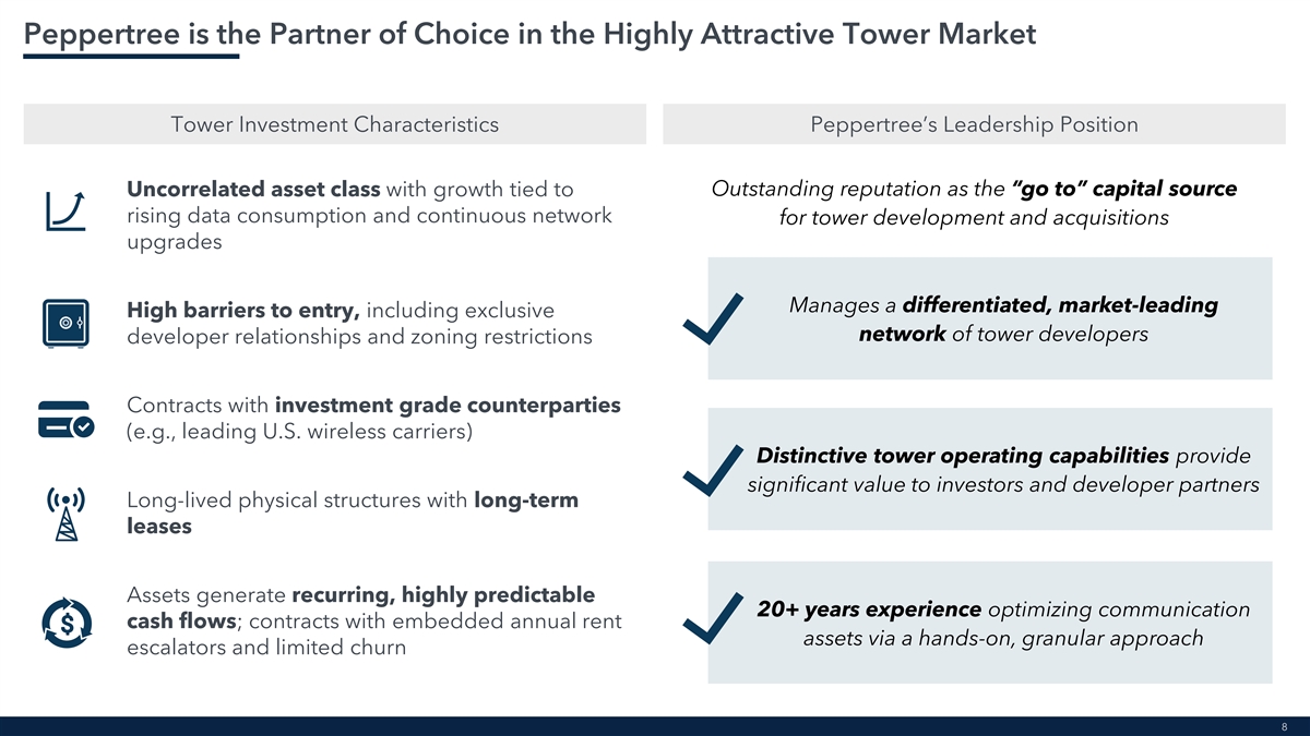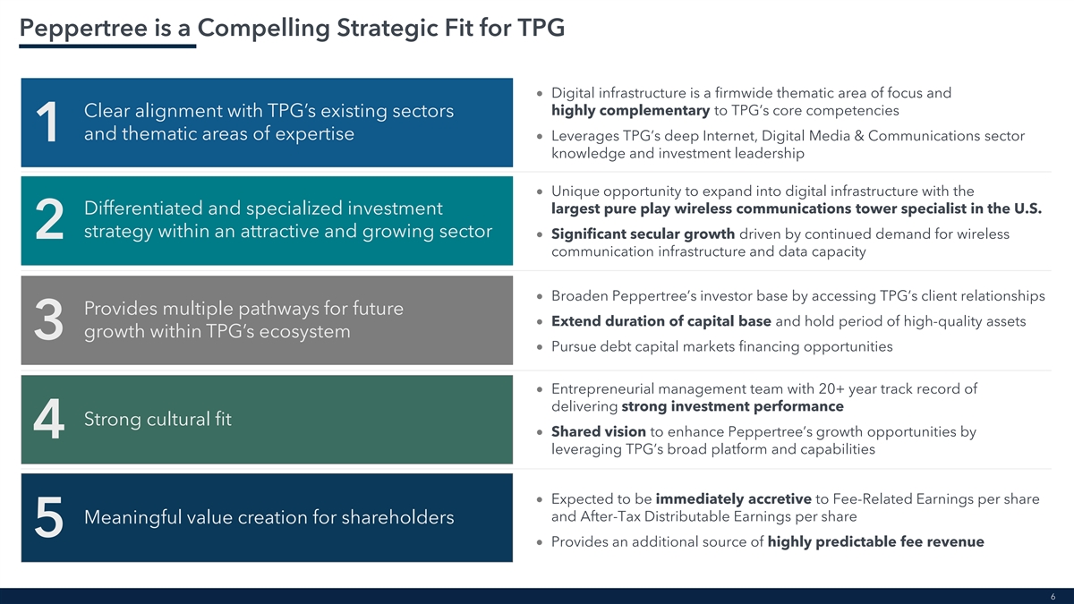 Peppertree is a Compelling Strategic Fit for TPG • Digital infrastructure is a firmwide thematic area of focus and highly complementary to TPG’s core competencies Clear alignment with TPG’s existing sectors and thematic areas of expertise • Leverages TPG’s deep Internet, Digital Media & Communications sector 1 knowledge and investment leadership • Unique opportunity to expand into digital infrastructure with the largest pure play wireless communications tower specialist in the U.S. Differentiated and specialized investment strategy within an attractive and growing sector 2• Significant secular growth driven by continued demand for wireless communication infrastructure and data capacity • Broaden Peppertree’s investor base by accessing TPG’s client relationships Provides multiple pathways for future • Extend duration of capital base and hold period of high-quality assets growth within TPG’s ecosystem 3 • Pursue debt capital markets financing opportunities • Entrepreneurial management team with 20+ year track record of delivering strong investment performance Strong cultural fit • Shared vision to enhance Peppertree’s growth opportunities by 4 leveraging TPG’s broad platform and capabilities • Expected to be immediately accretive to Fee-Related Earnings per share and After-Tax Distributable Earnings per share Meaningful value creation for shareholders 5 • Provides an additional source of highly predictable fee revenue 6