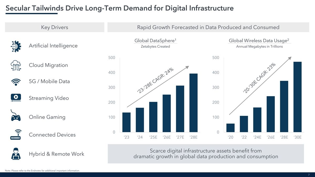 Secular Tailwinds Drive Long-Term Demand for Digital Infrastructure Key Drivers Rapid Growth Forecasted in Data Produced and Consumed 1 2 Global DataSphere Global Wireless Data Usage Artificial Intelligence Zetabytes Created Annual Megabytes in Trillions 500 500 Cloud Migration 400 400 5G / Mobile Data 300 300 Streaming Video 200 200 100 100 Online Gaming 0 0 Connected Devices '23 '24 '25E '26E '27E '28E '20 '22 '24E '26E '28E '30E Scarce digital infrastructure assets benefit from Hybrid & Remote Work dramatic growth in global data production and consumption Note: Please refer to the Endnotes for additional important information. 7