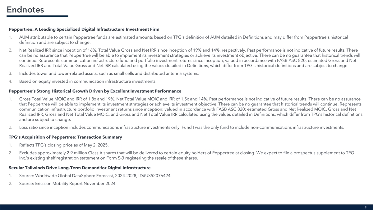 Endnotes Peppertree: A Leading Specialized Digital Infrastructure Investment Firm 1. AUM attributable to certain Peppertree funds are estimated amounts based on TPG's definition of AUM detailed in Definitions and may differ from Peppertree's historical definition and are subject to change. 2. Net Realized IRR since inception of 16%. Total Value Gross and Net IRR since inception of 19% and 14%, respectively. Past performance is not indicative of future results. There can be no assurance that Peppertree will be able to implement its investment strategies or achieve its investment objective. There can be no guarantee that historical trends will continue. Represents communication infrastructure fund and portfolio investment returns since inception; valued in accordance with FASB ASC 820; estimated Gross and Net Realized IRR and Total Value Gross and Net IRR calculated using the values detailed in Definitions, which differ from TPG's historical definitions and are subject to change. 3. Includes tower and tower-related assets, such as small cells and distributed antenna systems. 4. Based on equity invested in communication infrastructure investments. Peppertree’s Strong Historical Growth Driven by Excellent Investment Performance 1. Gross Total Value MOIC and IRR of 1.8x and 19%. Net Total Value MOIC and IRR of 1.5x and 14%. Past performance is not indicative of future results. There can be no assurance that Peppertree will be able to implement its investment strategies or achieve its investment objective. There can be no guarantee that historical trends will continue. Represents communication infrastructure portfolio investment returns since inception; valued in accordance with FASB ASC 820; estimated Gross and Net Realized MOIC, Gross and Net Realized IRR, Gross and Net Total Value MOIC, and Gross and Net Total Value IRR calculated using the values detailed in Definitions, which differ from TPG's historical definitions and are subject to change. 2. Loss ratio since inception includes communications infrastructure investments only. Fund I was the only fund to include non-communications infrastructure investments. TPG’s Acquisition of Peppertree: Transaction Summary 1. Reflects TPG’s closing price as of May 2, 2025. 2. Excludes approximately 2.9 million Class A shares that will be delivered to certain equity holders of Peppertree at closing. We expect to file a prospectus supplement to TPG Inc.’s existing shelf registration statement on Form S-3 registering the resale of these shares. Secular Tailwinds Drive Long-Term Demand for Digital Infrastructure 1. Source: Worldwide Global DataSphere Forecast, 2024-2028, ID#US52076424. 2. Source: Ericsson Mobility Report November 2024. 9