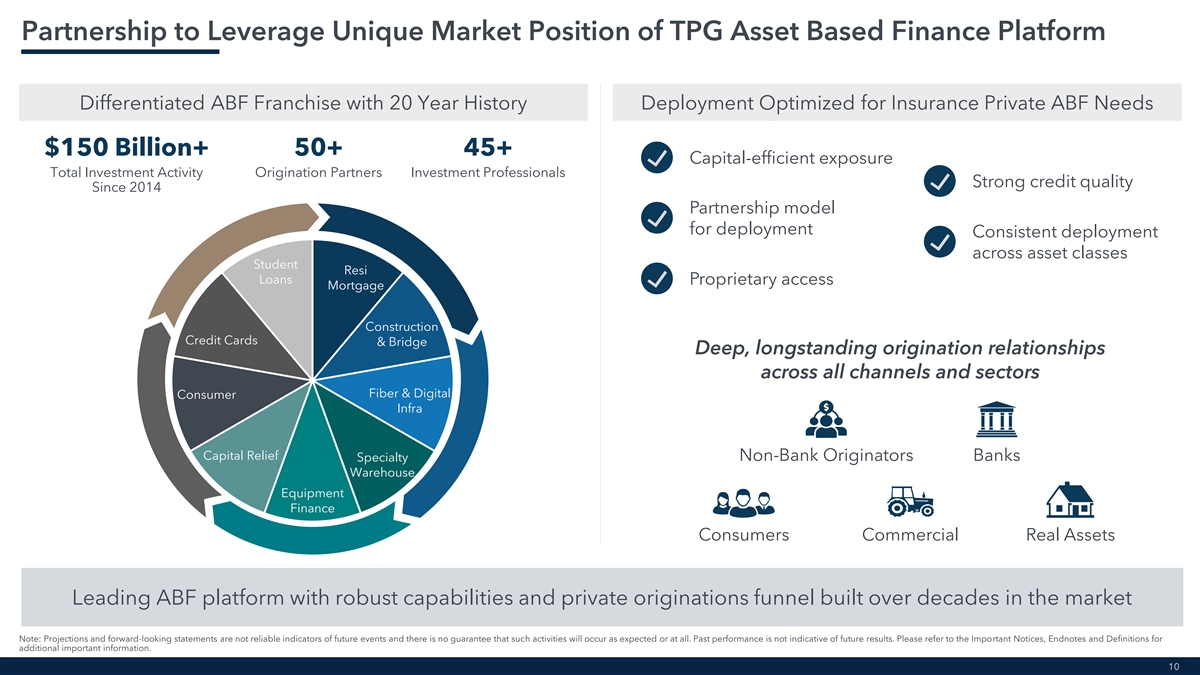 TPG Credit: A Premier Platform with Differentiated Origination Capabilities TPG Credit: Specialization at Scale Proprietary Consistency of Deep Asset “Win-Win” Middle Market Asset Based Origination & Teams Investing Class & Sector Partnerships 1 2 3 4 Direct Lending Finance Structuring Through Cycles Expertise Strong Origination Engines Across Key Channels Real Middle Market Asset Based 3 Credit Solutions 2 3 Estate Sponsors Finance Credit Credit Solutions ~1,000 140+ 50+ Unique Sponsors Providing Deal Flow Unique Corporate Origination Liquid Credit Partners Since 2019 Partners 2,100+ Deals Closed Since Inception $21 Billion+ $30 Billion+ Homebuilding Historical Residential $42 Billion+ Projects Financed Mortgage Deployment $86 Billion Direct Lending Capital Since Inception Committed Since Inception 1 Assets Under Management Note: Projections and forward-looking statements are not reliable indicators of future events and there is no guarantee that such activities will occur as expected or at all. Past performance is not indicative of future results. Please refer to the Important Notices, Endnotes and Definitions for additional important information. 9