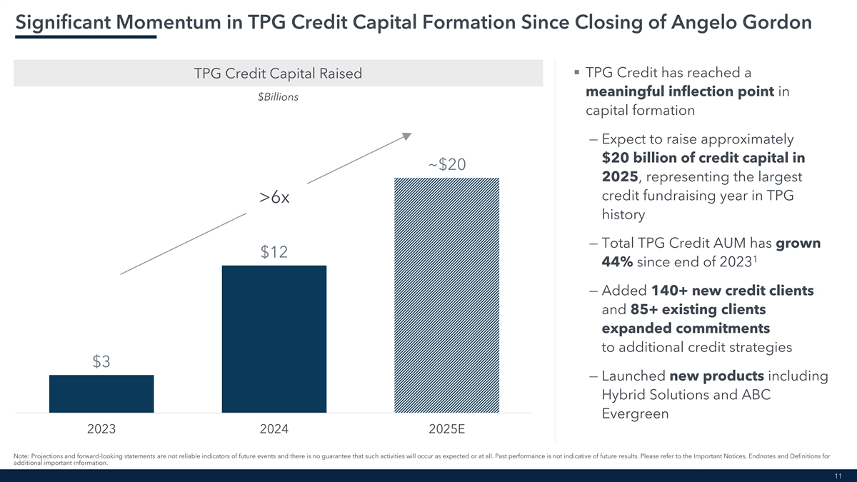 Partnership to Leverage Unique Market Position of TPG Asset Based Finance Platform Differentiated ABF Franchise with 20 Year History Deployment Optimized for Insurance Private ABF Needs $150 Billion+ 50+ 45+ Capital-efficient exposure Total Investment Activity Origination Partners Investment Professionals Strong credit quality Since 2014 Partnership model for deployment Consistent deployment across asset classes Student Resi Loans Proprietary access Mortgage Construction Credit Cards & Bridge Deep, longstanding origination relationships across all channels and sectors Fiber & Digital Consumer Infra Capital Relief Specialty Non-Bank Originators Banks Warehouse Equipment Finance Consumers Commercial Real Assets Leading ABF platform with robust capabilities and private originations funnel built over decades in the market Note: Projections and forward-looking statements are not reliable indicators of future events and there is no guarantee that such activities will occur as expected or at all. Past performance is not indicative of future results. Please refer to the Important Notices, Endnotes and Definitions for additional important information. 10