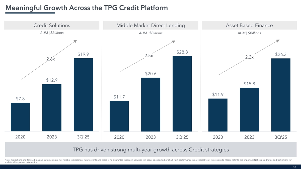 Significant Momentum in TPG Credit Capital Formation Since Closing of Angelo Gordon ▪ TPG Credit has reached a TPG Credit Capital Raised meaningful inflection point in $Billions capital formation – Expect to raise approximately $20 billion of credit capital in ~$20 2025, representing the largest credit fundraising year in TPG >6x history – Total TPG Credit AUM has grown $12 1 44% since end of 2023 – Added 140+ new credit clients and 85+ existing clients expanded commitments to additional credit strategies $3 – Launched new products including Hybrid Solutions and ABC Evergreen 2023 2024 2025E Note: Projections and forward-looking statements are not reliable indicators of future events and there is no guarantee that such activities will occur as expected or at all. Past performance is not indicative of future results. Please refer to the Important Notices, Endnotes and Definitions for additional important information. 11