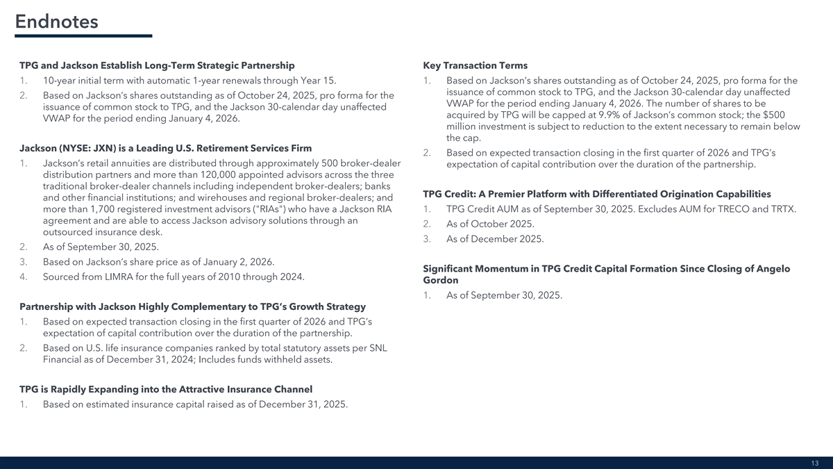 Endnotes TPG and Jackson Establish Long-Term Strategic Partnership Key Transaction Terms 1. 10-year initial term with automatic 1-year renewals through Year 15. 1. Based on Jackson’s shares outstanding as of October 24, 2025, pro forma for the issuance of common stock to TPG, and the Jackson 30-calendar day unaffected 2. Based on Jackson’s shares outstanding as of October 24, 2025, pro forma for the VWAP for the period ending January 4, 2026. The number of shares to be issuance of common stock to TPG, and the Jackson 30-calendar day unaffected acquired by TPG will be capped at 9.9% of Jackson’s common stock; the $500 VWAP for the period ending January 4, 2026. million investment is subject to reduction to the extent necessary to remain below the cap. Jackson (NYSE: JXN) is a Leading U.S. Retirement Services Firm 2. Based on expected transaction closing in the first quarter of 2026 and TPG’s 1. Jackson’s retail annuities are distributed through approximately 500 broker-dealer expectation of capital contribution over the duration of the partnership. distribution partners and more than 120,000 appointed advisors across the three traditional broker-dealer channels including independent broker-dealers; banks TPG Credit: A Premier Platform with Differentiated Origination Capabilities and other financial institutions; and wirehouses and regional broker-dealers; and more than 1,700 registered investment advisors ( RIAs ) who have a Jackson RIA 1. TPG Credit AUM as of September 30, 2025. Excludes AUM for TRECO and TRTX. agreement and are able to access Jackson advisory solutions through an 2. As of October 2025. outsourced insurance desk. 3. As of December 2025. 2. As of September 30, 2025. 3. Based on Jackson’s share price as of January 2, 2026. Significant Momentum in TPG Credit Capital Formation Since Closing of Angelo 4. Sourced from LIMRA for the full years of 2010 through 2024. Gordon 1. As of September 30, 2025. Partnership with Jackson Highly Complementary to TPG’s Growth Strategy 1. Based on expected transaction closing in the first quarter of 2026 and TPG’s expectation of capital contribution over the duration of the partnership. 2. Based on U.S. life insurance companies ranked by total statutory assets per SNL Financial as of December 31, 2024; Includes funds withheld assets. TPG is Rapidly Expanding into the Attractive Insurance Channel 1. Based on estimated insurance capital raised as of December 31, 2025. 13