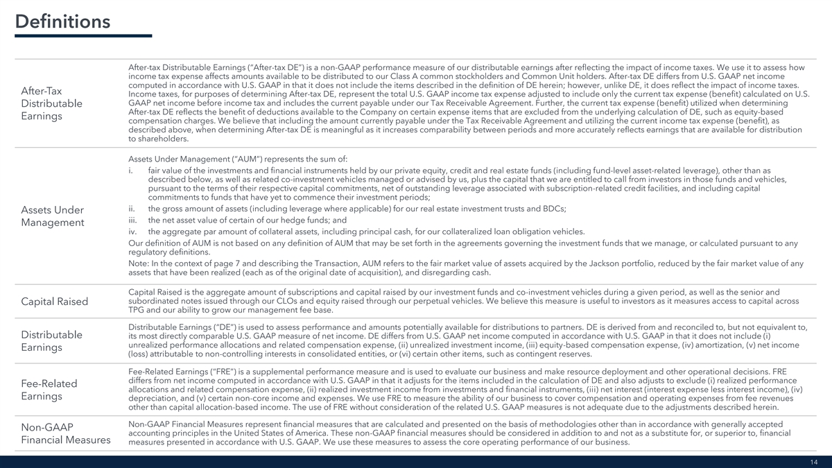 Definitions After-tax Distributable Earnings (“After-tax DE”) is a non-GAAP performance measure of our distributable earnings after reflecting the impact of income taxes. We use it to assess how income tax expense affects amounts available to be distributed to our Class A common stockholders and Common Unit holders. After-tax DE differs from U.S. GAAP net income computed in accordance with U.S. GAAP in that it does not include the items described in the definition of DE herein; however, unlike DE, it does reflect the impact of income taxes. After-Tax Income taxes, for purposes of determining After-tax DE, represent the total U.S. GAAP income tax expense adjusted to include only the current tax expense (benefit) calculated on U.S. GAAP net income before income tax and includes the current payable under our Tax Receivable Agreement. Further, the current tax expense (benefit) utilized when determining Distributable After-tax DE reflects the benefit of deductions available to the Company on certain expense items that are excluded from the underlying calculation of DE, such as equity-based Earnings compensation charges. We believe that including the amount currently payable under the Tax Receivable Agreement and utilizing the current income tax expense (benefit), as described above, when determining After-tax DE is meaningful as it increases comparability between periods and more accurately reflects earnings that are available for distribution to shareholders. Assets Under Management (“AUM”) represents the sum of: i. fair value of the investments and financial instruments held by our private equity, credit and real estate funds (including fund-level asset-related leverage), other than as described below, as well as related co-investment vehicles managed or advised by us, plus the capital that we are entitled to call from investors in those funds and vehicles, pursuant to the terms of their respective capital commitments, net of outstanding leverage associated with subscription-related credit facilities, and including capital commitments to funds that have yet to commence their investment periods; ii. the gross amount of assets (including leverage where applicable) for our real estate investment trusts and BDCs; Assets Under iii. the net asset value of certain of our hedge funds; and Management iv. the aggregate par amount of collateral assets, including principal cash, for our collateralized loan obligation vehicles. Our definition of AUM is not based on any definition of AUM that may be set forth in the agreements governing the investment funds that we manage, or calculated pursuant to any regulatory definitions. Note: In the context of page 7 and describing the Transaction, AUM refers to the fair market value of assets acquired by the Jackson portfolio, reduced by the fair market value of any assets that have been realized (each as of the original date of acquisition), and disregarding cash. Capital Raised is the aggregate amount of subscriptions and capital raised by our investment funds and co-investment vehicles during a given period, as well as the senior and subordinated notes issued through our CLOs and equity raised through our perpetual vehicles. We believe this measure is useful to investors as it measures access to capital across Capital Raised TPG and our ability to grow our management fee base. Distributable Earnings (“DE”) is used to assess performance and amounts potentially available for distributions to partners. DE is derived from and reconciled to, but not equivalent to, Distributable its most directly comparable U.S. GAAP measure of net income. DE differs from U.S. GAAP net income computed in accordance with U.S. GAAP in that it does not include (i) unrealized performance allocations and related compensation expense, (ii) unrealized investment income, (iii) equity-based compensation expense, (iv) amortization, (v) net income Earnings (loss) attributable to non-controlling interests in consolidated entities, or (vi) certain other items, such as contingent reserves. Fee-Related Earnings (“FRE”) is a supplemental performance measure and is used to evaluate our business and make resource deployment and other operational decisions. FRE differs from net income computed in accordance with U.S. GAAP in that it adjusts for the items included in the calculation of DE and also adjusts to exclude (i) realized performance Fee-Related allocations and related compensation expense, (ii) realized investment income from investments and financial instruments, (iii) net interest (interest expense less interest income), (iv) Earnings depreciation, and (v) certain non-core income and expenses. We use FRE to measure the ability of our business to cover compensation and operating expenses from fee revenues other than capital allocation-based income. The use of FRE without consideration of the related U.S. GAAP measures is not adequate due to the adjustments described herein. Non-GAAP Financial Measures represent financial measures that are calculated and presented on the basis of methodologies other than in accordance with generally accepted Non-GAAP accounting principles in the United States of America. These non-GAAP financial measures should be considered in addition to and not as a substitute for, or superior to, financial Financial Measures measures presented in accordance with U.S. GAAP. We use these measures to assess the core operating performance of our business. 14