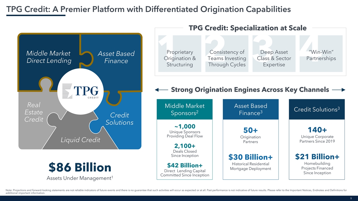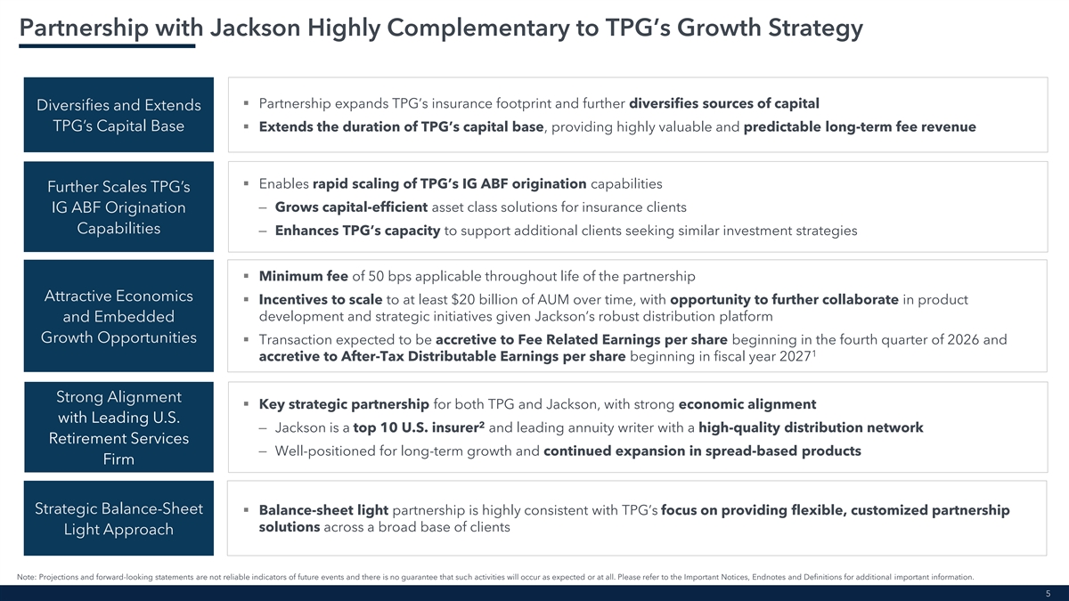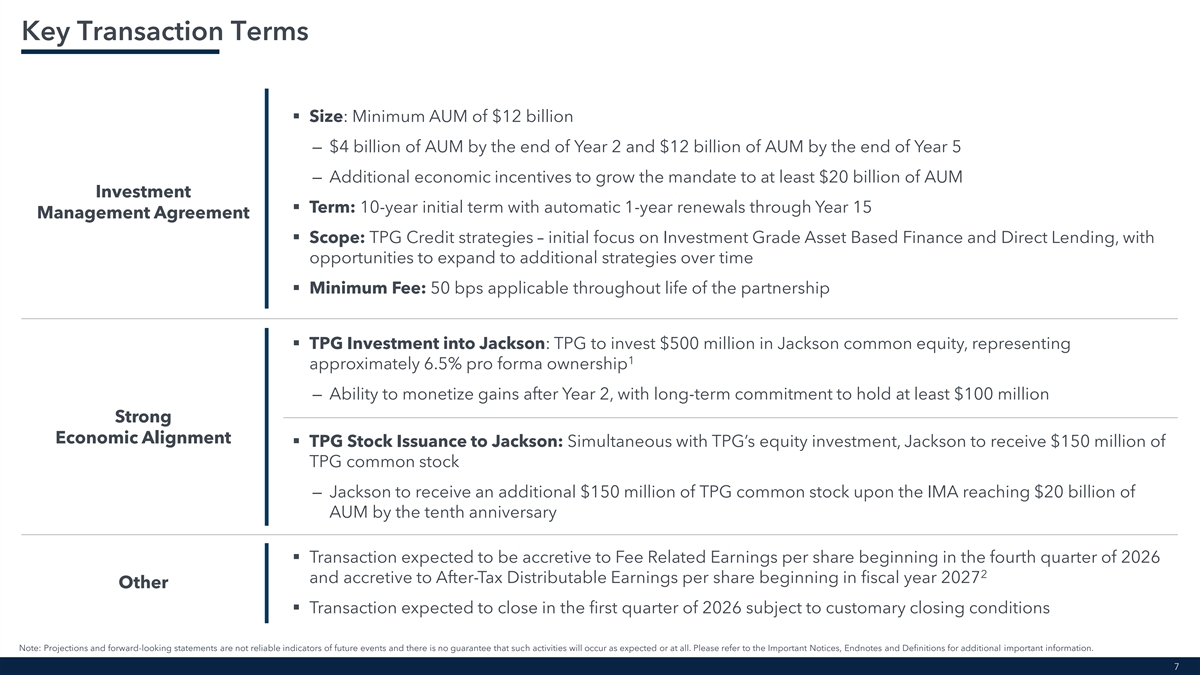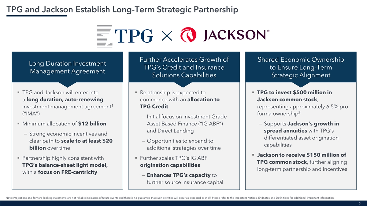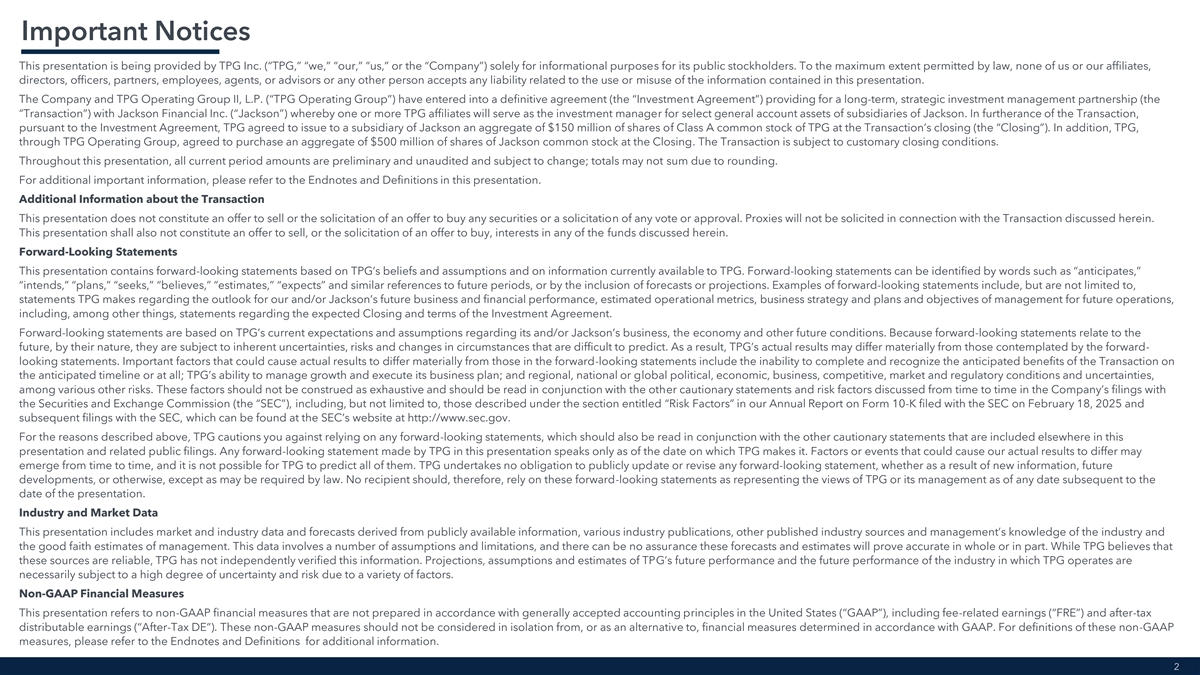 Important Notices This presentation is being provided by TPG Inc. (“TPG,” “we,” “our,” “us,” or the “Company”) solely for informational purposes for its public stockholders. To the maximum extent permitted by law, none of us or our affiliates, directors, officers, partners, employees, agents, or advisors or any other person accepts any liability related to the use or misuse of the information contained in this presentation. The Company and TPG Operating Group II, L.P. (“TPG Operating Group”) have entered into a definitive agreement (the “Investment Agreement”) providing for a long-term, strategic investment management partnership (the “Transaction”) with Jackson Financial Inc. (“Jackson”) whereby one or more TPG affiliates will serve as the investment manager for select general account assets of subsidiaries of Jackson. In furtherance of the Transaction, pursuant to the Investment Agreement, TPG agreed to issue to a subsidiary of Jackson an aggregate of $150 million of shares of Class A common stock of TPG at the Transaction’s closing (the “Closing”). In addition, TPG, through TPG Operating Group, agreed to purchase an aggregate of $500 million of shares of Jackson common stock at the Closing. The Transaction is subject to customary closing conditions. Throughout this presentation, all current period amounts are preliminary and unaudited and subject to change; totals may not sum due to rounding. For additional important information, please refer to the Endnotes and Definitions in this presentation. Additional Information about the Transaction This presentation does not constitute an offer to sell or the solicitation of an offer to buy any securities or a solicitation of any vote or approval. Proxies will not be solicited in connection with the Transaction discussed herein. This presentation shall also not constitute an offer to sell, or the solicitation of an offer to buy, interests in any of the funds discussed herein. Forward-Looking Statements This presentation contains forward-looking statements based on TPG’s beliefs and assumptions and on information currently available to TPG. Forward-looking statements can be identified by words such as “anticipates,” “intends,” “plans,” “seeks,” “believes,” “estimates,” “expects” and similar references to future periods, or by the inclusion of forecasts or projections. Examples of forward-looking statements include, but are not limited to, statements TPG makes regarding the outlook for our and/or Jackson’s future business and financial performance, estimated operational metrics, business strategy and plans and objectives of management for future operations, including, among other things, statements regarding the expected Closing and terms of the Investment Agreement. Forward-looking statements are based on TPG’s current expectations and assumptions regarding its and/or Jackson’s business, the economy and other future conditions. Because forward-looking statements relate to the future, by their nature, they are subject to inherent uncertainties, risks and changes in circumstances that are difficult to predict. As a result, TPG’s actual results may differ materially from those contemplated by the forward- looking statements. Important factors that could cause actual results to differ materially from those in the forward-looking statements include the inability to complete and recognize the anticipated benefits of the Transaction on the anticipated timeline or at all; TPG’s ability to manage growth and execute its business plan; and regional, national or global political, economic, business, competitive, market and regulatory conditions and uncertainties, among various other risks. These factors should not be construed as exhaustive and should be read in conjunction with the other cautionary statements and risk factors discussed from time to time in the Company’s filings with the Securities and Exchange Commission (the “SEC”), including, but not limited to, those described under the section entitled “Risk Factors” in our Annual Report on Form 10-K filed with the SEC on February 18, 2025 and subsequent filings with the SEC, which can be found at the SEC’s website at http://www.sec.gov. For the reasons described above, TPG cautions you against relying on any forward-looking statements, which should also be read in conjunction with the other cautionary statements that are included elsewhere in this presentation and related public filings. Any forward-looking statement made by TPG in this presentation speaks only as of the date on which TPG makes it. Factors or events that could cause our actual results to differ may emerge from time to time, and it is not possible for TPG to predict all of them. TPG undertakes no obligation to publicly update or revise any forward-looking statement, whether as a result of new information, future developments, or otherwise, except as may be required by law. No recipient should, therefore, rely on these forward-looking statements as representing the views of TPG or its management as of any date subsequent to the date of the presentation. Industry and Market Data This presentation includes market and industry data and forecasts derived from publicly available information, various industry publications, other published industry sources and management’s knowledge of the industry and the good faith estimates of management. This data involves a number of assumptions and limitations, and there can be no assurance these forecasts and estimates will prove accurate in whole or in part. While TPG believes that these sources are reliable, TPG has not independently verified this information. Projections, assumptions and estimates of TPG’s future performance and the future performance of the industry in which TPG operates are necessarily subject to a high degree of uncertainty and risk due to a variety of factors. Non-GAAP Financial Mea