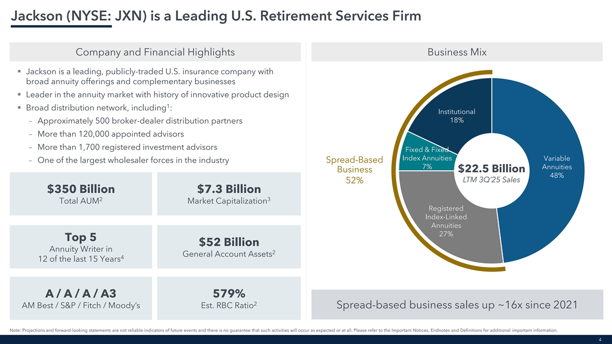 Jackson (NYSE: JXN) is a Leading U.S. Retirement Services Firm Company and Financial Highlights Business Mix ▪ Jackson is a leading, publicly-traded U.S. insurance company with broad annuity offerings and complementary businesses ▪ Leader in the annuity market with history of innovative product design 1 ▪ Broad distribution network, including : Institutional 18% – Approximately 500 broker-dealer distribution partners – More than 120,000 appointed advisors – More than 1,700 registered investment advisors Fixed & Fixed Index Annuities Variable – One of the largest wholesaler forces in the industry Spread-Based 7% Annuities Business $22.5 Billion 48% LTM 3Q’25 Sales 52% $350 Billion $7.3 Billion 2 3 Total AUM Market Capitalization Registered Index-Linked Annuities 27% Top 5 $52 Billion Annuity Writer in 2 General Account Assets 4 12 of the last 15 Years A / A / A / A3 579% 2 AM Best / S&P / Fitch / Moody’s Est. RBC Ratio Spread-based business sales up ~16x since 2021 Note: Projections and forward-looking statements are not reliable indicators of future events and there is no guarantee that such activities will occur as expected or at all. Please refer to the Important Notices, Endnotes and Definitions for additional important information. 4