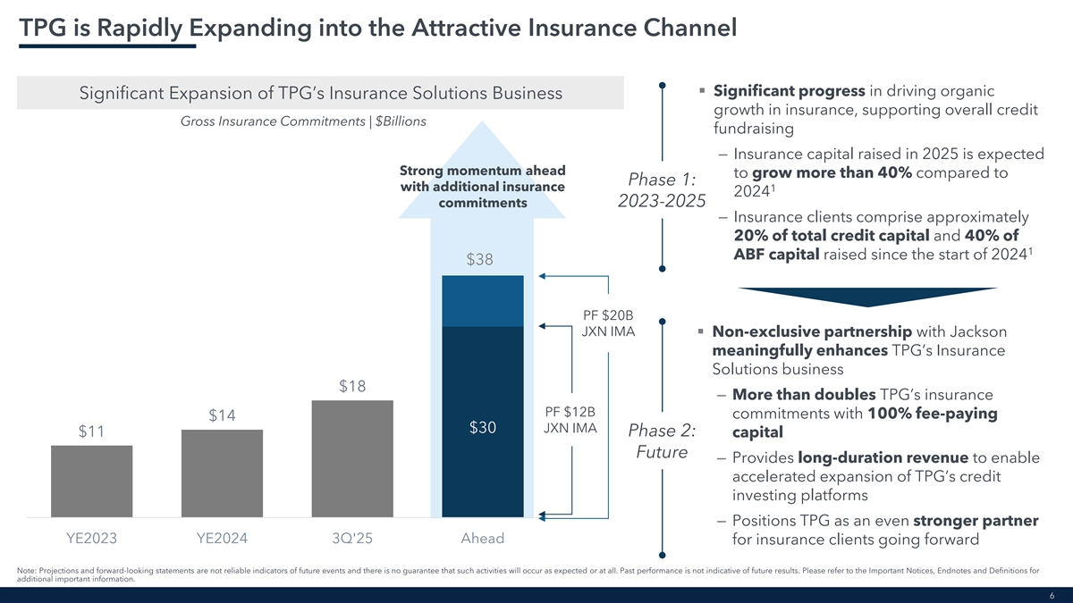 Partnership with Jackson Highly Complementary to TPG’s Growth Strategy ▪ Partnership expands TPG’s insurance footprint and further diversifies sources of capital Diversifies and Extends TPG’s Capital Base▪ Extends the duration of TPG’s capital base, providing highly valuable and predictable long-term fee revenue ▪ Enables rapid scaling of TPG’s IG ABF origination capabilities Further Scales TPG’s – Grows capital-efficient asset class solutions for insurance clients IG ABF Origination Capabilities – Enhances TPG’s capacity to support additional clients seeking similar investment strategies ▪ Minimum fee of 50 bps applicable throughout life of the partnership Attractive Economics ▪ Incentives to scale to at least $20 billion of AUM over time, with opportunity to further collaborate in product development and strategic initiatives given Jackson’s robust distribution platform and Embedded Growth Opportunities ▪ Transaction expected to be accretive to Fee Related Earnings per share beginning in the fourth quarter of 2026 and 1 accretive to After-Tax Distributable Earnings per share beginning in fiscal year 2027 Strong Alignment ▪ Key strategic partnership for both TPG and Jackson, with strong economic alignment with Leading U.S. 2 – Jackson is a top 10 U.S. insurer and leading annuity writer with a high-quality distribution network Retirement Services – Well-positioned for long-term growth and continued expansion in spread-based products Firm Strategic Balance-Sheet ▪ Balance-sheet light partnership is highly consistent with TPG’s focus on providing flexible, customized partnership solutions across a broad base of clients Light Approach Note: Projections and forward-looking statements are not reliable indicators of future events and there is no guarantee that such activities will occur as expected or at all. Please refer to the Important Notices, Endnotes and Definitions for additional important information. 5