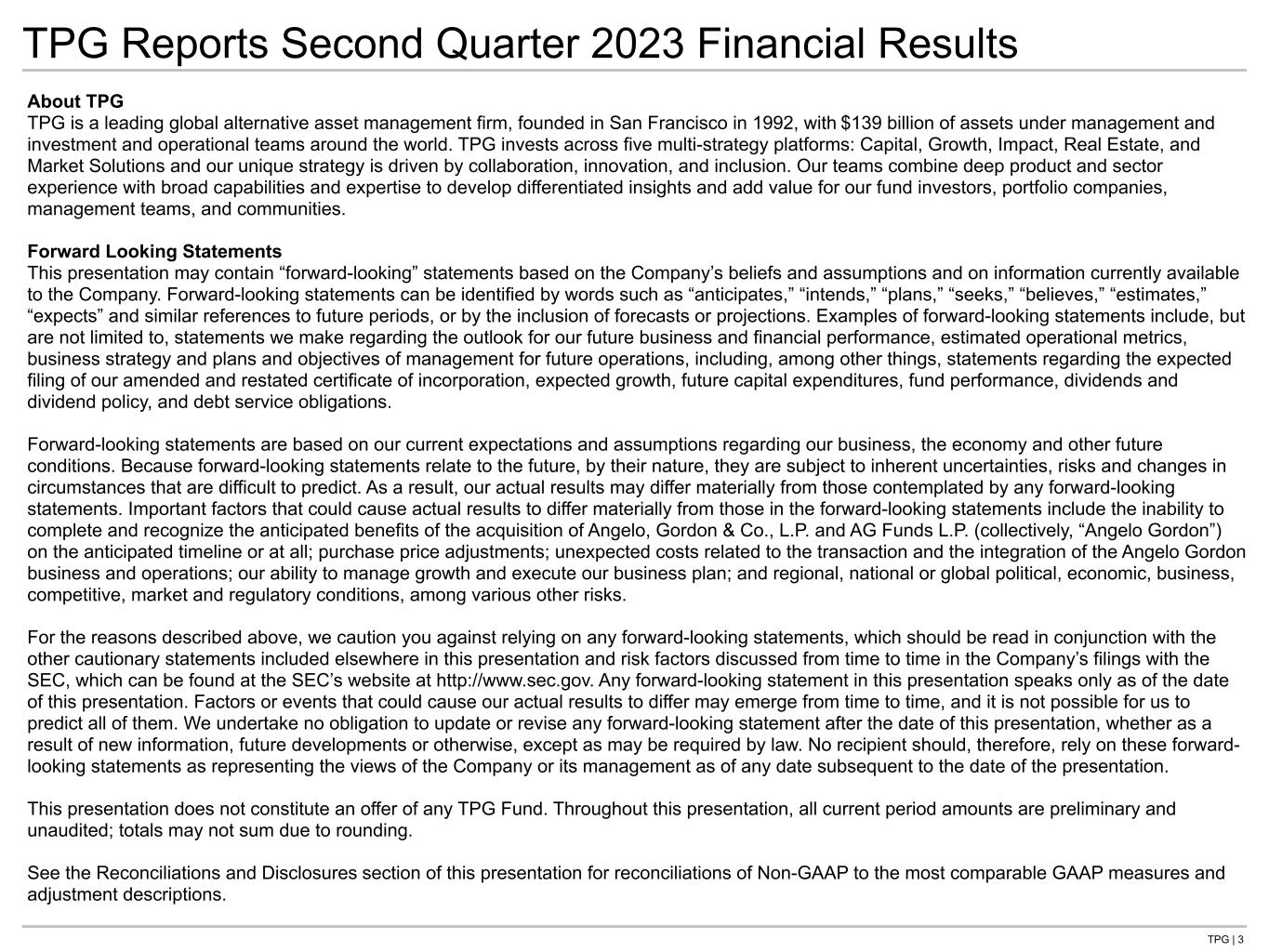 TPG | 3 TPG Reports Second Quarter 2023 Financial Results About TPG TPG is a leading global alternative asset management firm, founded in San Francisco in 1992, with $139 billion of assets under management and investment and operational teams around the world. TPG invests across five multi-strategy platforms: Capital, Growth, Impact, Real Estate, and Market Solutions and our unique strategy is driven by collaboration, innovation, and inclusion. Our teams combine deep product and sector experience with broad capabilities and expertise to develop differentiated insights and add value for our fund investors, portfolio companies, management teams, and communities. Forward Looking Statements This presentation may contain “forward-looking” statements based on the Company’s beliefs and assumptions and on information currently available to the Company. Forward-looking statements can be identified by words such as “anticipates,” “intends,” “plans,” “seeks,” “believes,” “estimates,” “expects” and similar references to future periods, or by the inclusion of forecasts or projections. Examples of forward-looking statements include, but are not limited to, statements we make regarding the outlook for our future business and financial performance, estimated operational metrics, business strategy and plans and objectives of management for future operations, including, among other things, statements regarding the expected filing of our amended and restated certificate of incorporation, expected growth, future capital expenditures, fund performance, dividends and dividend policy, and debt service obligations. Forward-looking statements are based on our current expectations and assumptions regarding our business, the economy and other future conditions. Because forward-looking statements relate to the future, by their nature, they are subject to inherent uncertainties, risks and changes in circumstances that are difficult to predict. As a result, our actual results may differ materially from those contemplated by any forward-looking statements. Important factors that could cause actual results to differ materially from those in the forward-looking statements include the inability to complete and recognize the anticipated benefits of the acquisition of Angelo, Gordon & Co., L.P. and AG Funds L.P. (collectively, “Angelo Gordon”) on the anticipated timeline or at all; purchase price adjustments; unexpected costs related to the transaction and the integration of the Angelo Gordon business and operations; our ability to manage growth and execute our business plan; and regional, national or global political, economic, business, competitive, market and regulatory conditions, among various other risks. For the reasons described above, we caution you against relying on any forward-looking statements, which should be read in conjunction with the other cautionary statements included elsewhere in this presentation and risk factors discussed from time to time in the Company’s filings with the SEC, which can be found at the SEC’s website at http://www.sec.gov. Any forward-looking statement in this presentation speaks only as of the date of this presentation. Factors or events that could cause our actual results to differ may emerge from time to time, and it is not possible for us to predict all of them. We undertake no obligation to update or revise any forward-looking statement after the date of this presentation, whether as a result of new information, future developments or otherwise, except as may be required by law. No recipient should, therefore, rely on these forward- looking statements as representing the views of the Company or its management as of any date subsequent to the date of the presentation. This presentation does not constitute an offer of any TPG Fund. Throughout this presentation, all current period amounts are preliminary and unaudited; totals may not sum due to rounding. See the Reconciliations and Disclosures section of this presentation for reconciliations of Non-GAAP to the most comparable GAAP measures and adjustment descriptions.