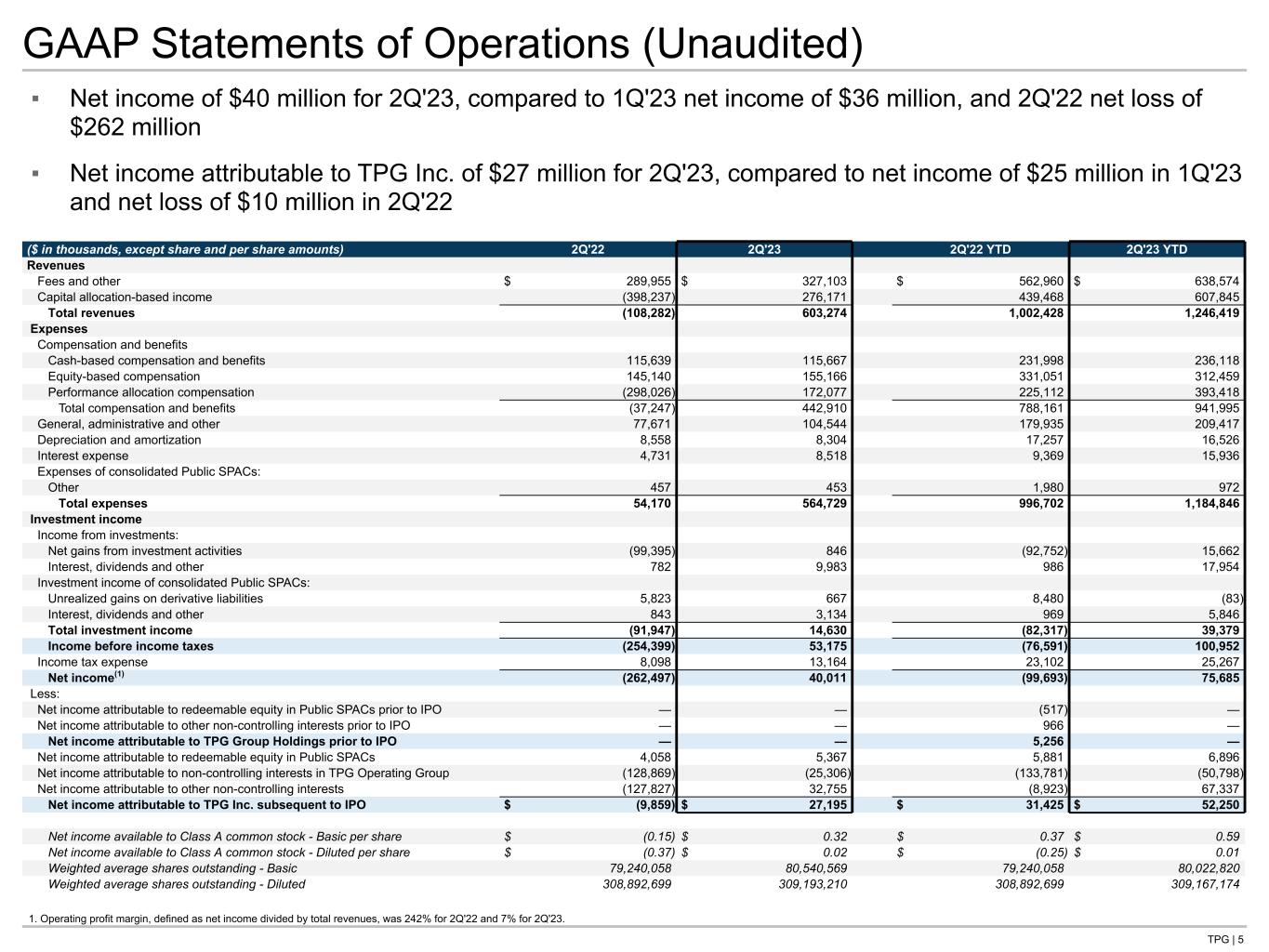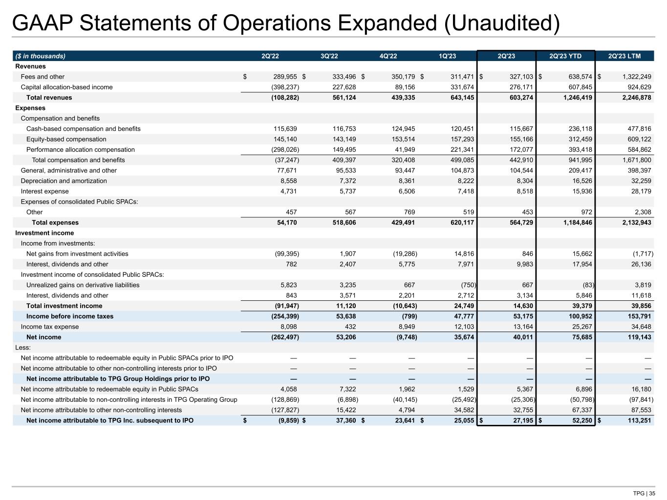 TPG | 35 GAAP Statements of Operations Expanded (Unaudited) ($ in thousands) 2Q'22 3Q'22 4Q'22 1Q'23 2Q'23 2Q'23 YTD 2Q'23 LTM Revenues Fees and other $ 289,955 $ 333,496 $ 350,179 $ 311,471 $ 327,103 $ 638,574 $ 1,322,249 Capital allocation-based income (398,237) 227,628 89,156 331,674 276,171 607,845 924,629 Total revenues (108,282) 561,124 439,335 643,145 603,274 1,246,419 2,246,878 Expenses Compensation and benefits Cash-based compensation and benefits 115,639 116,753 124,945 120,451 115,667 236,118 477,816 Equity-based compensation 145,140 143,149 153,514 157,293 155,166 312,459 609,122 Performance allocation compensation (298,026) 149,495 41,949 221,341 172,077 393,418 584,862 Total compensation and benefits (37,247) 409,397 320,408 499,085 442,910 941,995 1,671,800 General, administrative and other 77,671 95,533 93,447 104,873 104,544 209,417 398,397 Depreciation and amortization 8,558 7,372 8,361 8,222 8,304 16,526 32,259 Interest expense 4,731 5,737 6,506 7,418 8,518 15,936 28,179 Expenses of consolidated Public SPACs: Other 457 567 769 519 453 972 2,308 Total expenses 54,170 518,606 429,491 620,117 564,729 1,184,846 2,132,943 Investment income Income from investments: Net gains from investment activities (99,395) 1,907 (19,286) 14,816 846 15,662 (1,717) Interest, dividends and other 782 2,407 5,775 7,971 9,983 17,954 26,136 Investment income of consolidated Public SPACs: Unrealized gains on derivative liabilities 5,823 3,235 667 (750) 667 (83) 3,819 Interest, dividends and other 843 3,571 2,201 2,712 3,134 5,846 11,618 Total investment income (91,947) 11,120 (10,643) 24,749 14,630 39,379 39,856 Income before income taxes (254,399) 53,638 (799) 47,777 53,175 100,952 153,791 Income tax expense 8,098 432 8,949 12,103 13,164 25,267 34,648 Net income (262,497) 53,206 (9,748) 35,674 40,011 75,685 119,143 Less: Net income attributable to redeemable equity in Public SPACs prior to IPO — — — — — — — Net income attributable to other non-controlling interests prior to IPO — — — — — — — Net income attributable to TPG Group Holdings prior to IPO — — — — — — — Net income attributable to redeemable equity in Public SPACs 4,058 7,322 1,962 1,529 5,367 6,896 16,180 Net income attributable to non-controlling interests in TPG Operating Group (128,869) (6,898) (40,145) (25,492) (25,306) (50,798) (97,841) Net income attributable to other non-controlling interests (127,827) 15,422 4,794 34,582 32,755 67,337 87,553 Net income attributable to TPG Inc. subsequent to IPO $ (9,859) $ 37,360 $ 23,641 $ 25,055 $ 27,195 $ 52,250 $ 113,251