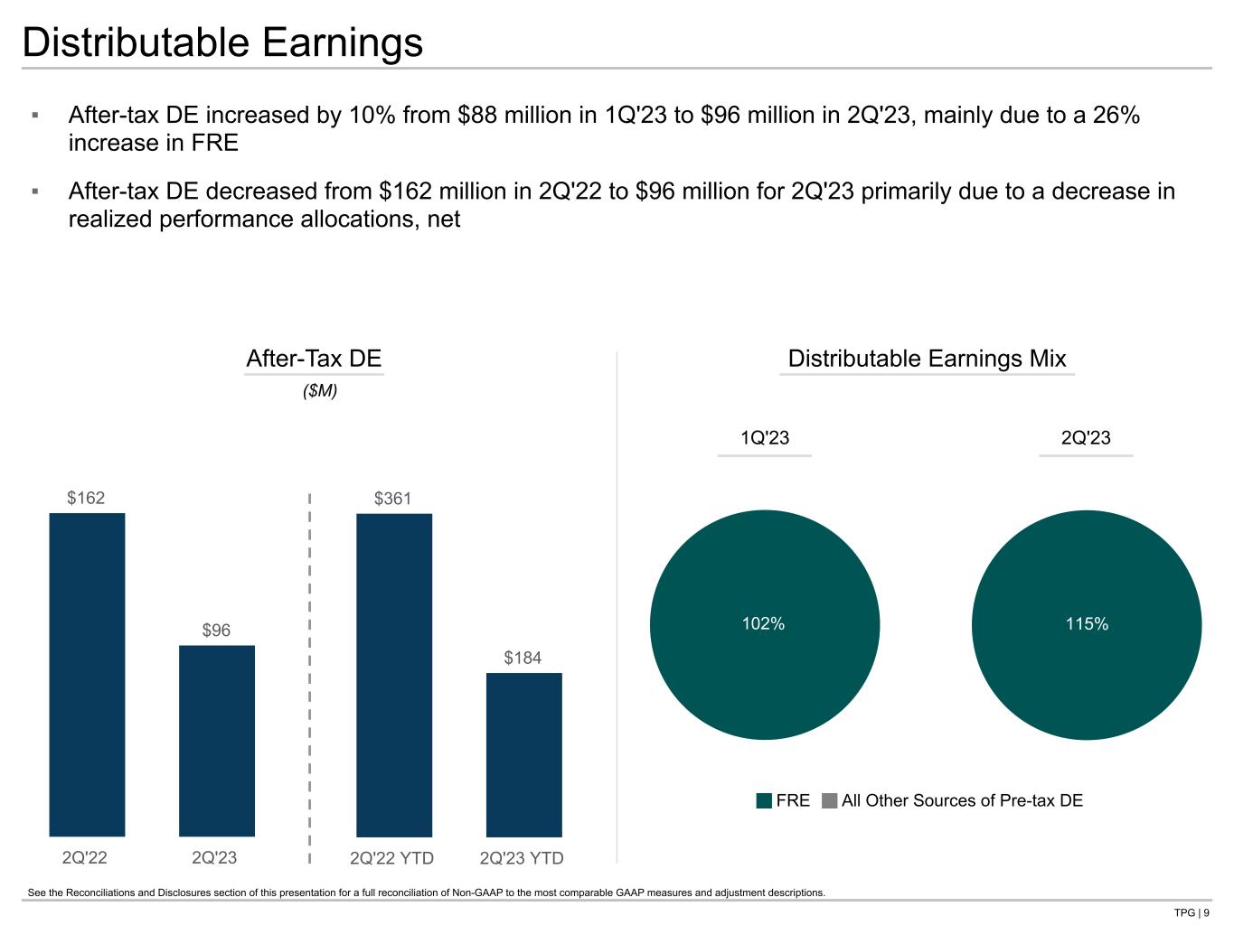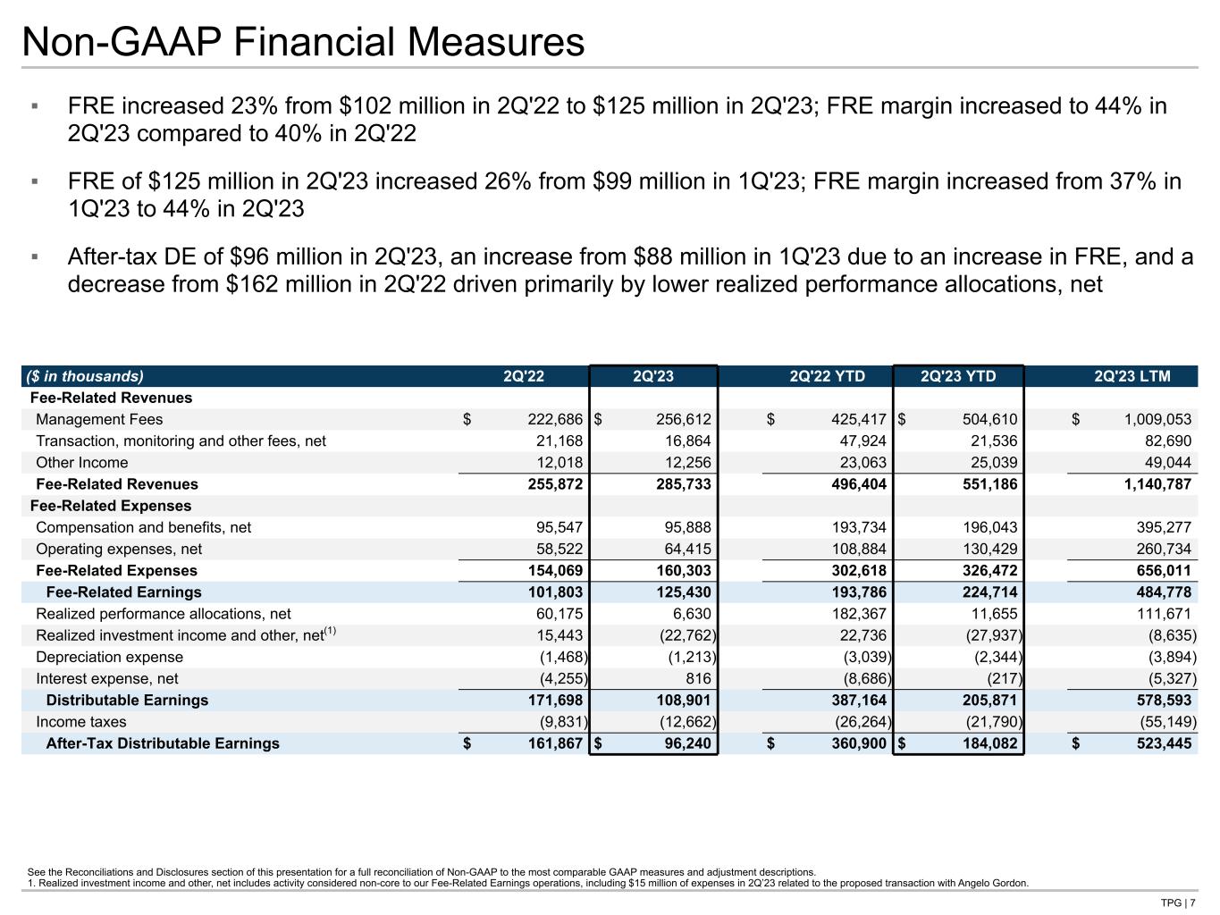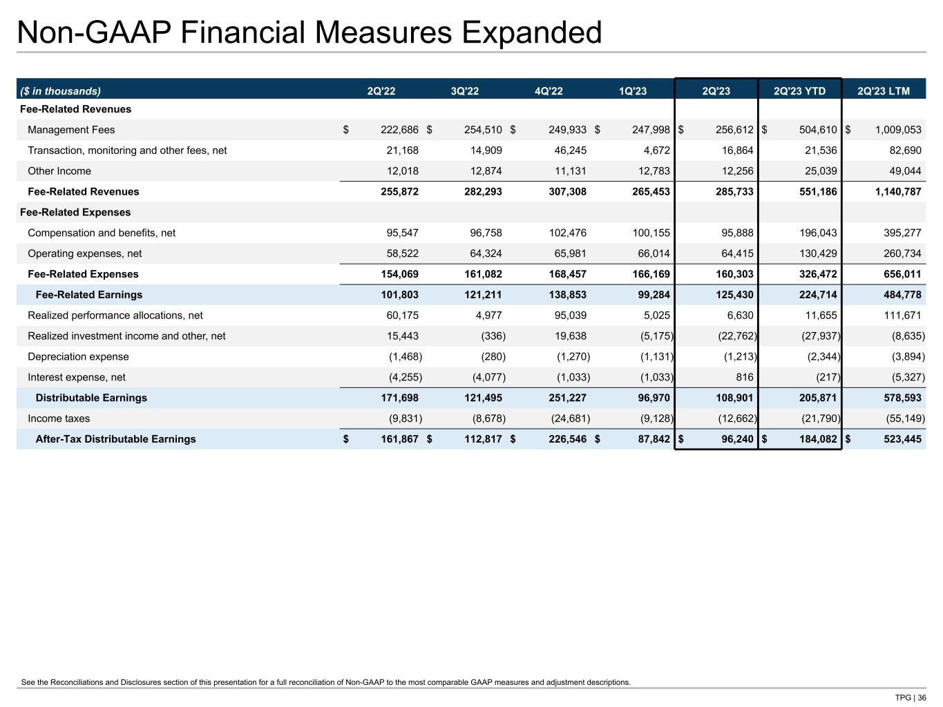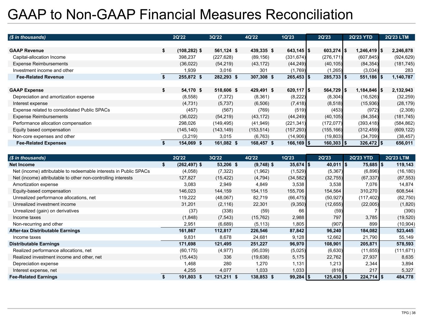 TPG | 38 GAAP to Non-GAAP Financial Measures Reconciliation ($ in thousands) 2Q'22 3Q'22 4Q'22 1Q'23 2Q'23 2Q'23 YTD 2Q'23 LTM GAAP Revenue $ (108,282) $ 561,124 $ 439,335 $ 643,145 $ 603,274 $ 1,246,419 $ 2,246,878 Capital-allocation Income 398,237 (227,628) (89,156) (331,674) (276,171) (607,845) (924,629) Expense Reimbursements (36,022) (54,219) (43,172) (44,249) (40,105) (84,354) (181,745) Investment income and other 1,939 3,016 301 (1,769) (1,265) (3,034) 283 Fee-Related Revenue $ 255,872 $ 282,293 $ 307,308 $ 265,453 $ 285,733 $ 551,186 $ 1,140,787 GAAP Expense $ 54,170 $ 518,606 $ 429,491 $ 620,117 $ 564,729 $ 1,184,846 $ 2,132,943 Depreciation and amortization expense (8,558) (7,372) (8,361) (8,222) (8,304) (16,526) (32,259) Interest expense (4,731) (5,737) (6,506) (7,418) (8,518) (15,936) (28,179) Expense related to consolidated Public SPACs (457) (567) (769) (519) (453) (972) (2,308) Expense Reimbursements (36,022) (54,219) (43,172) (44,249) (40,105) (84,354) (181,745) Performance allocation compensation 298,026 (149,495) (41,949) (221,341) (172,077) (393,418) (584,862) Equity based compensation (145,140) (143,149) (153,514) (157,293) (155,166) (312,459) (609,122) Non-core expenses and other (3,219) 3,015 (6,763) (14,906) (19,803) (34,709) (38,457) Fee-Related Expenses $ 154,069 $ 161,082 $ 168,457 $ 166,169 $ 160,303 $ 326,472 $ 656,011 ($ in thousands) 2Q'22 3Q'22 4Q'22 1Q'23 2Q'23 2Q'23 YTD 2Q'23 LTM Net Income $ (262,497) $ 53,206 $ (9,748) $ 35,674 $ 40,011 $ 75,685 $ 119,143 Net (income) attributable to redeemable interests in Public SPACs (4,058) (7,322) (1,962) (1,529) (5,367) (6,896) (16,180) Net (income) attributable to other non-controlling interests 127,827 (15,422) (4,794) (34,582) (32,755) (67,337) (87,553) Amortization expense 3,083 2,949 4,849 3,538 3,538 7,076 14,874 Equity-based compensation 146,023 144,159 154,115 155,706 154,564 310,270 608,544 Unrealized performance allocations, net 119,222 (48,067) 82,719 (66,475) (50,927) (117,402) (82,750) Unrealized investment income 31,201 (2,116) 22,301 (9,350) (12,655) (22,005) (1,820) Unrealized (gain) on derivatives (37) (338) (59) 66 (59) 7 (390) Income taxes (1,848) (7,543) (15,762) 2,988 797 3,785 (19,520) Non-recurring and other 2,951 (6,689) (5,113) 1,805 (907) 899 (10,904) After-tax Distributable Earnings 161,867 112,817 226,546 87,842 96,240 184,082 523,445 Income taxes 9,831 8,678 24,681 9,128 12,662 21,790 55,149 Distributable Earnings 171,698 121,495 251,227 96,970 108,901 205,871 578,593 Realized performance allocations, net (60,175) (4,977) (95,039) (5,025) (6,630) (11,655) (111,671) Realized investment income and other, net (15,443) 336 (19,638) 5,175 22,762 27,937 8,635 Depreciation expense 1,468 280 1,270 1,131 1,213 2,344 3,894 Interest expense, net 4,255 4,077 1,033 1,033 (816) 217 5,327 Fee-Related Earnings $ 101,803 $ 121,211 $ 138,853 $ 99,284 $ 125,430 $ 224,714 $ 484,778