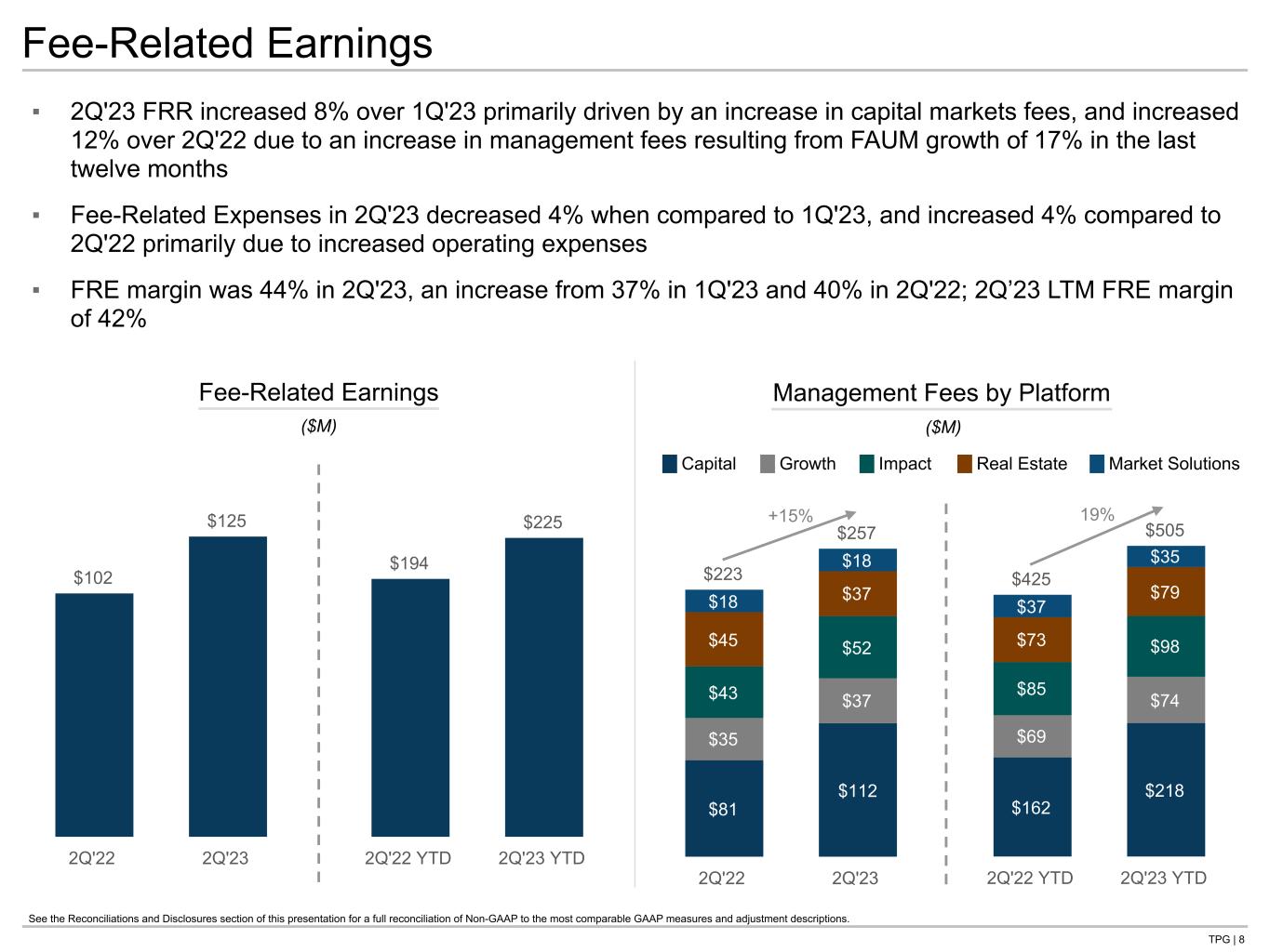 TPG | 7 Non-GAAP Financial Measures ▪ FRE increased 23% from $102 million in 2Q'22 to $125 million in 2Q'23; FRE margin increased to 44% in 2Q'23 compared to 40% in 2Q'22 ▪ FRE of $125 million in 2Q'23 increased 26% from $99 million in 1Q'23; FRE margin increased from 37% in 1Q'23 to 44% in 2Q'23 ▪ After-tax DE of $96 million in 2Q'23, an increase from $88 million in 1Q'23 due to an increase in FRE, and a decrease from $162 million in 2Q'22 driven primarily by lower realized performance allocations, net See the Reconciliations and Disclosures section of this presentation for a full reconciliation of Non-GAAP to the most comparable GAAP measures and adjustment descriptions. 1. Realized investment income and other, net includes activity considered non-core to our Fee-Related Earnings operations, including $15 million of expenses in 2Q’23 related to the proposed transaction with Angelo Gordon. ($ in thousands) 2Q'22 2Q'23 2Q'22 YTD 2Q'23 YTD 2Q'23 LTM Fee-Related Revenues Management Fees $ 222,686 $ 256,612 $ 425,417 $ 504,610 $ 1,009,053 Transaction, monitoring and other fees, net 21,168 16,864 47,924 21,536 82,690 Other Income 12,018 12,256 23,063 25,039 49,044 Fee-Related Revenues 255,872 285,733 496,404 551,186 1,140,787 Fee-Related Expenses Compensation and benefits, net 95,547 95,888 193,734 196,043 395,277 Operating expenses, net 58,522 64,415 108,884 130,429 260,734 Fee-Related Expenses 154,069 160,303 302,618 326,472 656,011 Fee-Related Earnings 101,803 125,430 193,786 224,714 484,778 Realized performance allocations, net 60,175 6,630 182,367 11,655 111,671 Realized investment income and other, net(1) 15,443 (22,762) 22,736 (27,937) (8,635) Depreciation expense (1,468) (1,213) (3,039) (2,344) (3,894) Interest expense, net (4,255) 816 (8,686) (217) (5,327) Distributable Earnings 171,698 108,901 387,164 205,871 578,593 Income taxes (9,831) (12,662) (26,264) (21,790) (55,149) After-Tax Distributable Earnings $ 161,867 $ 96,240 $ 360,900 $ 184,082 $ 523,445