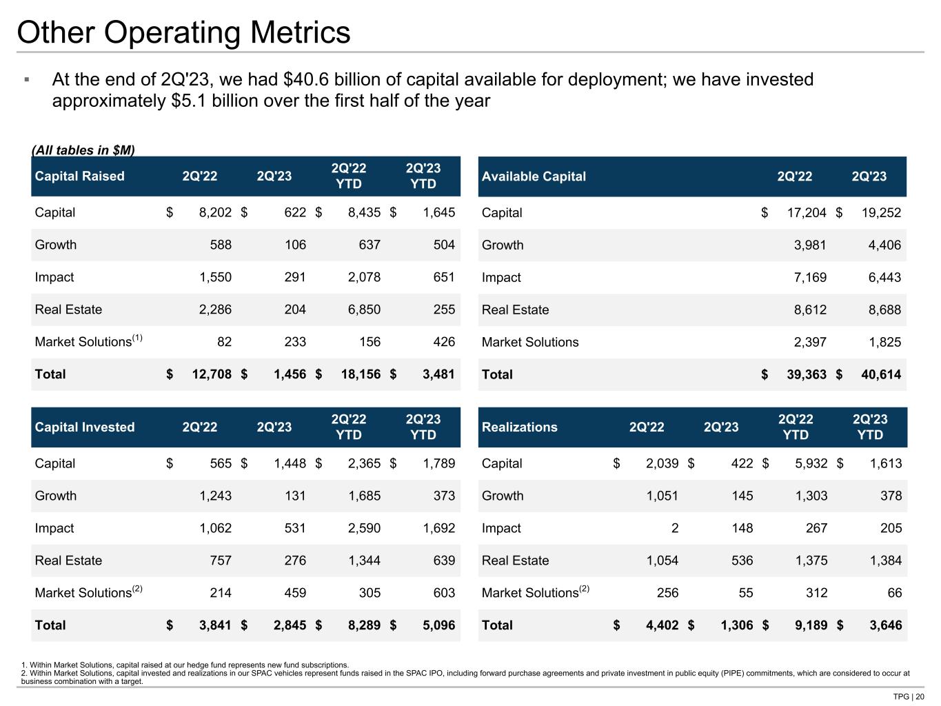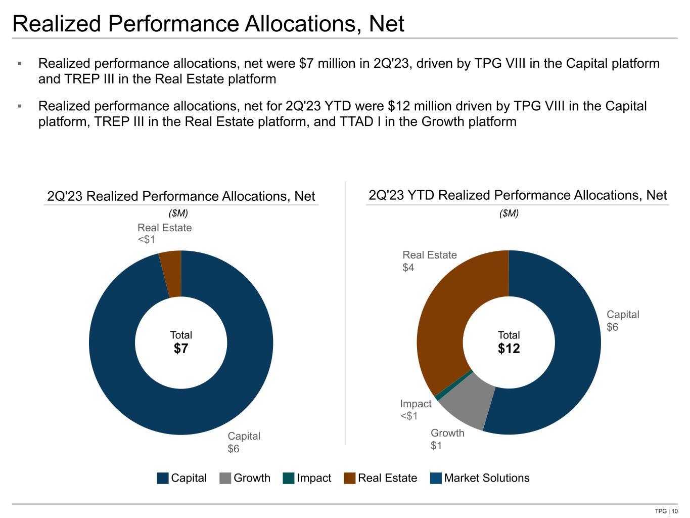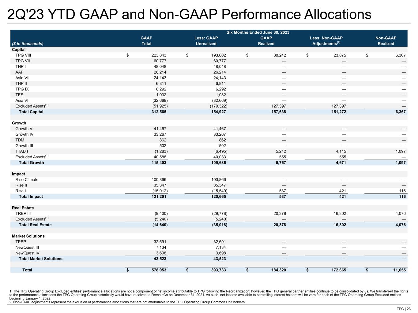 TPG | 22 2Q'23 GAAP and Non-GAAP Performance Allocations 1. The TPG Operating Group Excluded entities’ performance allocations are not a component of net income attributable to TPG following the Reorganization; however, the TPG general partner entities continue to be consolidated by us. We transferred the rights to the performance allocations the TPG Operating Group historically would have received to RemainCo on December 31, 2021. As such, net income available to controlling interest holders will be zero for each of the TPG Operating Group Excluded entities beginning January 1, 2022. 2. Non-GAAP adjustments represent the exclusion of performance allocations that are not attributable to the TPG Operating Group Common Unit holders. Three Months Ended June 30, 2023 GAAP Less: GAAP GAAP Less: Non-GAAP Non-GAAP ($ in thousands) Total Unrealized Realized Adjustments(2) Realized Capital TPG VIII $ 104,805 $ 74,562 $ 30,242 $ 23,875 $ 6,367 Asia VII 31,453 31,453 — — — THP I 13,663 13,663 — — — TPG VII 11,518 11,518 — — — TPG IX 4,578 4,578 — — — THP II 4,081 4,081 — — — AAF 3,229 3,229 — — — TES 513 513 — — — Asia VI (43,053) (43,053) — — — Excluded Assets(1) (3,556) (3,560) 3 3 — Total Capital 127,230 96,985 30,245 23,878 6,367 Growth Growth V 38,332 38,332 — — — Growth IV 23,807 23,807 — — — TTAD I (2,627) (2,627) — — — TDM (3,035) (3,035) — — — Growth III (4,566) (4,566) — — — Excluded Assets(1) 28,592 28,592 — — — Total Growth 80,504 80,504 — — — Impact Rise Climate 21,914 21,914 — — — Rise II 15,611 15,611 — — — Rise I (8,540) (8,540) — — — Total Impact 28,985 28,985 — — — Real Estate TREP III (4,654) (5,971) 1,317 1,054 263 Excluded Assets(1) (393) (393) — — — Total Real Estate (5,046) (6,363) 1,317 1,054 263 Market Solutions TPEP 24,980 24,980 — — — NewQuest IV 3,544 3,544 — — — NewQuest III 2,150 2,150 — — — Total Market Solutions 30,674 30,674 — — — Total $ 262,346 $ 230,784 $ 31,562 $ 24,932 $ 6,630