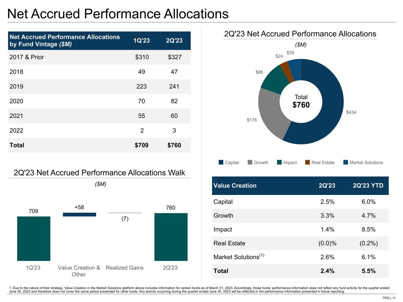 TPG | 11 709 +58 (7) 760 1Q'23 Value Creation & Other Realized Gains 2Q'23 $434 $176 $86 $24 $39 Capital Growth Impact Real Estate Market Solutions Net Accrued Performance Allocations Value Creation 2Q'23 2Q'23 YTD Capital 2.5% 6.0% Growth 3.3% 4.7% Impact 1.4% 8.5% Real Estate (0.0)% (0.2%) Market Solutions(1) 2.6% 6.1% Total 2.4% 5.5% Net Accrued Performance Allocations by Fund Vintage ($M) 1Q'23 2Q'23 2017 & Prior $310 $327 2018 49 47 2019 223 241 2020 70 82 2021 55 60 2022 2 3 Total $709 $760 2Q'23 Net Accrued Performance Allocations 2Q'23 Net Accrued Performance Allocations Walk ($M) Total $760 ($M) 1. Due to the nature of their strategy, Value Creation in the Market Solutions platform above includes information for certain funds as of March 31, 2023. Accordingly, those funds’ performance information does not reflect any fund activity for the quarter ended June 30, 2023 and therefore does not cover the same period presented for other funds. Any activity occurring during the quarter ended June 30, 2023 will be reflected in the performance information presented in future reporting.