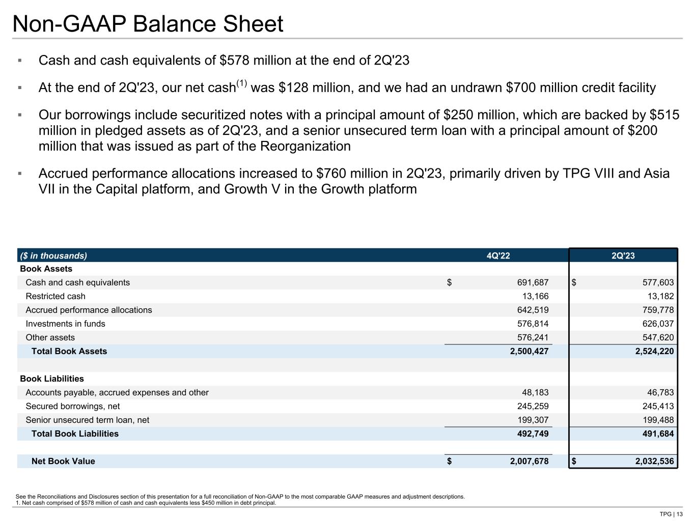 TPG | 12 GAAP Balance Sheet (Unaudited) ▪ Our investments increased $465 million, or 9%, from 4Q'22 to 2Q'23, mainly driven by a 6% increase in the value of our portfolio companies for 2Q'23 YTD ▪ Cash decreased to $894 million in 2Q'23 primarily due to the distribution of proceeds received 1. Includes TPG Inc. Class A and B common stock as well as additional paid-in-capital and retained earnings. ($ in thousands) 4Q'22 2Q'23 Assets Cash and cash equivalents $ 1,107,484 $ 893,560 Investments 5,329,868 5,795,218 Other assets 845,197 817,854 Assets of consolidated Public SPACs 659,189 263,555 Total assets 7,941,738 7,770,187 Liabilities, redeemable equity and equity Liabilities Debt obligations 444,566 444,901 Due to affiliates 139,863 124,764 Accrued performance allocation compensation 3,269,889 3,388,976 Other liabilities 324,261 412,937 Liabilities of consolidated Public SPACs 23,653 9,706 Total liabilities 4,202,232 4,381,284 Redeemable equity attributable to consolidated Public SPACs 653,635 259,370 Equity TPG Inc.(1) 509,672 528,158 Other non-controlling interests 2,576,199 2,601,375 Total equity 3,085,871 3,129,533 Total liabilities, redeemable equity and equity $ 7,941,738 $ 7,770,187