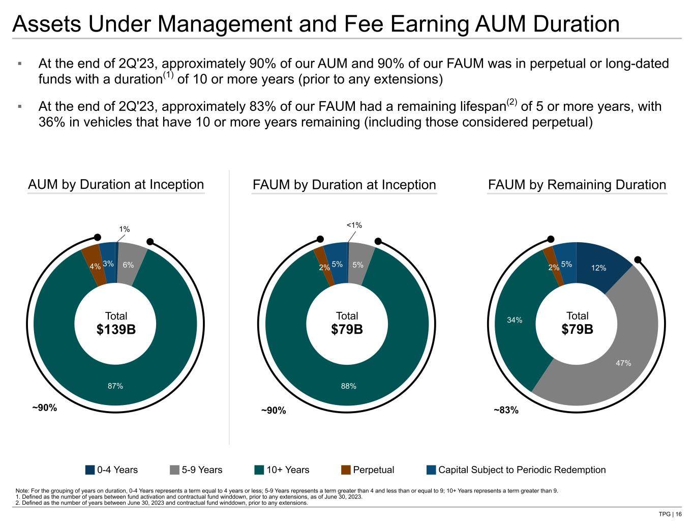 TPG | 41 Definitions After-tax Distributable Earnings (“After-tax DE”) is a non-GAAP performance measure of our distributable earnings after reflecting the impact of income taxes. We use it to assess how income tax expense affects amounts available to be distributed to our Class A common stock holders and Common Unit holders. After-tax DE differs from GAAP net income computed in accordance with GAAP in that it does not include the items described in the definition of DE herein; however, unlike DE it does reflect the impact of income taxes. Income taxes, for purposes of determining After-tax DE, represent the total GAAP income tax expense adjusted to include only the current tax expense (benefit) calculated on GAAP net income before income tax and includes the current payable under our Tax Receivable Agreement, which is recorded within other liabilities in our consolidated statement of financial condition. Further, the current tax expense (benefit) utilized when determining After-tax DE reflects the benefit of deductions available to the Company on certain expense items that are excluded from the underlying calculation of DE, such as equity-based compensation charges. We believe that including the amount currently payable under the Tax Receivable Agreement and utilizing the current income tax expense (benefit), as described above, when determining After-tax DE is meaningful as it increases comparability between periods and more accurately reflects earnings that are available for distribution to shareholders. Assets Under Management (“AUM”) represents the sum of: i) fair value of the investments and financial instruments held by our carry funds (including fund-level asset-related leverage), including our private equity and real estate funds, as well as related co-investment vehicles managed or advised by us, plus the capital that we are entitled to call from investors in those funds and vehicles, pursuant to the terms of their respective capital commitments, net of outstanding leverage associated with subscription-related credit facilities at our carry funds, and including capital commitments to funds that have yet to commence their investment periods; ii) the gross amount of assets (including leverage where applicable) for our mortgage REIT and collateralized fundraising vehicles; iii) the net asset value of our hedge funds; and iv) IPO proceeds held in trust, excluding interest, as well as forward purchase agreements and proceeds associated with the private investment in public equity related to our Public SPACs upon the consummation of a business combination. Our definition of AUM is not based on any definition of AUM that may be set forth in the agreements governing the investment funds, entities, or accounts that we manage or advise, or calculated pursuant to any regulatory definitions. AUM Not Yet Earning Fees represents the amount of capital commitments to TPG investment funds and co-investment vehicles that has not yet been invested or considered active, and as this capital is invested or activated, the fee-paying portion will be included in FAUM. AUM Subject to Fee Earning Growth represents capital commitments that can grow fees when deployed through earning new management fees (AUM Not Yet Earning Fees) or when invested from a higher rate of management fees (FAUM Subject to Step-Up). Available capital is the aggregate amount of unfunded capital commitments that partners have committed to our funds and co-investment vehicles to fund future investments, as well as IPO and forward purchase agreement proceeds associated with our Public SPACs, and private investment in public equity commitments by investors upon the consummation of a business combination associated with our Public SPACs. Available capital is reduced for investments completed using fund-level subscription-related credit facilities; however, it is not reduced for investments that we have committed to make yet remain unfunded at the reporting date. We believe this measure is useful to investors as it provides additional insight into the amount of capital that is available to our investment funds and co-investment vehicles to make future investments. Capital invested is the aggregate amount of capital invested during a given period by TPG’s investment funds, co-investment vehicles and SPACs in conjunction with the completion of a business combination. It excludes hedge fund activity. We believe this measure is useful to investors as it measures capital deployment across TPG. Capital invested includes investments made using investment financing arrangements like credit facilities, as applicable. Capital raised is the aggregate amount of capital commitments raised by our investment funds and co-investment vehicles during a given period, as well as IPO and forward purchase agreements associated with our Public SPACs and private investment in public equity upon the consummation of a business combination associated with one of our Public SPACs. We believe this measure is useful to investors as it measures our access to capital and our ability to grow our management fee base. Catch-up fees, also known as out of period management fees, represent fees paid in any given period that are related to a prior period, usually due to a new limited partner coming into a fund in a subsequent close.