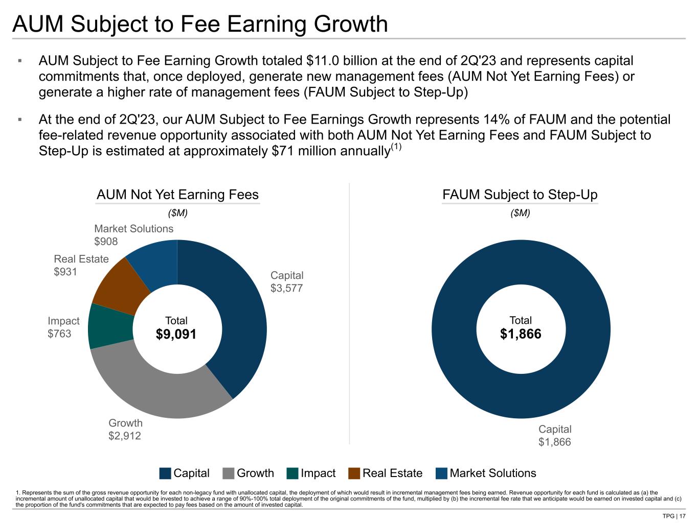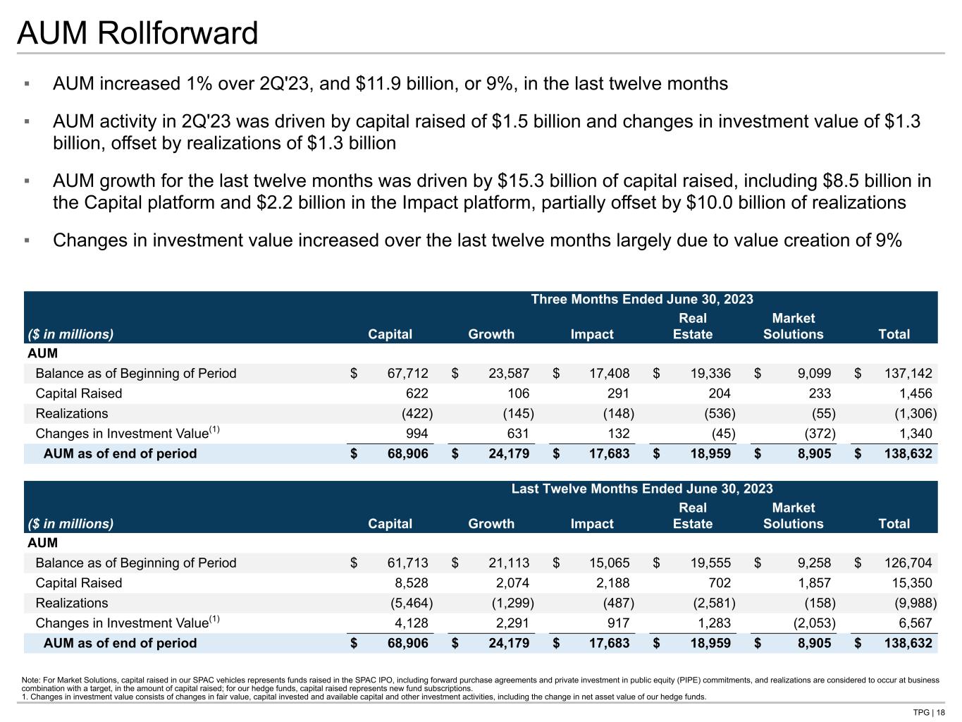 TPG | 17 Capital $1,866 Capital $3,577 Growth $2,912 Impact $763 Real Estate $931 Market Solutions $908 ▪ AUM Subject to Fee Earning Growth totaled $11.0 billion at the end of 2Q'23 and represents capital commitments that, once deployed, generate new management fees (AUM Not Yet Earning Fees) or generate a higher rate of management fees (FAUM Subject to Step-Up) ▪ At the end of 2Q'23, our AUM Subject to Fee Earnings Growth represents 14% of FAUM and the potential fee-related revenue opportunity associated with both AUM Not Yet Earning Fees and FAUM Subject to Step-Up is estimated at approximately $71 million annually(1) AUM Not Yet Earning Fees FAUM Subject to Step-Up ($M) ($M) Total $9,091 Total $1,866 AUM Subject to Fee Earning Growth 1. Represents the sum of the gross revenue opportunity for each non-legacy fund with unallocated capital, the deployment of which would result in incremental management fees being earned. Revenue opportunity for each fund is calculated as (a) the incremental amount of unallocated capital that would be invested to achieve a range of 90%-100% total deployment of the original commitments of the fund, multiplied by (b) the incremental fee rate that we anticipate would be earned on invested capital and (c) the proportion of the fund's commitments that are expected to pay fees based on the amount of invested capital. Capital Growth Impact Real Estate Market Solutions