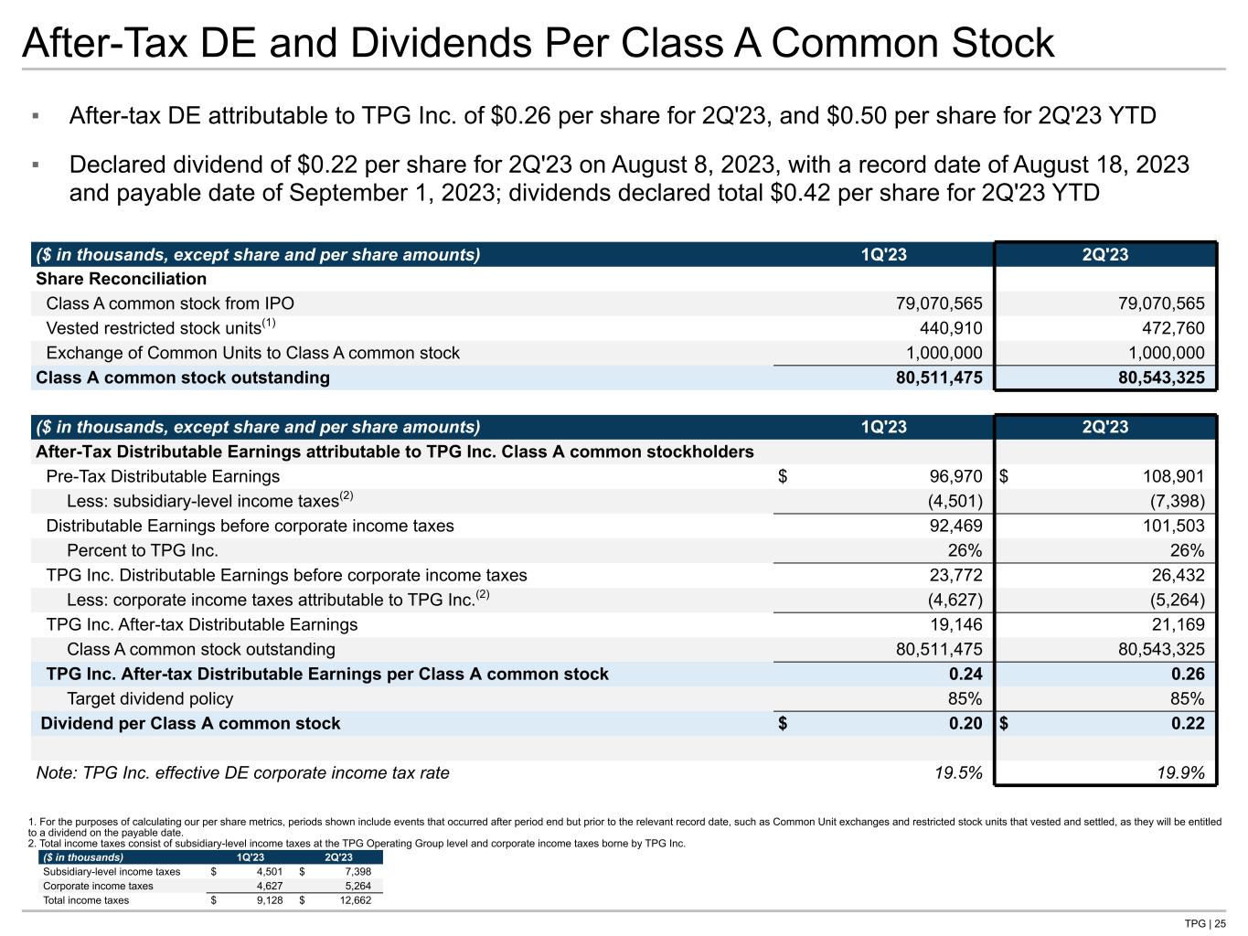 TPG | 25 After-Tax DE and Dividends Per Class A Common Stock ▪ After-tax DE attributable to TPG Inc. of $0.26 per share for 2Q'23, and $0.50 per share for 2Q'23 YTD ▪ Declared dividend of $0.22 per share for 2Q'23 on August 8, 2023, with a record date of August 18, 2023 and payable date of September 1, 2023; dividends declared total $0.42 per share for 2Q'23 YTD ($ in thousands, except share and per share amounts) 1Q'23 2Q'23 Share Reconciliation Class A common stock from IPO 79,070,565 79,070,565 Vested restricted stock units(1) 440,910 472,760 Exchange of Common Units to Class A common stock 1,000,000 1,000,000 Class A common stock outstanding 80,511,475 80,543,325 ($ in thousands, except share and per share amounts) 1Q'23 2Q'23 After-Tax Distributable Earnings attributable to TPG Inc. Class A common stockholders Pre-Tax Distributable Earnings $ 96,970 $ 108,901 Less: subsidiary-level income taxes(2) (4,501) (7,398) Distributable Earnings before corporate income taxes 92,469 101,503 Percent to TPG Inc. 26% 26% TPG Inc. Distributable Earnings before corporate income taxes 23,772 26,432 Less: corporate income taxes attributable to TPG Inc.(2) (4,627) (5,264) TPG Inc. After-tax Distributable Earnings 19,146 21,169 Class A common stock outstanding 80,511,475 80,543,325 TPG Inc. After-tax Distributable Earnings per Class A common stock 0.24 0.26 Target dividend policy 85% 85% Dividend per Class A common stock $ 0.20 $ 0.22 Note: TPG Inc. effective DE corporate income tax rate 19.5% 19.9% 1. For the purposes of calculating our per share metrics, periods shown include events that occurred after period end but prior to the relevant record date, such as Common Unit exchanges and restricted stock units that vested and settled, as they will be entitled to a dividend on the payable date. 2. Total income taxes consist of subsidiary-level income taxes at the TPG Operating Group level and corporate income taxes borne by TPG Inc. ($ in thousands) 1Q'23 2Q'23 Subsidiary-level income taxes $ 4,501 $ 7,398 Corporate income taxes 4,627 5,264 Total income taxes $ 9,128 $ 12,662