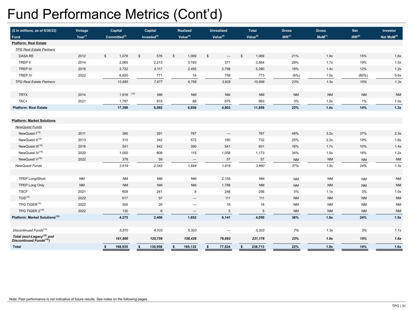 TPG | 31 Fund Performance Metrics (Cont’d) Note: Past performance is not indicative of future results. See notes on the following pages. ($ in millions, as of 6/30/23) Vintage Capital Capital Realized Unrealized Total Gross Gross Net Investor Fund Year(1) Committed(2) Invested(3) Value(4) Value(5) Value(6) IRR(7) MoM(7) IRR(8) Net MoM(9) Platform: Real Estate TPG Real Estate Partners DASA RE 2012 $ 1,078 $ 576 $ 1,069 $ — $ 1,069 21% 1.9x 15% 1.6x TREP II 2014 2,065 2,213 3,193 371 3,564 28% 1.7x 19% 1.5x TREP III 2018 3,722 4,117 2,492 2,798 5,290 18% 1.4x 12% 1.2x TREP IV 2022 6,820 771 14 759 773 (6%) 1.0x (60%) 0.6x TPG Real Estate Partners 13,685 7,677 6,768 3,928 10,696 23% 1.5x 15% 1.3x TRTX 2014 1,916 (14) NM NM NM NM NM NM NM NM TAC+ 2021 1,797 915 88 875 963 3% 1.0x 1% 1.0x Platform: Real Estate 17,398 8,592 6,856 4,803 11,659 22% 1.4x 14% 1.3x Platform: Market Solutions NewQuest Funds NewQuest I(18) 2011 390 291 767 — 767 48% 3.2x 37% 2.3x NewQuest II(18) 2013 310 342 572 160 732 25% 2.2x 19% 1.8x NewQuest III(18) 2016 541 542 390 541 931 16% 1.7x 10% 1.4x NewQuest IV(18) 2020 1,000 808 115 1,058 1,173 34% 1.5x 18% 1.2x NewQuest V(18) 2022 378 59 — 57 57 NM NM NM NM NewQuest Funds 2,619 2,042 1,844 1,816 3,660 37% 1.9x 24% 1.5x TPEP Long/Short NM NM NM NM 2,155 NM NM NM NM NM TPEP Long Only NM NM NM NM 1,788 NM NM NM NM NM TSCF 2021 609 241 8 248 256 5% 1.1x 3% 1.0x TGS(18) 2022 617 97 — 111 111 NM NM NM NM TPG TIGER(18) 2022 300 20 — 18 18 NM NM NM NM TPG TIGER 2(18) 2022 130 6 — 5 5 NM NM NM NM Platform: Market Solutions(12) 4,275 2,406 1,852 6,141 4,050 36% 1.8x 24% 1.5x Discontinued Funds(16) 5,870 4,103 5,303 — 5,303 7% 1.3x 3% 1.1x Total (excl-Legacy(15) and Discontinued Funds(16)) 161,800 125,759 158,426 76,693 231,176 23% 1.9x 15% 1.6x Total $ 168,935 $ 130,958 $ 165,132 $ 77,524 $ 238,713 22% 1.9x 14% 1.6x
