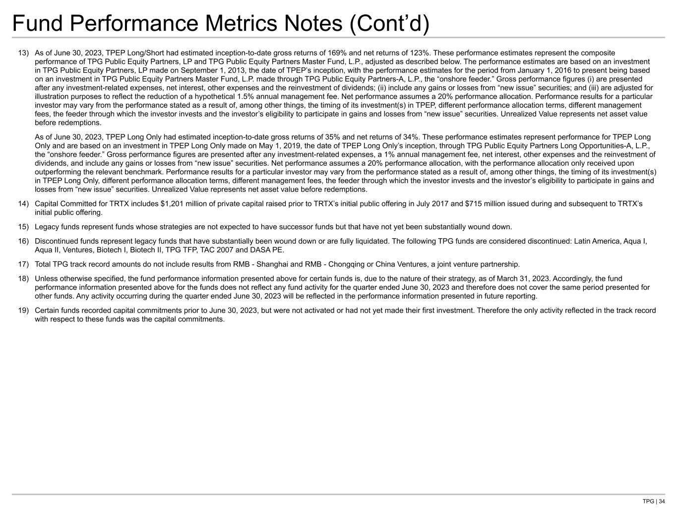 TPG | 33 Fund Performance Metrics Notes (Cont’d) 8) Net IRR represents the compound annualized return rate (i.e., the implied discount rate) of a fund, which is calculated using investor cash flows in the fund, including cash received from capital called from investors, cash distributed to investors and the investors’ ending capital balances as of the quarter end. Net IRR is the discount rate at which (i) the present value of all capital contributed by investors to the fund (which excludes, for the avoidance of doubt, any amounts borrowed by the fund in lieu of calling capital) is equal to (ii) the present value of all cash distributed to investors and the investors’ ending capital balances. Net IRR reflects the impact of management fees, fund expenses (including interest expense arising from amounts borrowed under the fund’s credit facility) and performance allocations, but does not reflect the effect of taxes borne, or to be borne, by investors. The Net IRR calculation assumes that investor contributions and distributions occurred in the middle of the month in which they were made. The Net IRR calculation excludes amounts attributable to the general partner, its affiliated entities and “friends of the firm” entities that generally pay no or reduced management fees and performance allocations. Net IRR represents an average return for all included investors, including those that pay reduced management fees and/or carried interest, and does not necessarily reflect the actual return of any particular investor. An actual investor that paid management fees and/or carried interest at rates higher than the average would have a lower individual Net IRR. In addition, management fees, fund expenses and carried interest differ from fund to fund, and therefore the impact of such amounts in a particular fund should not be assumed to reflect the impact such amounts would have on any other fund, including in respect of any fund in which a prospective investor is considering an investment. Net IRR for a platform does not include the cash flows for funds that are not currently presenting a Net IRR to their investors. 9) Investor Net MoM, with respect to a fund, represents the multiple-of-money on contributions to the fund by investors. Investor Net MoM is calculated as the sum of cash distributed to investors and the investors’ ending capital balances as of the quarter end, divided by the amount of capital contributed to the fund by investors (which amount excludes, for the avoidance of doubt, any amounts borrowed by the fund in lieu of calling capital). Investor Net MoM reflects the impact of management fees, fund expenses (including interest expense arising from amounts borrowed under the fund’s credit facility) and performance allocations, but does not reflect the effect of taxes borne, or to be borne, by investors. The Investor Net MoM calculation excludes amounts attributable to the fund’s general partner, its affiliated entities and “friends of the firm” entities that generally pay no or reduced management fees and performance allocations. Investor Net MoM represents an average multiple-of-money for all included investors and does not necessarily reflect the actual return of any particular investor. An actual investor that paid management fees and/or carried interest at rates higher than the average would have a lower individual net MoM. In addition, management fees, fund expenses and carried interest differ from fund to fund, and therefore the impact of such amounts in a particular fund should not be assumed to reflect the impact such amounts would have on any other fund, including in respect of any fund in which a prospective investor is considering an investment. 10) “NM” signifies that the relevant data would not be meaningful. Performance metrics are generally deemed “NM” for an investment or group of investments when, among other reasons, a fund is in its initial period of operation, or the holding period of the investment or investments is in its initial period of holding, which in each case we typically determine to mean up to twelve months, or the investment or investments do not have a significant cost basis. IRR metrics are generally deemed “NM” prior to the fund calling capital for the applicable investment(s). 11) Amounts shown are in US dollars. When an investment is made in another currency, (i) Capital Invested is calculated using the exchange rate at the time of the investment, (ii) Unrealized Value is calculated using the exchange rate at the quarter end and (iii) Realized Value reflects actual US dollar proceeds to the fund. A fund may enter into foreign currency hedges in connection with an investment made in a currency other than US dollars. Capital Invested with respect to such investment includes the cost of establishing foreign currency hedges. For hedges entered into to facilitate payment of the purchase price for an investment, gains or losses on such hedges are applied, respectively, to reduce or increase Capital Invested with respect to such investment. Thereafter during the life of such investment, (i) Capital Invested includes any inception-to-date net realized losses on such hedges, (ii) Unrealized Value includes the unrealized fair value of such hedges as estimated by the general partner and (iii) Realized Value includes any inception-to-date net realized gain on such hedges. For hedges entered into in anticipation of receipt of exit proceeds, (i) losses on such hedges are first applied to offset exit proceeds, with any remaining losses applied to increase Capital Invested and (ii) gains on such hedges are first applied to reverse any inception-to-date net realized losses that were previously included in Capital Invested, with any remaining gains applied to increase Realized Value. Where a foreign currency hedge is implemented as part of the investment structure below the fund, such hedge is similarly reflected in Capital Invested a
