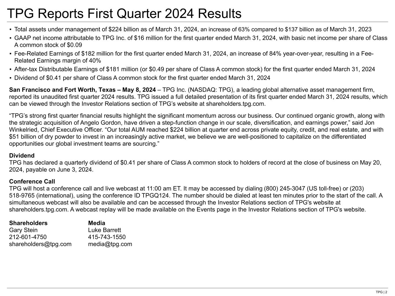 TPG | 2 ▪ Total assets under management of $224 billion as of March 31, 2024, an increase of 63% compared to $137 billion as of March 31, 2023 ▪ GAAP net income attributable to TPG Inc. of $16 million for the first quarter ended March 31, 2024, with basic net income per share of Class A common stock of $0.09 ▪ Fee-Related Earnings of $182 million for the first quarter ended March 31, 2024, an increase of 84% year-over-year, resulting in a Fee- Related Earnings margin of 40% ▪ After-tax Distributable Earnings of $181 million (or $0.49 per share of Class A common stock) for the first quarter ended March 31, 2024 ▪ Dividend of $0.41 per share of Class A common stock for the first quarter ended March 31, 2024 San Francisco and Fort Worth, Texas – May 8, 2024 – TPG Inc. (NASDAQ: TPG), a leading global alternative asset management firm, reported its unaudited first quarter 2024 results. TPG issued a full detailed presentation of its first quarter ended March 31, 2024 results, which can be viewed through the Investor Relations section of TPG’s website at shareholders.tpg.com. “TPG’s strong first quarter financial results highlight the significant momentum across our business. Our continued organic growth, along with the strategic acquisition of Angelo Gordon, have driven a step-function change in our scale, diversification, and earnings power,” said Jon Winkelried, Chief Executive Officer. “Our total AUM reached $224 billion at quarter end across private equity, credit, and real estate, and with $51 billion of dry powder to invest in an increasingly active market, we believe we are well-positioned to capitalize on the differentiated opportunities our global investment teams are sourcing.” Dividend TPG has declared a quarterly dividend of $0.41 per share of Class A common stock to holders of record at the close of business on May 20, 2024, payable on June 3, 2024. Conference Call TPG will host a conference call and live webcast at 11:00 am ET. It may be accessed by dialing (800) 245-3047 (US toll-free) or (203) 518-9765 (international), using the conference ID TPGQ124. The number should be dialed at least ten minutes prior to the start of the call. A simultaneous webcast will also be available and can be accessed through the Investor Relations section of TPG's website at shareholders.tpg.com. A webcast replay will be made available on the Events page in the Investor Relations section of TPG's website. Shareholders Media Gary Stein Luke Barrett 212-601-4750 415-743-1550 shareholders@tpg.com media@tpg.com TPG Reports First Quarter 2024 Results