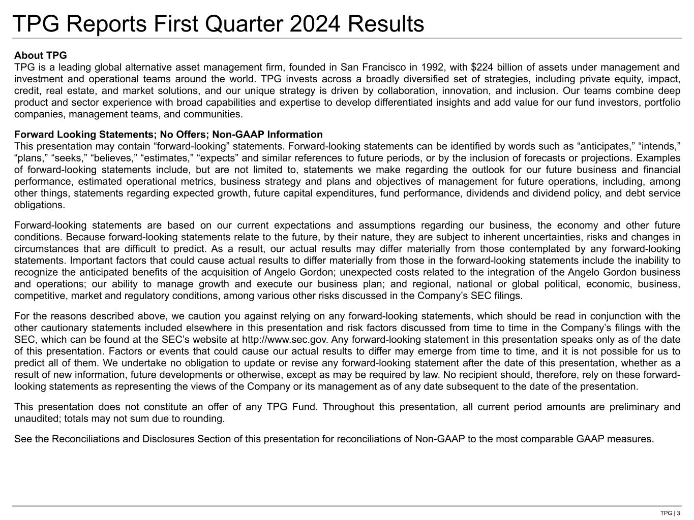 TPG | 3 TPG Reports First Quarter 2024 Results About TPG TPG is a leading global alternative asset management firm, founded in San Francisco in 1992, with $224 billion of assets under management and investment and operational teams around the world. TPG invests across a broadly diversified set of strategies, including private equity, impact, credit, real estate, and market solutions, and our unique strategy is driven by collaboration, innovation, and inclusion. Our teams combine deep product and sector experience with broad capabilities and expertise to develop differentiated insights and add value for our fund investors, portfolio companies, management teams, and communities. Forward Looking Statements; No Offers; Non-GAAP Information This presentation may contain “forward-looking” statements. Forward-looking statements can be identified by words such as “anticipates,” “intends,” “plans,” “seeks,” “believes,” “estimates,” “expects” and similar references to future periods, or by the inclusion of forecasts or projections. Examples of forward-looking statements include, but are not limited to, statements we make regarding the outlook for our future business and financial performance, estimated operational metrics, business strategy and plans and objectives of management for future operations, including, among other things, statements regarding expected growth, future capital expenditures, fund performance, dividends and dividend policy, and debt service obligations. Forward-looking statements are based on our current expectations and assumptions regarding our business, the economy and other future conditions. Because forward-looking statements relate to the future, by their nature, they are subject to inherent uncertainties, risks and changes in circumstances that are difficult to predict. As a result, our actual results may differ materially from those contemplated by any forward-looking statements. Important factors that could cause actual results to differ materially from those in the forward-looking statements include the inability to recognize the anticipated benefits of the acquisition of Angelo Gordon; unexpected costs related to the integration of the Angelo Gordon business and operations; our ability to manage growth and execute our business plan; and regional, national or global political, economic, business, competitive, market and regulatory conditions, among various other risks discussed in the Company’s SEC filings. For the reasons described above, we caution you against relying on any forward-looking statements, which should be read in conjunction with the other cautionary statements included elsewhere in this presentation and risk factors discussed from time to time in the Company’s filings with the SEC, which can be found at the SEC’s website at http://www.sec.gov. Any forward-looking statement in this presentation speaks only as of the date of this presentation. Factors or events that could cause our actual results to differ may emerge from time to time, and it is not possible for us to predict all of them. We undertake no obligation to update or revise any forward-looking statement after the date of this presentation, whether as a result of new information, future developments or otherwise, except as may be required by law. No recipient should, therefore, rely on these forward- looking statements as representing the views of the Company or its management as of any date subsequent to the date of the presentation. This presentation does not constitute an offer of any TPG Fund. Throughout this presentation, all current period amounts are preliminary and unaudited; totals may not sum due to rounding. See the Reconciliations and Disclosures Section of this presentation for reconciliations of Non-GAAP to the most comparable GAAP measures.