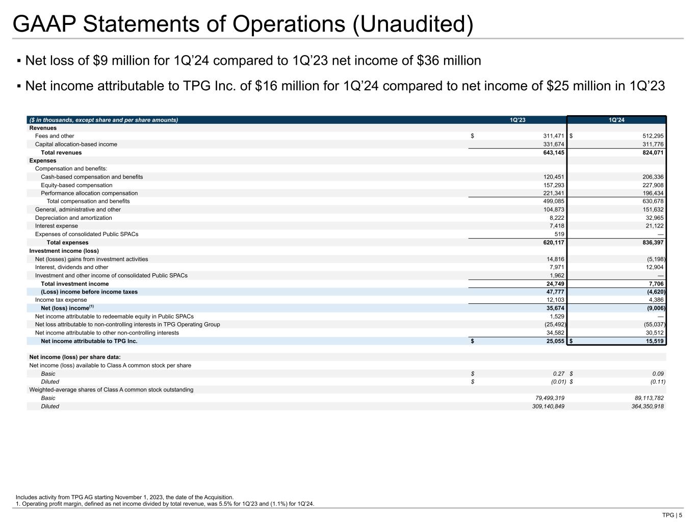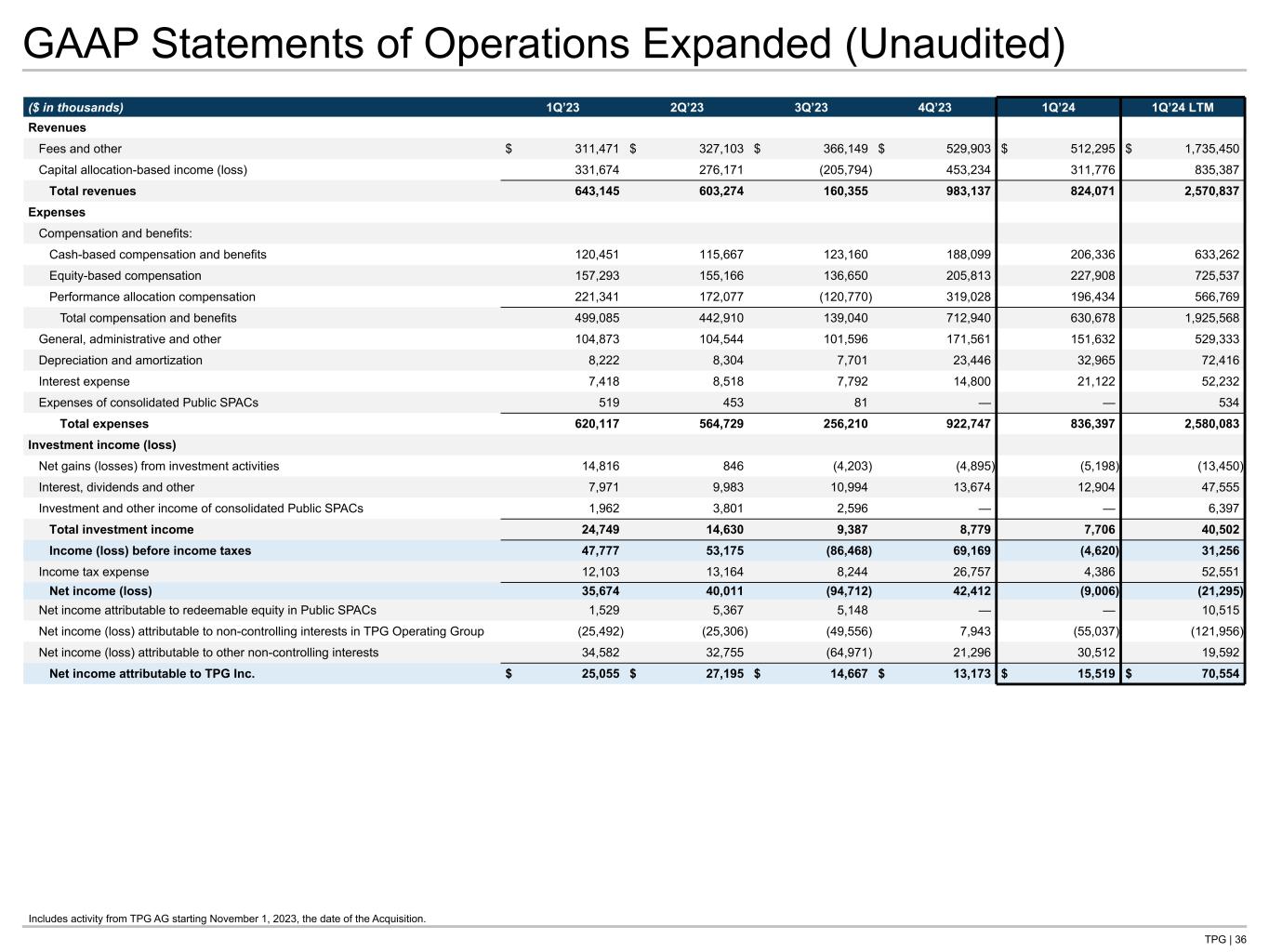 TPG | 36 GAAP Statements of Operations Expanded (Unaudited) ($ in thousands) 1Q’23 2Q’23 3Q’23 4Q’23 1Q’24 1Q’24 LTM Revenues Fees and other $ 311,471 $ 327,103 $ 366,149 $ 529,903 $ 512,295 $ 1,735,450 Capital allocation-based income (loss) 331,674 276,171 (205,794) 453,234 311,776 835,387 Total revenues 643,145 603,274 160,355 983,137 824,071 2,570,837 Expenses Compensation and benefits: Cash-based compensation and benefits 120,451 115,667 123,160 188,099 206,336 633,262 Equity-based compensation 157,293 155,166 136,650 205,813 227,908 725,537 Performance allocation compensation 221,341 172,077 (120,770) 319,028 196,434 566,769 Total compensation and benefits 499,085 442,910 139,040 712,940 630,678 1,925,568 General, administrative and other 104,873 104,544 101,596 171,561 151,632 529,333 Depreciation and amortization 8,222 8,304 7,701 23,446 32,965 72,416 Interest expense 7,418 8,518 7,792 14,800 21,122 52,232 Expenses of consolidated Public SPACs 519 453 81 — — 534 Total expenses 620,117 564,729 256,210 922,747 836,397 2,580,083 Investment income (loss) Net gains (losses) from investment activities 14,816 846 (4,203) (4,895) (5,198) (13,450) Interest, dividends and other 7,971 9,983 10,994 13,674 12,904 47,555 Investment and other income of consolidated Public SPACs 1,962 3,801 2,596 — — 6,397 Total investment income 24,749 14,630 9,387 8,779 7,706 40,502 Income (loss) before income taxes 47,777 53,175 (86,468) 69,169 (4,620) 31,256 Income tax expense 12,103 13,164 8,244 26,757 4,386 52,551 Net income (loss) 35,674 40,011 (94,712) 42,412 (9,006) (21,295) Net income attributable to redeemable equity in Public SPACs 1,529 5,367 5,148 — — 10,515 Net income (loss) attributable to non-controlling interests in TPG Operating Group (25,492) (25,306) (49,556) 7,943 (55,037) (121,956) Net income (loss) attributable to other non-controlling interests 34,582 32,755 (64,971) 21,296 30,512 19,592 Net income attributable to TPG Inc. $ 25,055 $ 27,195 $ 14,667 $ 13,173 $ 15,519 $ 70,554 Includes activity from TPG AG starting November 1, 2023, the date of the Acquisition.
