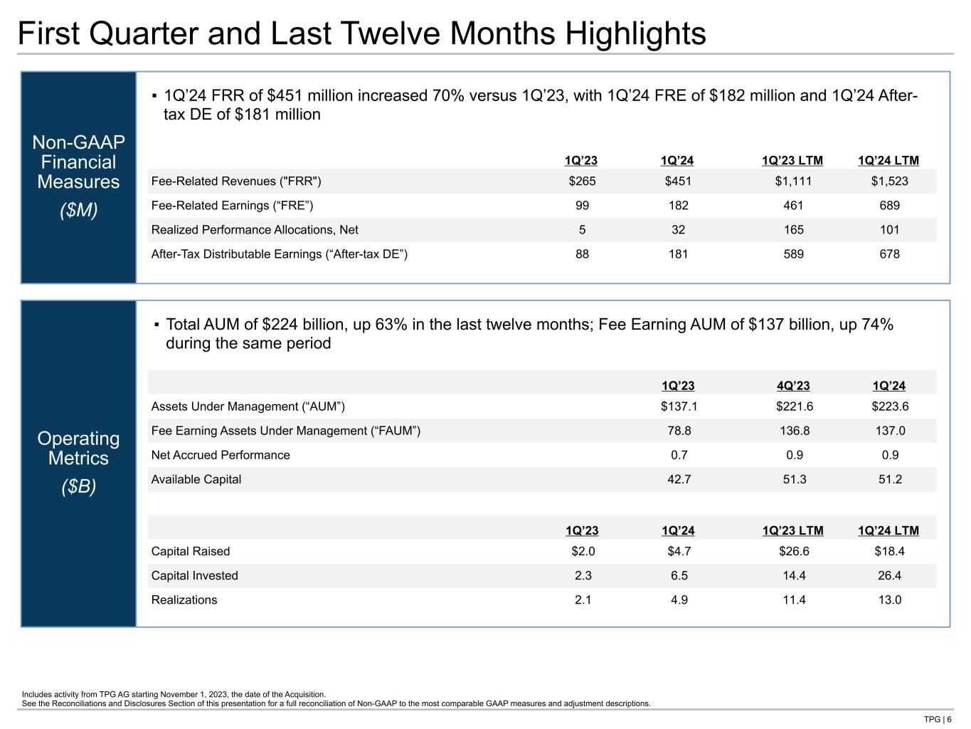 TPG | 5 ▪ Net loss of $9 million for 1Q’24 compared to 1Q’23 net income of $36 million ▪ Net income attributable to TPG Inc. of $16 million for 1Q’24 compared to net income of $25 million in 1Q’23 GAAP Statements of Operations (Unaudited) Includes activity from TPG AG starting November 1, 2023, the date of the Acquisition. 1. Operating profit margin, defined as net income divided by total revenue, was 5.5% for 1Q’23 and (1.1%) for 1Q’24. ($ in thousands, except share and per share amounts) 1Q’23 1Q’24 Revenues Fees and other $ 311,471 $ 512,295 Capital allocation-based income 331,674 311,776 Total revenues 643,145 824,071 Expenses Compensation and benefits: Cash-based compensation and benefits 120,451 206,336 Equity-based compensation 157,293 227,908 Performance allocation compensation 221,341 196,434 Total compensation and benefits 499,085 630,678 General, administrative and other 104,873 151,632 Depreciation and amortization 8,222 32,965 Interest expense 7,418 21,122 Expenses of consolidated Public SPACs 519 — Total expenses 620,117 836,397 Investment income (loss) Net (losses) gains from investment activities 14,816 (5,198) Interest, dividends and other 7,971 12,904 Investment and other income of consolidated Public SPACs 1,962 — Total investment income 24,749 7,706 (Loss) income before income taxes 47,777 (4,620) Income tax expense 12,103 4,386 Net (loss) income(1) 35,674 (9,006) Net income attributable to redeemable equity in Public SPACs 1,529 — Net loss attributable to non-controlling interests in TPG Operating Group (25,492) (55,037) Net income attributable to other non-controlling interests 34,582 30,512 Net income attributable to TPG Inc. $ 25,055 $ 15,519 Net income (loss) per share data: Net income (loss) available to Class A common stock per share Basic $ 0.27 $ 0.09 Diluted $ (0.01) $ (0.11) Weighted-average shares of Class A common stock outstanding Basic 79,499,319 89,113,782 Diluted 309,140,849 364,350,918