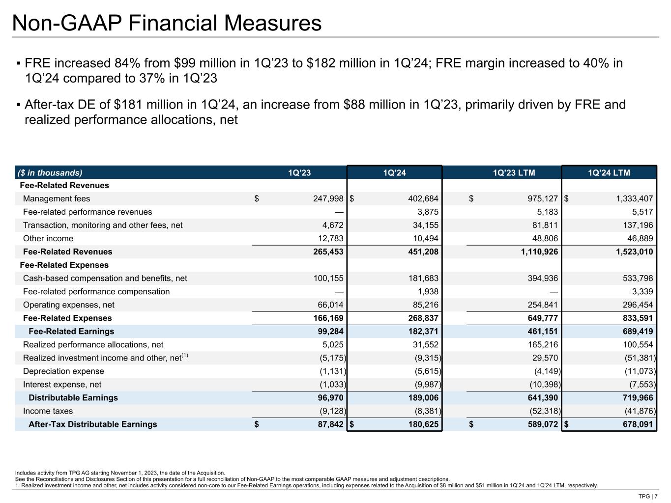 TPG | 6 Operating Metrics ($B) Non-GAAP Financial Measures ($M) First Quarter and Last Twelve Months Highlights 1Q’23 1Q’24 1Q’23 LTM 1Q’24 LTM Fee-Related Revenues ("FRR") $265 $451 $1,111 $1,523 Fee-Related Earnings (“FRE”) 99 182 461 689 Realized Performance Allocations, Net 5 32 165 101 After-Tax Distributable Earnings (“After-tax DE”) 88 181 589 678 1Q’23 4Q’23 1Q’24 Assets Under Management (“AUM”) $137.1 $221.6 $223.6 Fee Earning Assets Under Management (“FAUM”) 78.8 136.8 137.0 Net Accrued Performance 0.7 0.9 0.9 Available Capital 42.7 51.3 51.2 1Q’23 1Q’24 1Q’23 LTM 1Q’24 LTM Capital Raised $2.0 $4.7 $26.6 $18.4 Capital Invested 2.3 6.5 14.4 26.4 Realizations 2.1 4.9 11.4 13.0 ▪ 1Q’24 FRR of $451 million increased 70% versus 1Q’23, with 1Q’24 FRE of $182 million and 1Q’24 After- tax DE of $181 million ▪ Total AUM of $224 billion, up 63% in the last twelve months; Fee Earning AUM of $137 billion, up 74% during the same period Includes activity from TPG AG starting November 1, 2023, the date of the Acquisition. See the Reconciliations and Disclosures Section of this presentation for a full reconciliation of Non-GAAP to the most comparable GAAP measures and adjustment descriptions.