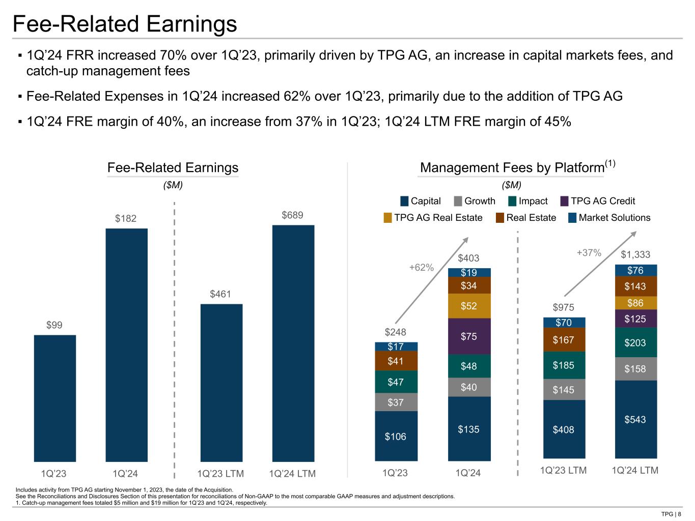 TPG | 7 Non-GAAP Financial Measures ▪ FRE increased 84% from $99 million in 1Q’23 to $182 million in 1Q’24; FRE margin increased to 40% in 1Q’24 compared to 37% in 1Q’23 ▪ After-tax DE of $181 million in 1Q’24, an increase from $88 million in 1Q’23, primarily driven by FRE and realized performance allocations, net Includes activity from TPG AG starting November 1, 2023, the date of the Acquisition. See the Reconciliations and Disclosures Section of this presentation for a full reconciliation of Non-GAAP to the most comparable GAAP measures and adjustment descriptions. 1. Realized investment income and other, net includes activity considered non-core to our Fee-Related Earnings operations, including expenses related to the Acquisition of $8 million and $51 million in 1Q’24 and 1Q’24 LTM, respectively. ($ in thousands) 1Q’23 1Q’24 1Q’23 LTM 1Q’24 LTM Fee-Related Revenues Management fees $ 247,998 $ 402,684 $ 975,127 $ 1,333,407 Fee-related performance revenues — 3,875 5,183 5,517 Transaction, monitoring and other fees, net 4,672 34,155 81,811 137,196 Other income 12,783 10,494 48,806 46,889 Fee-Related Revenues 265,453 451,208 1,110,926 1,523,010 Fee-Related Expenses Cash-based compensation and benefits, net 100,155 181,683 394,936 533,798 Fee-related performance compensation — 1,938 — 3,339 Operating expenses, net 66,014 85,216 254,841 296,454 Fee-Related Expenses 166,169 268,837 649,777 833,591 Fee-Related Earnings 99,284 182,371 461,151 689,419 Realized performance allocations, net 5,025 31,552 165,216 100,554 Realized investment income and other, net(1) (5,175) (9,315) 29,570 (51,381) Depreciation expense (1,131) (5,615) (4,149) (11,073) Interest expense, net (1,033) (9,987) (10,398) (7,553) Distributable Earnings 96,970 189,006 641,390 719,966 Income taxes (9,128) (8,381) (52,318) (41,876) After-Tax Distributable Earnings $ 87,842 $ 180,625 $ 589,072 $ 678,091